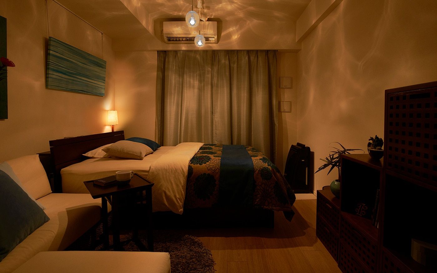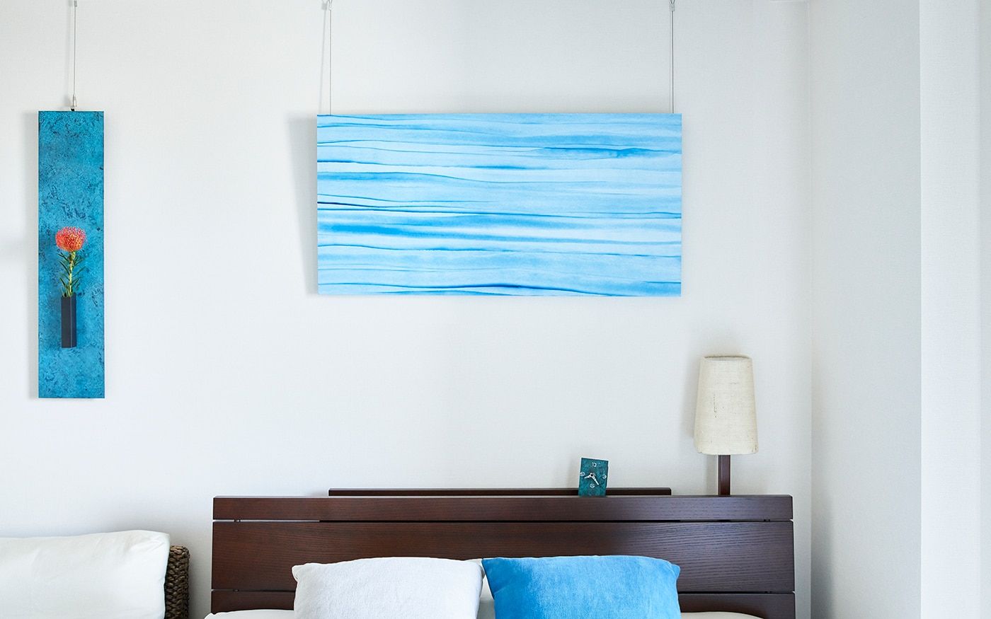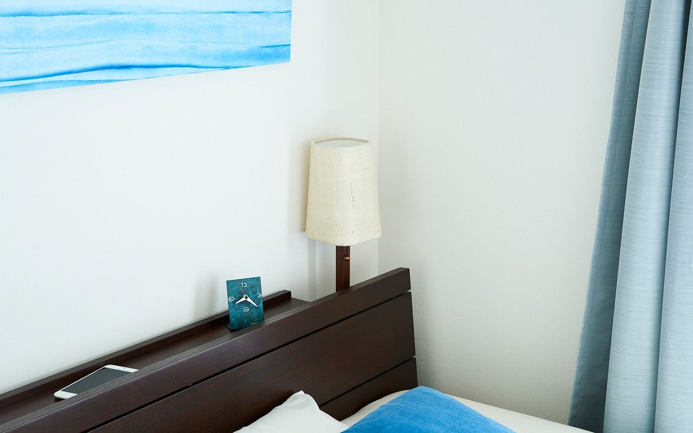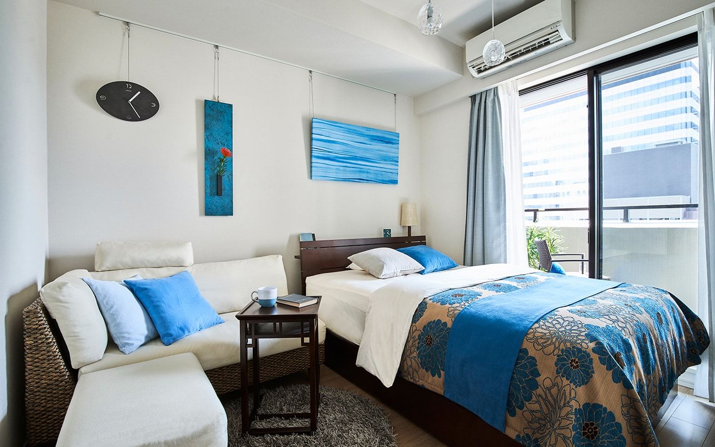 リゾートの雰囲気を演出しやすいヒヤシンス素材を使用したソファを採用して、ホテルライクな空間に。コンパクト設計のためワンルームでも配置しやすく、くつろぎ方のバリエーションを増やしてくれます。また、主要な家具の他にも、インテリア小物で空間にアクセントを入れました。壁を鮮やかにしてくれる壁面装飾には、波打ち際を連想させるブルーのアートパネルと、日本の伝統工芸を用いた美しい発色の一輪挿しを使用。