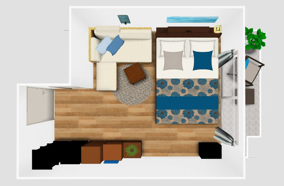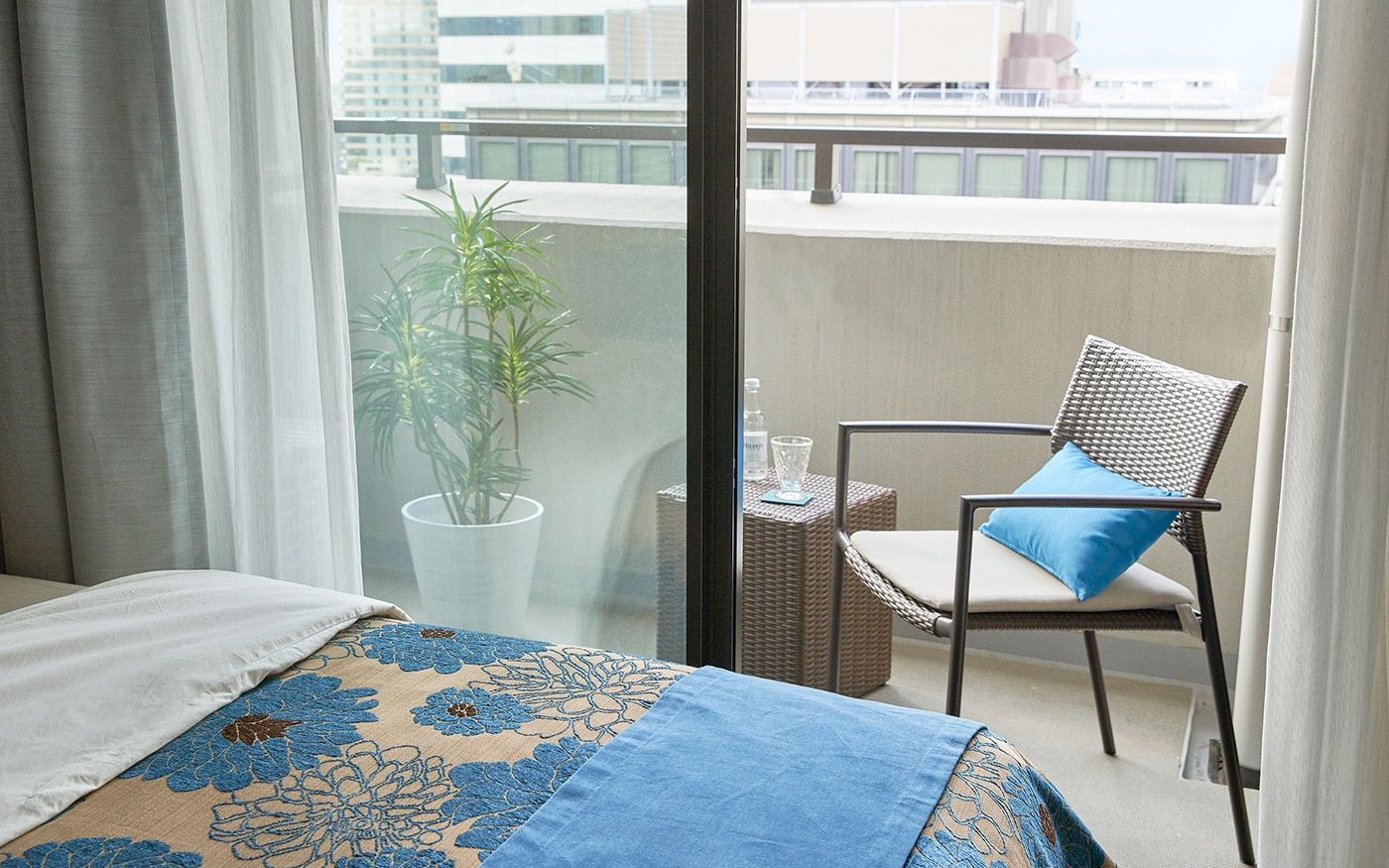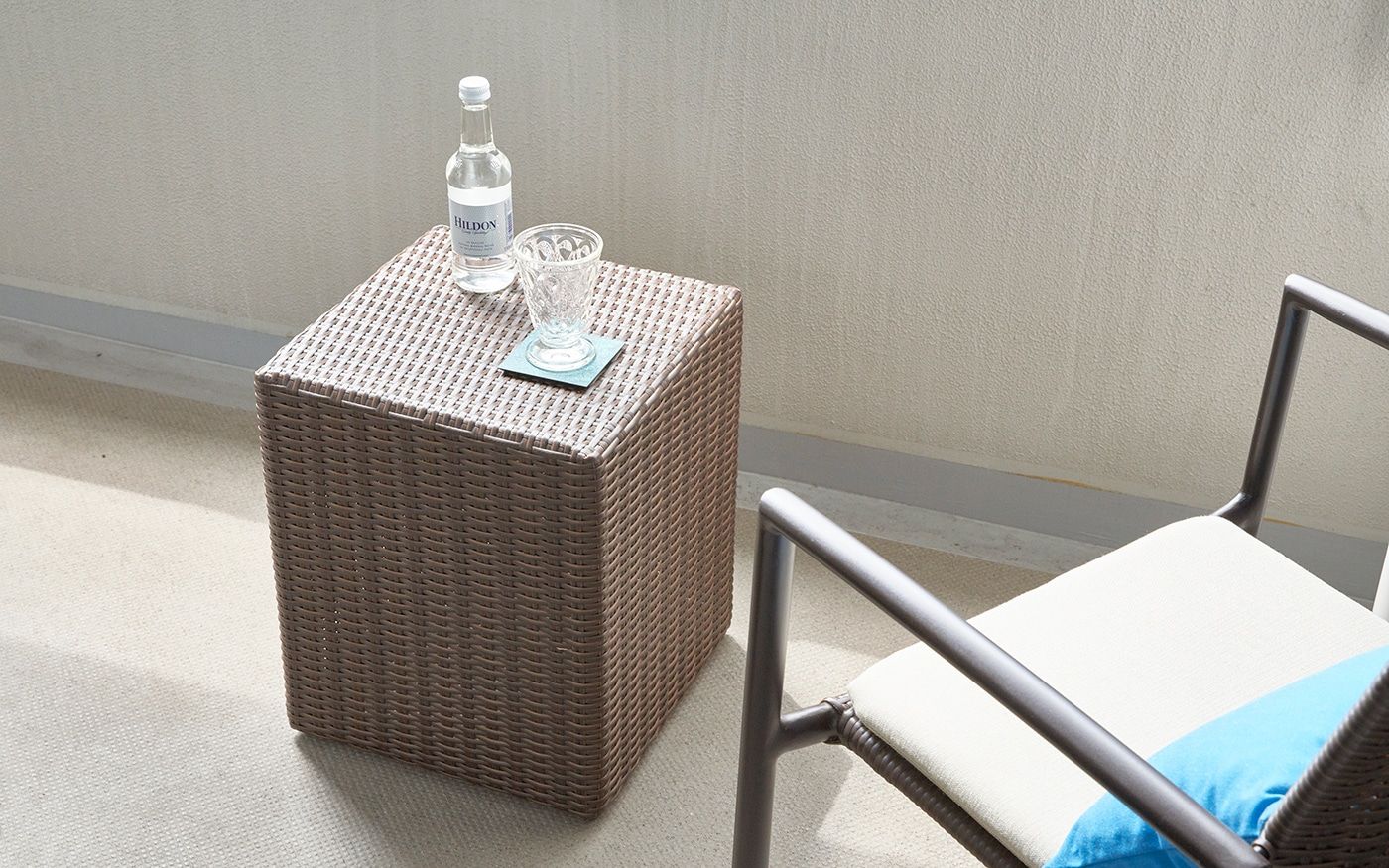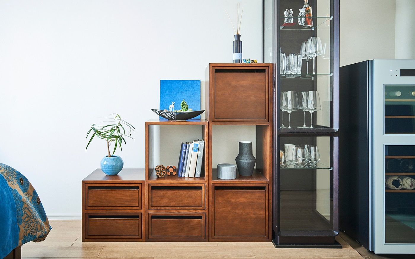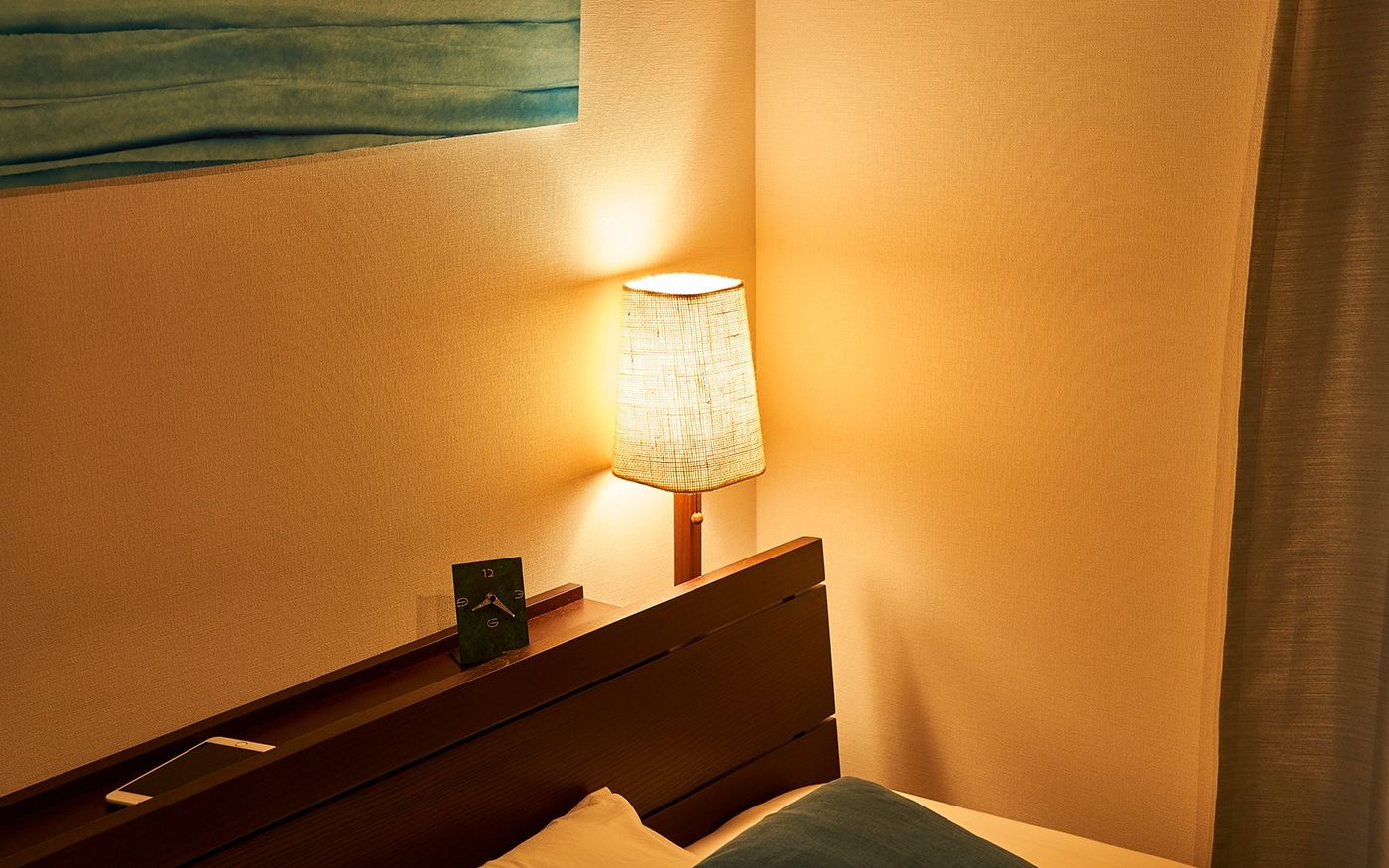 リゾートの雰囲気を演出しやすいヒヤシンス素材を使用したソファを採用して、ホテルライクな空間に。コンパクト設計のためワンルームでも配置しやすく、くつろぎ方のバリエーションを増やしてくれます。また、主要な家具の他にも、インテリア小物で空間にアクセントを入れました。壁を鮮やかにしてくれる壁面装飾には、波打ち際を連想させるブルーのアートパネルと、日本の伝統工芸を用いた美しい発色の一輪挿しを使用。