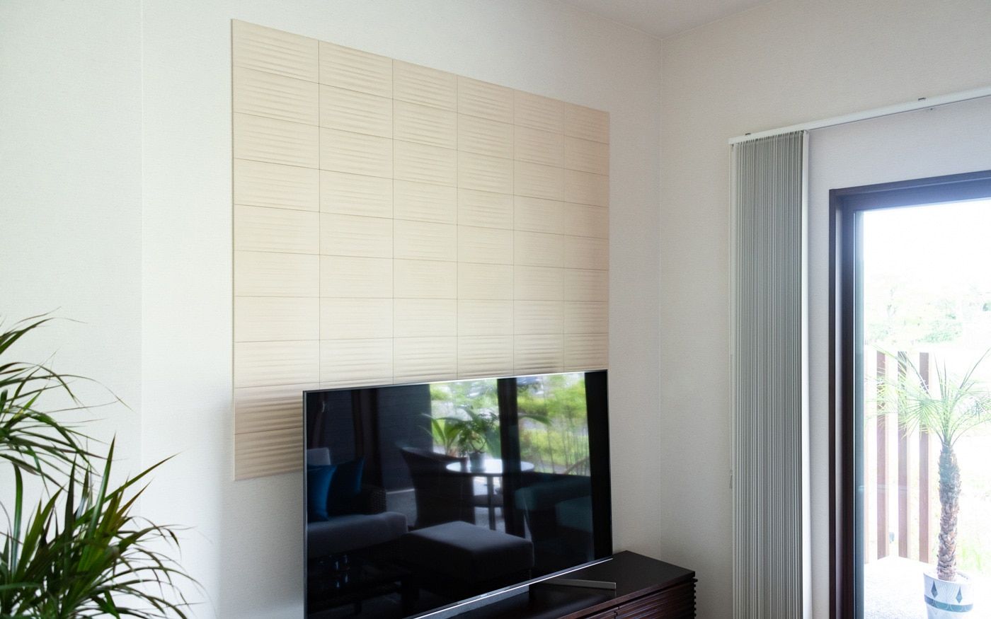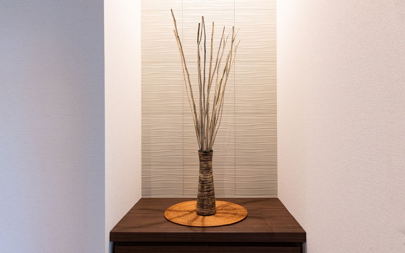 リゾートホテルの空間に採用されている、上品でおしゃれな内装を連想させるような、アクセントとなるポイントを取り入れた今回の新築一戸建て。壁面のクロスやタイル調のエコカラット、バーチカルブラインドが空間の完成度を高めています。