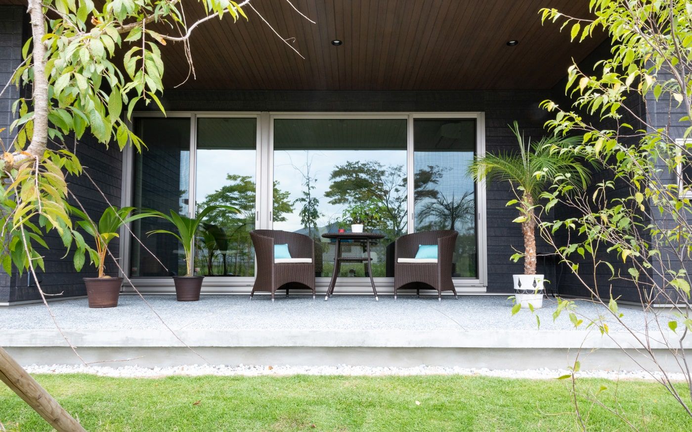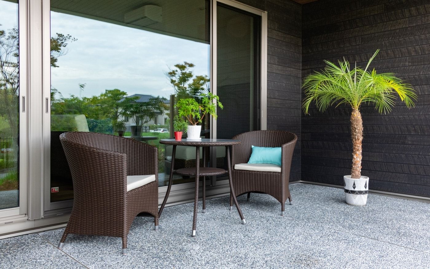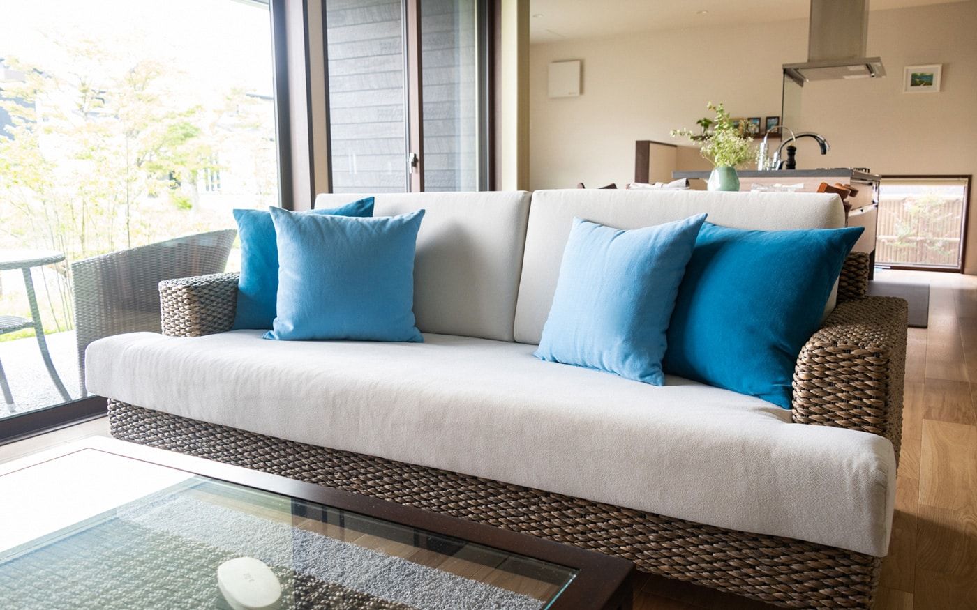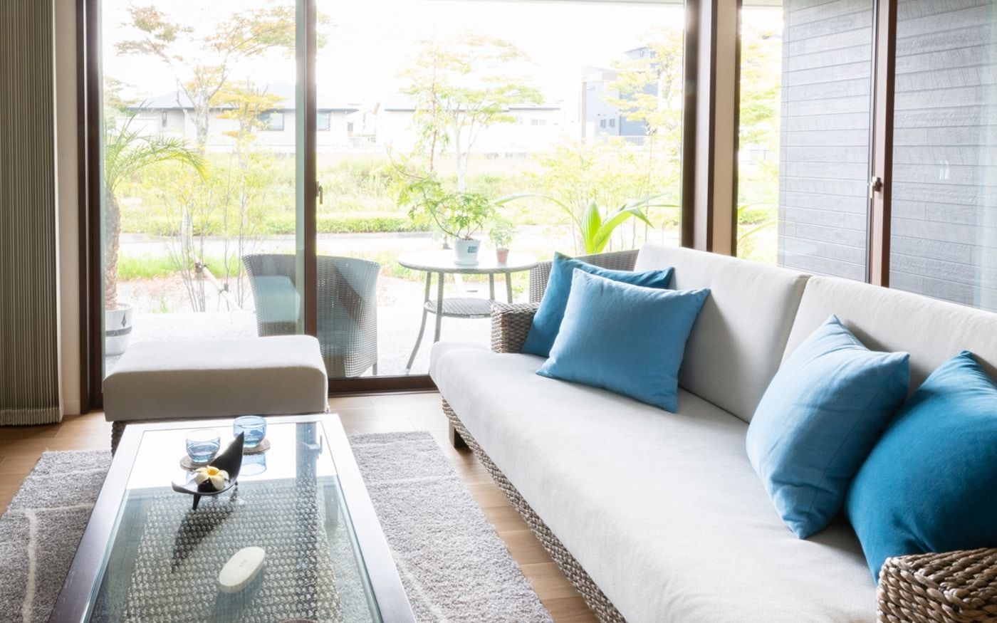 アジアンリゾートの爽やかな風景を再現したコーディネートは、ブルーカラーのファブリックや、リゾート感たっぷりの屋外用家具、リラクシーなグリーンがポイントです。特にリゾートライクな上質な大人の時間を演出しました。