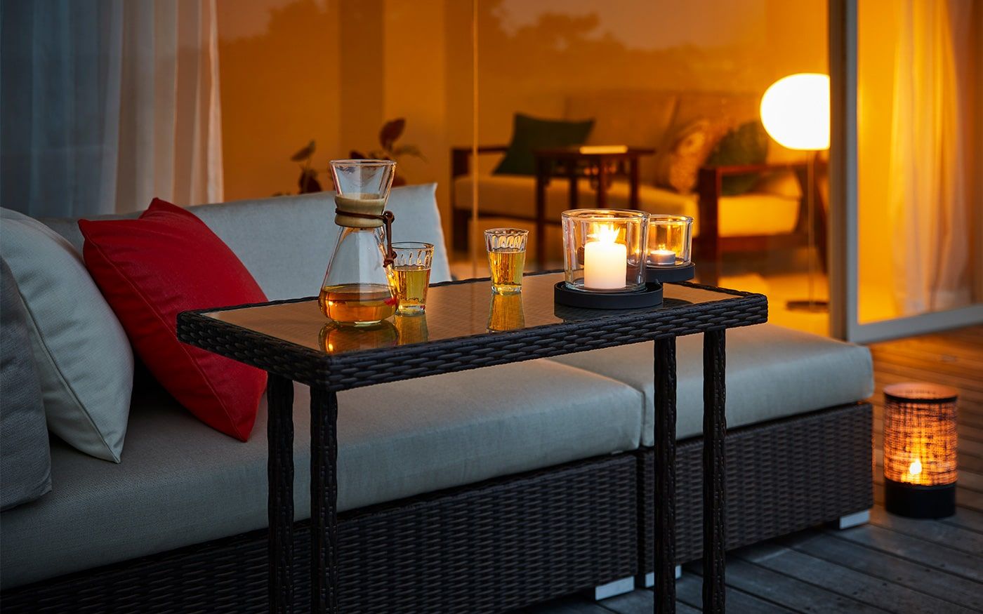 沖縄のようなリゾートでは一日のうつろいを楽しみやすい環境でも有ります。もし、自宅に心地よい屋外空間がある時は、贅沢な空気感の中で過ごせる屋外用ソファとテーブルを置いてみましょう。非日常感のある赤色のクッションをプラスして周りにキャンドルを灯せば、陽の落ち行く景色を望みながら極上の時間を味わえます。