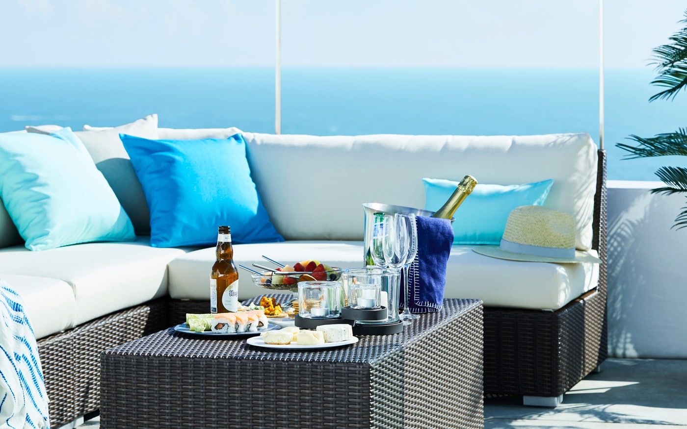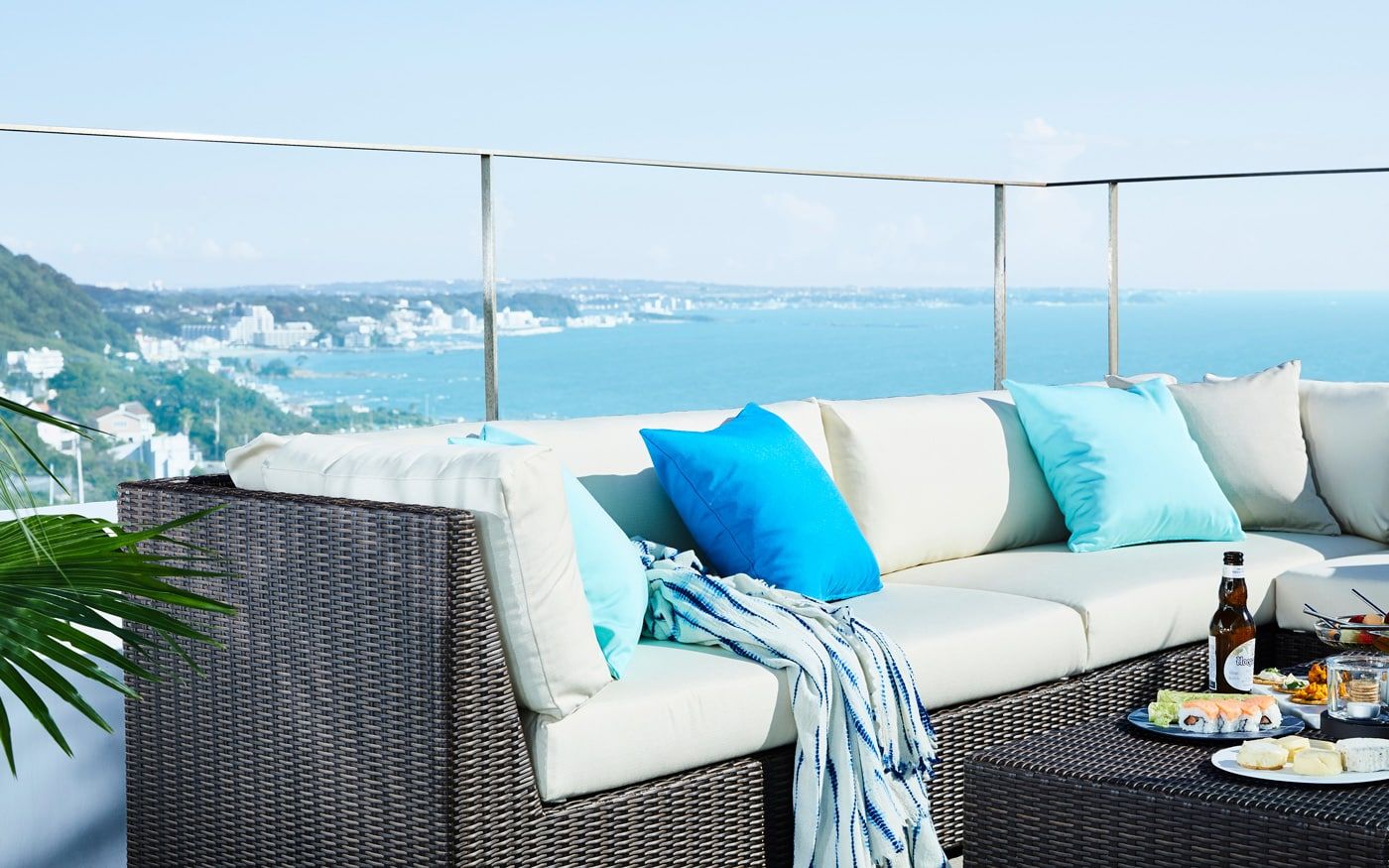 自宅の屋外空間を空や海を感じるようなイメージに仕上げたい時は、屋外用家具にブルーを添えたコーディネートを取り入れてみましょう。屋外用のソファセットを主役にして、クッションカバーには爽やかなコバルトブルーや、優しいパステルブルーを組み合わせれば青に包まれたリゾート空間に仕上がります。