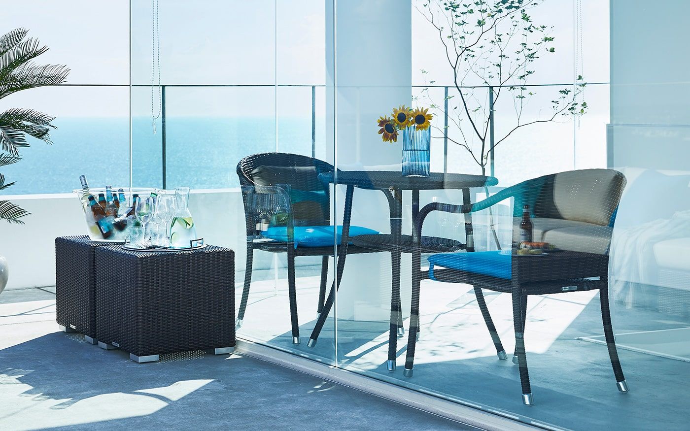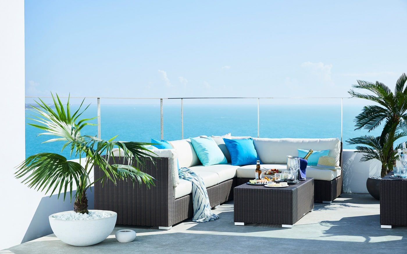 自宅の屋外空間を空や海を感じるようなイメージに仕上げたい時は、屋外用家具にブルーを添えたコーディネートを取り入れてみましょう。屋外用のソファセットを主役にして、クッションカバーには爽やかなコバルトブルーや、優しいパステルブルーを組み合わせれば青に包まれたリゾート空間に仕上がります。