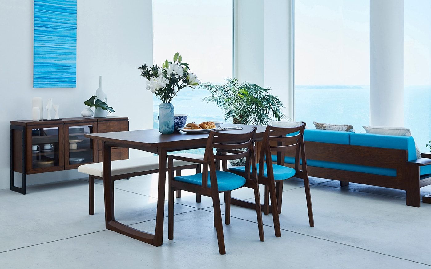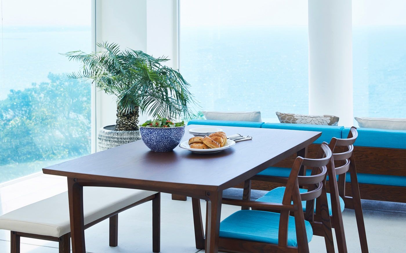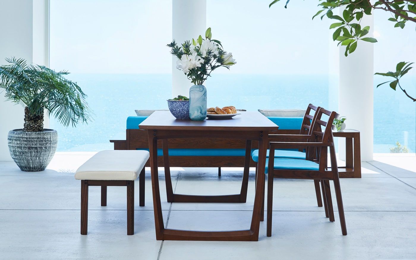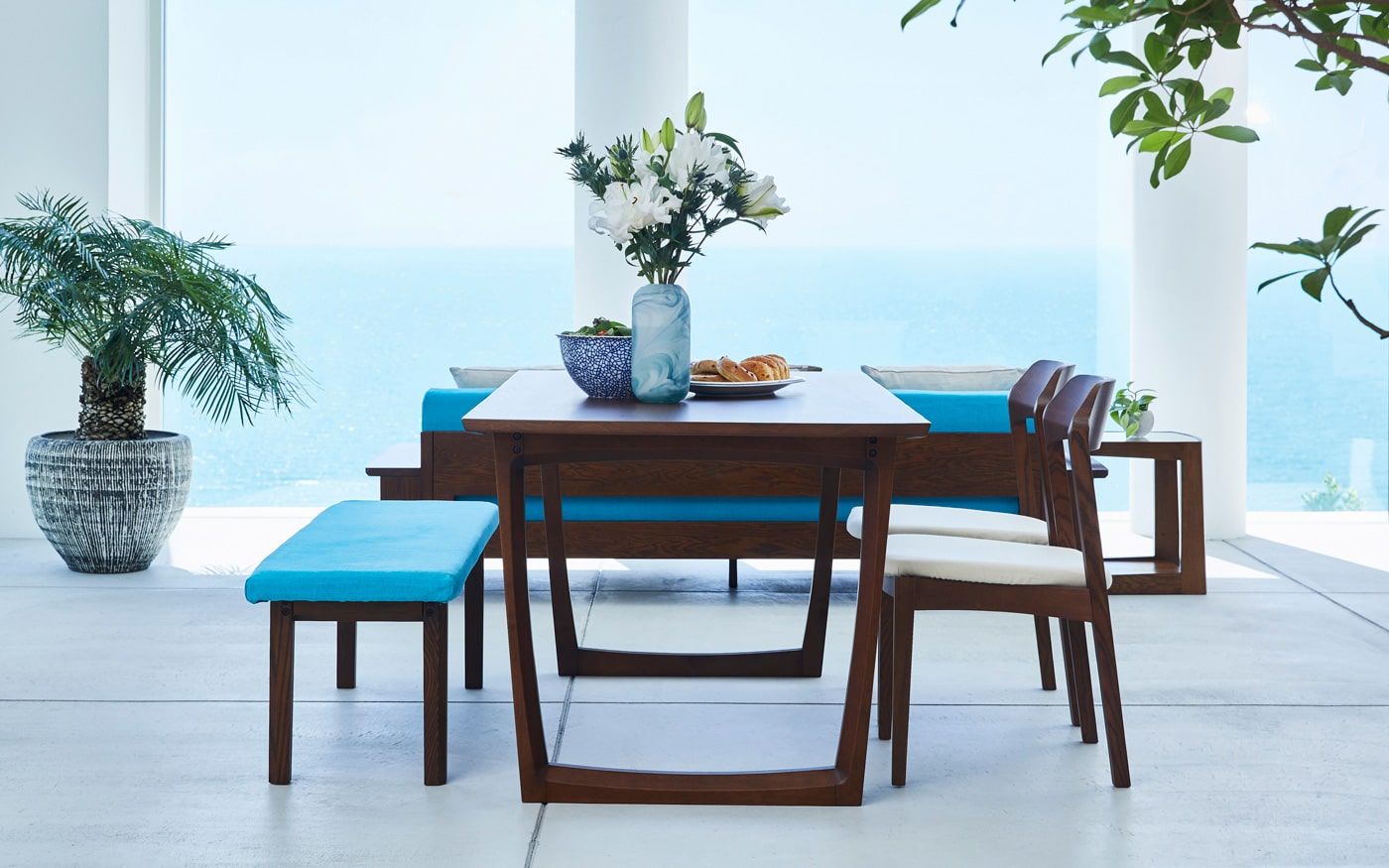 鮮やかなターコイズブルーで彩られたアイランドブルー・スタイルのダイニング空間。帆船から着想を得たダイニングテーブルセットやローソファが、水平線へと果てしなく続くブルーと見事に調和してくれます。また、ソファカバーやチェアカバーにもターコイズブルーを用いることで、より爽やかな空間に仕上がるでしょう。