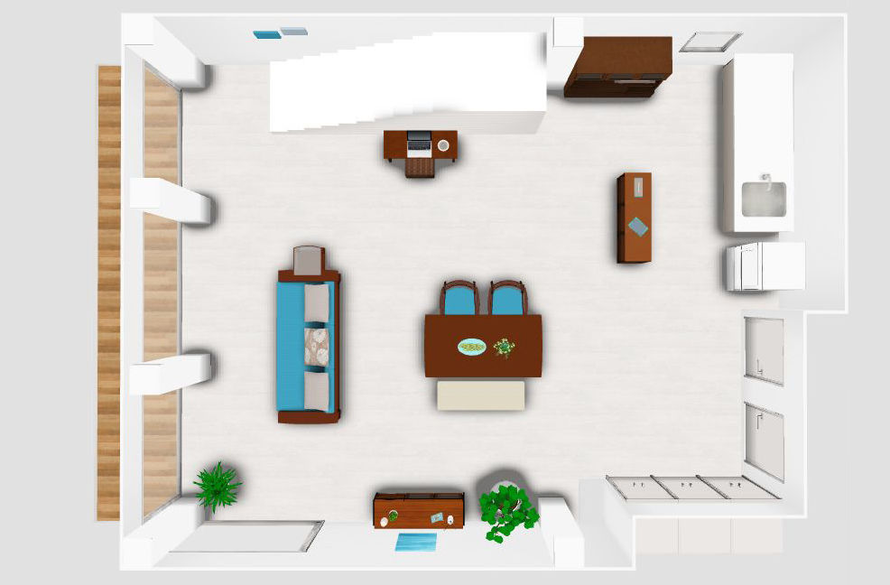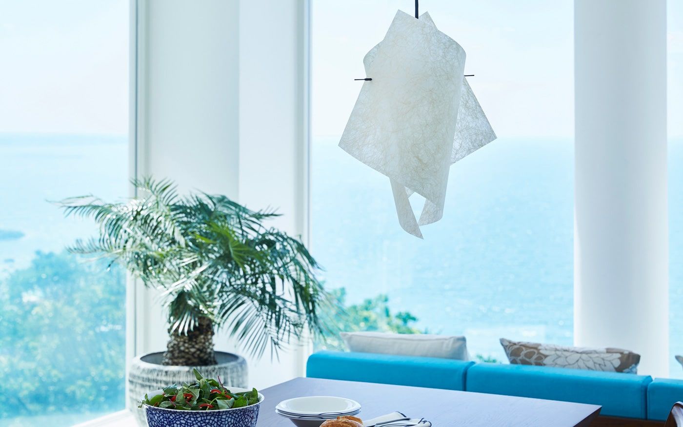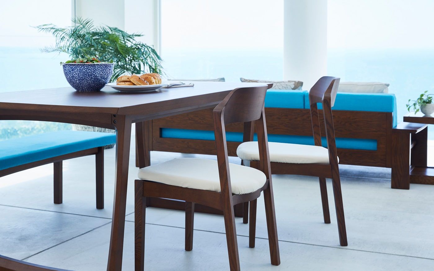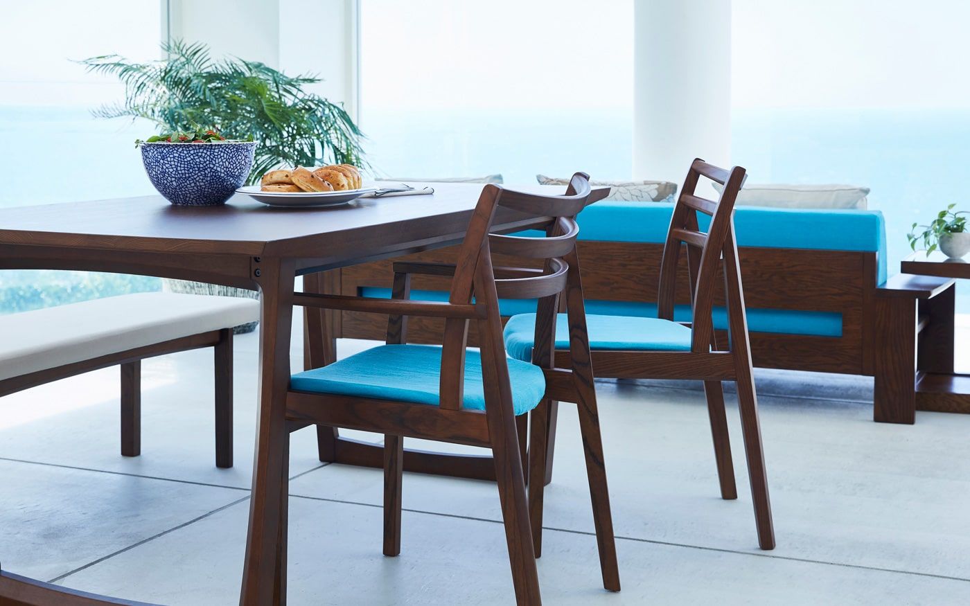 鮮やかなターコイズブルーで彩られたアイランドブルー・スタイルのダイニング空間。帆船から着想を得たダイニングテーブルセットやローソファが、水平線へと果てしなく続くブルーと見事に調和してくれます。また、ソファカバーやチェアカバーにもターコイズブルーを用いることで、より爽やかな空間に仕上がるでしょう。