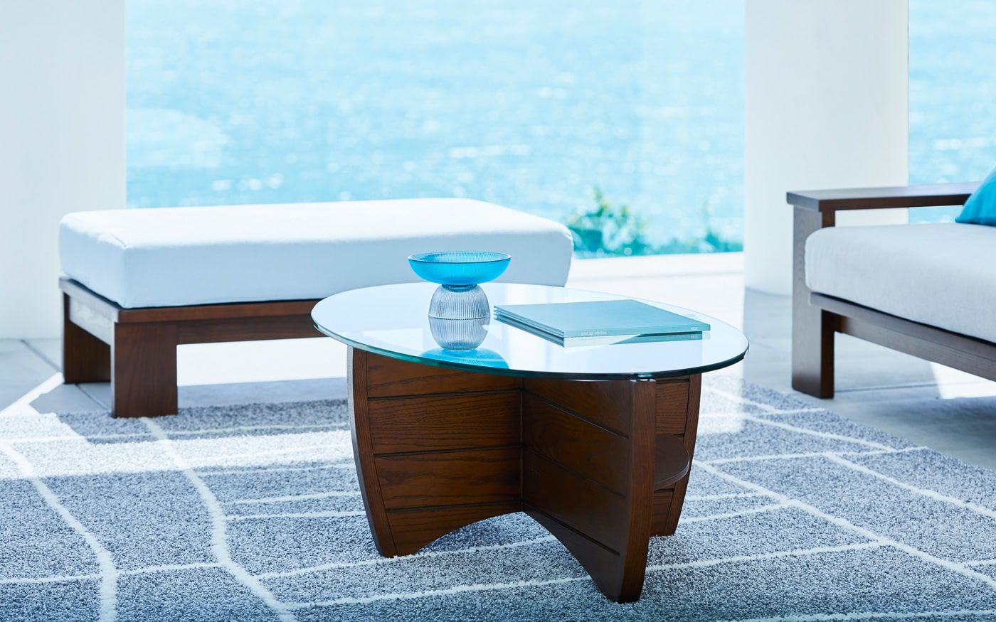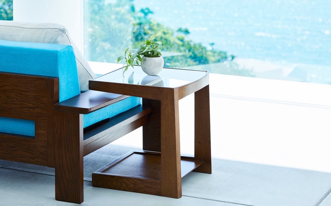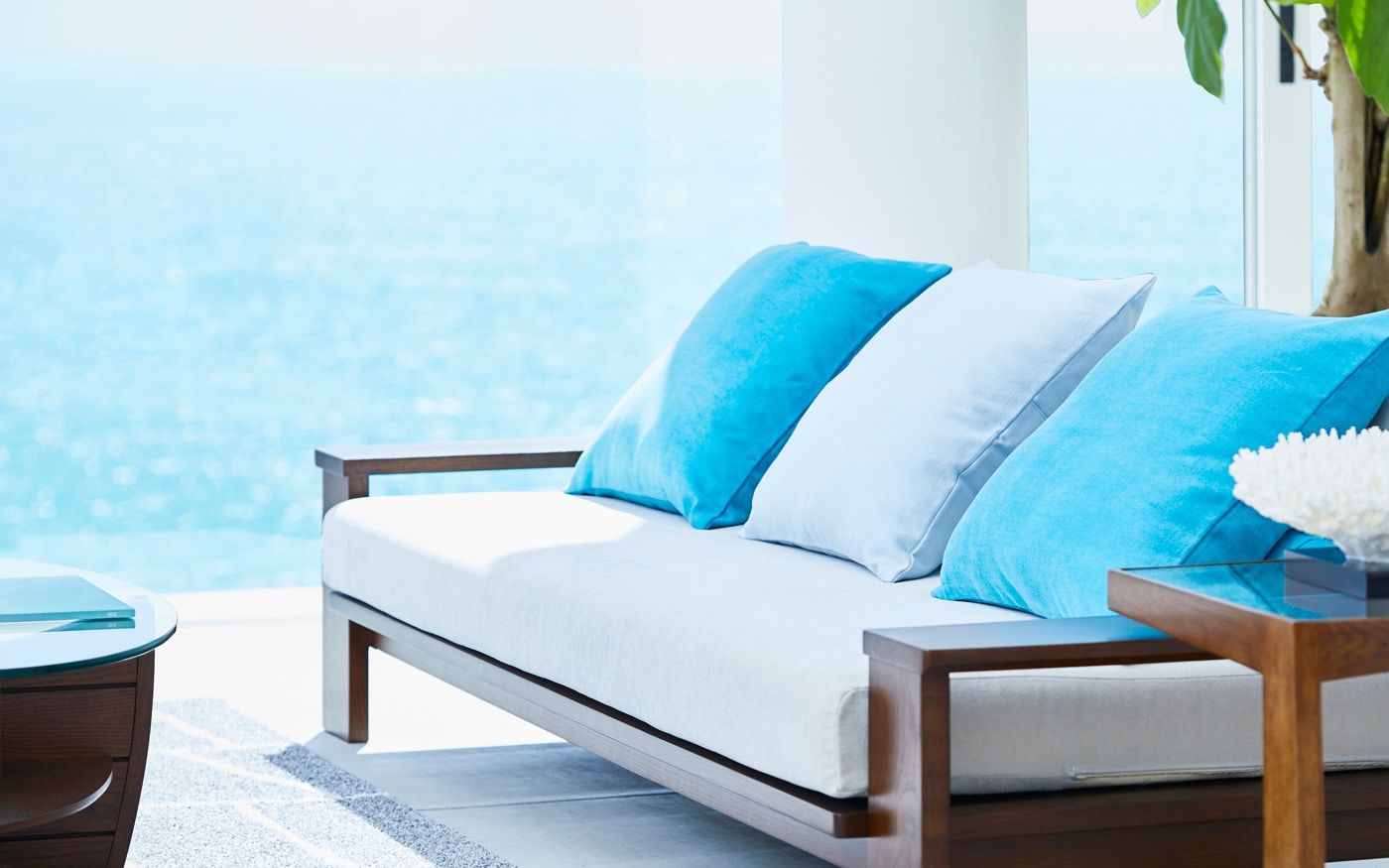 アイランドブルー・スタイルの部屋づくりに欠かせないカラーは、沖縄のような透き通る海をイメージした、ターコイズブルーの色合いです。陽の光を浴びてキラキラと光る海や砂浜の雰囲気を、澄んだブルーのクッションカバーやグレーのラグで表現してみましょう。また、海の上にいるかのような開放感を生み出すローソファや、抜け感のあるガラス天板のローテーブルと合わせれば、心地よい青の空間を堪能できます。