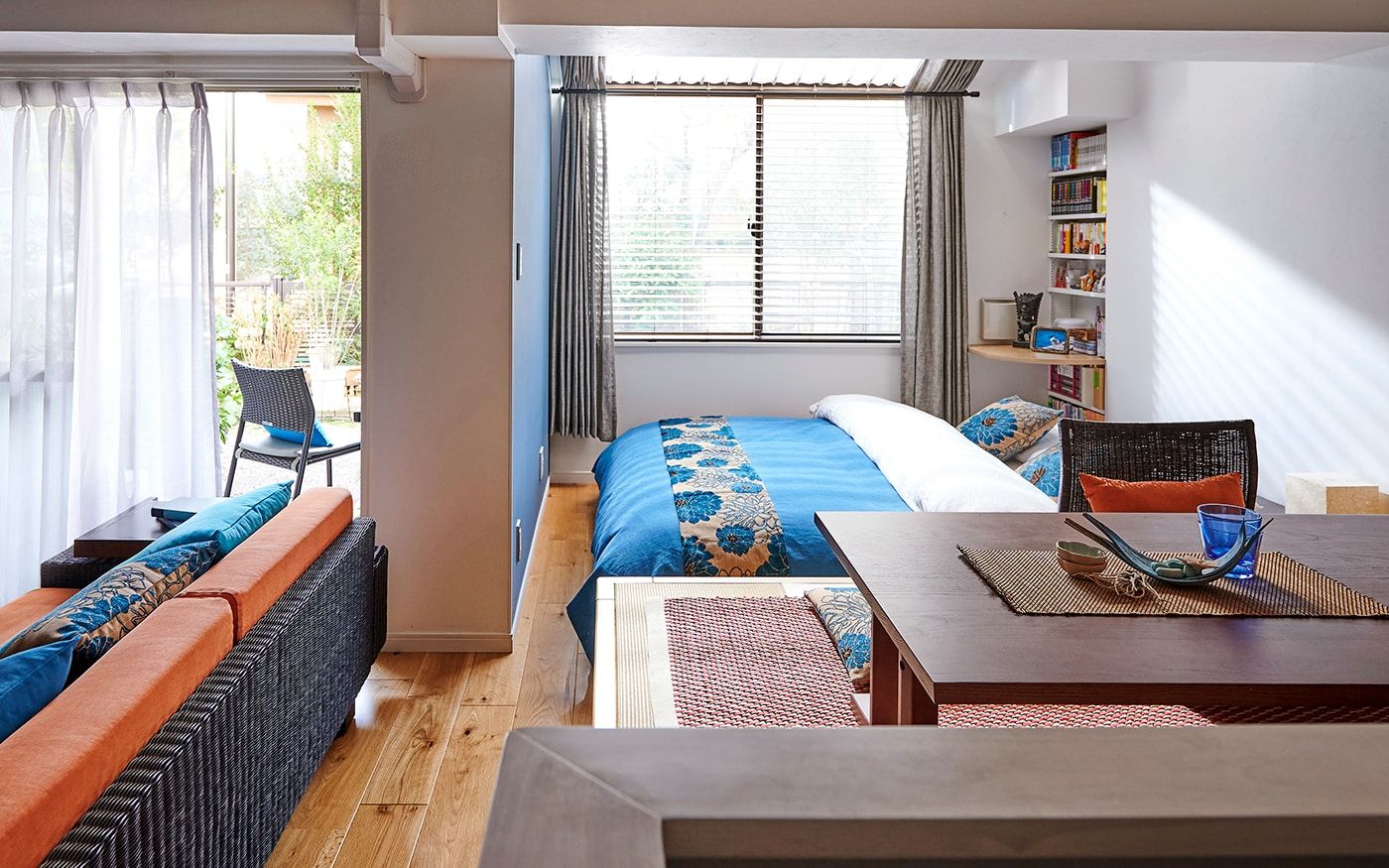 リビングスペースには、ラタン素材を存分に使用したローソファをレイアウト。高さを抑えることで、空間をスッキリ見せてくれます。ダイニングスペースは、高床式ユニット畳を活かしたローテーブル+座椅子の組合せで、床座でお食事をするスタイル。リビングダイニングにベッドを置いた特徴的なレイアウトでも、ローベッドを取り入れることで、ベッド特有の存在感を軽減。ロースタイルをベースに統一感のある空間が広がります。