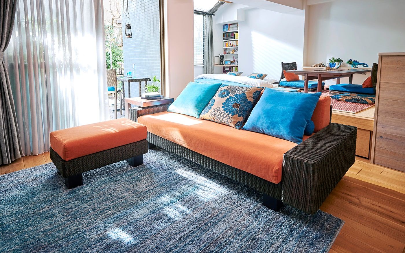 ブルーとオレンジの目を惹くカラーコーディネートが特徴的なLDK。ソファカバーに使用されてる〈ORオレンジ〉とブルーのクッションカバーの組合せは、海に沈むサンセットを彷彿しています。それぞれ違うブルーを存分に使用したクッションカバーが、空間に動きを演出。