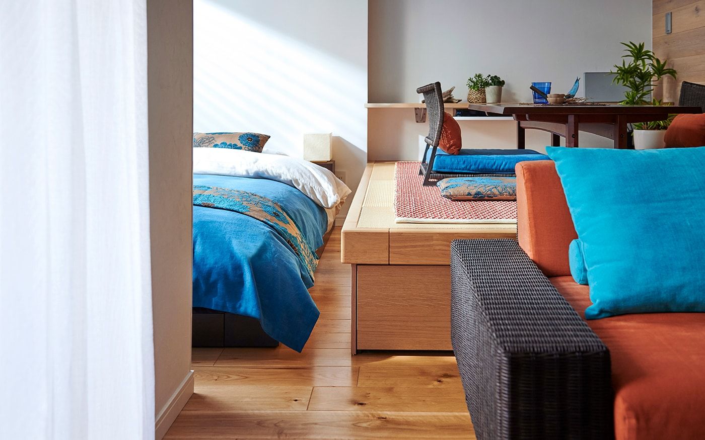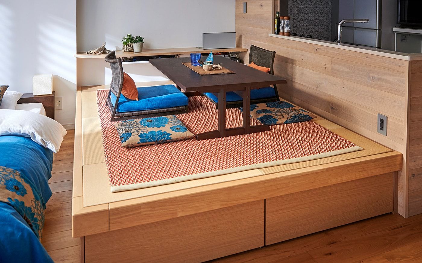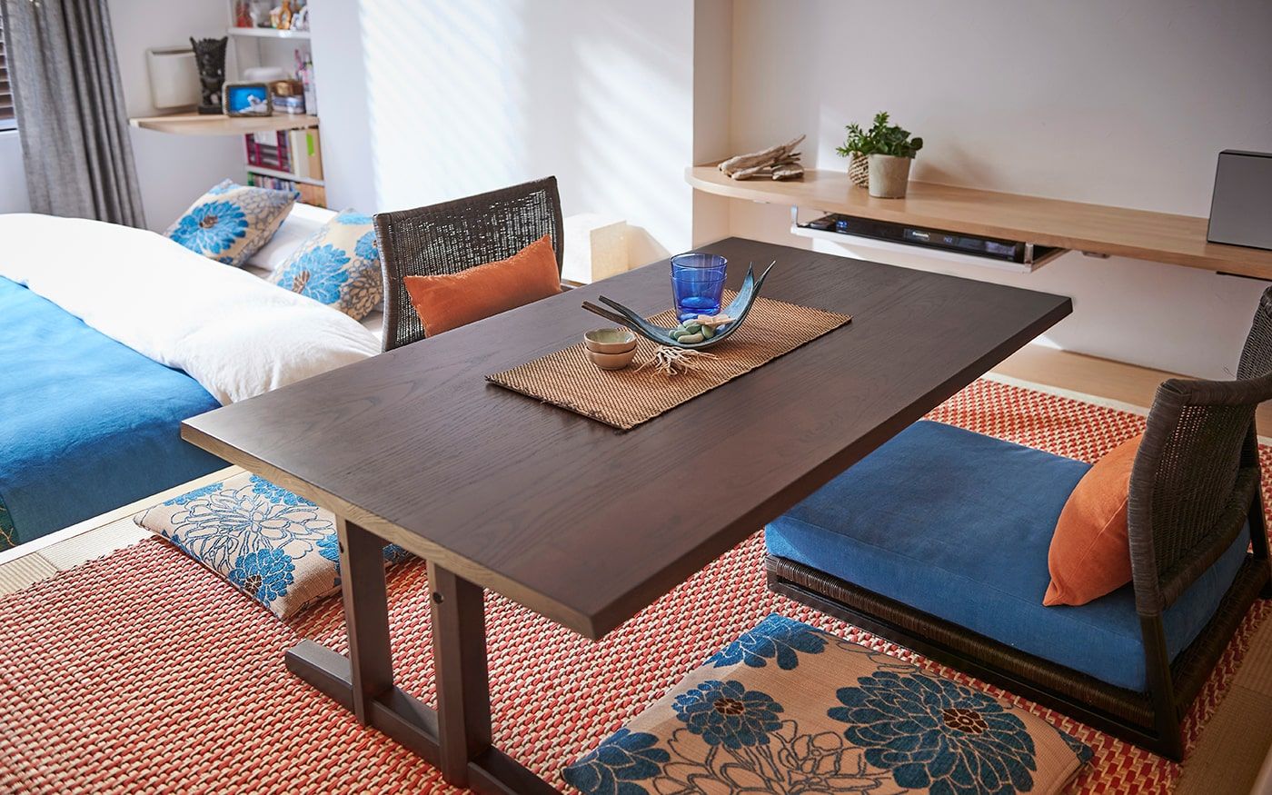 リビングスペースには、ラタン素材を存分に使用したローソファをレイアウト。高さを抑えることで、空間をスッキリ見せてくれます。ダイニングスペースは、高床式ユニット畳を活かしたローテーブル+座椅子の組合せで、床座でお食事をするスタイル。リビングダイニングにベッドを置いた特徴的なレイアウトでも、ローベッドを取り入れることで、ベッド特有の存在感を軽減。ロースタイルをベースに統一感のある空間が広がります。