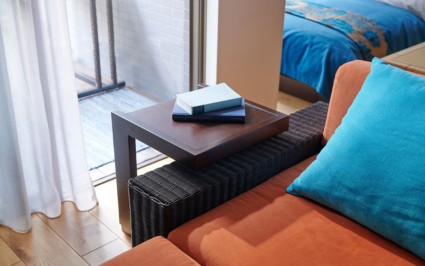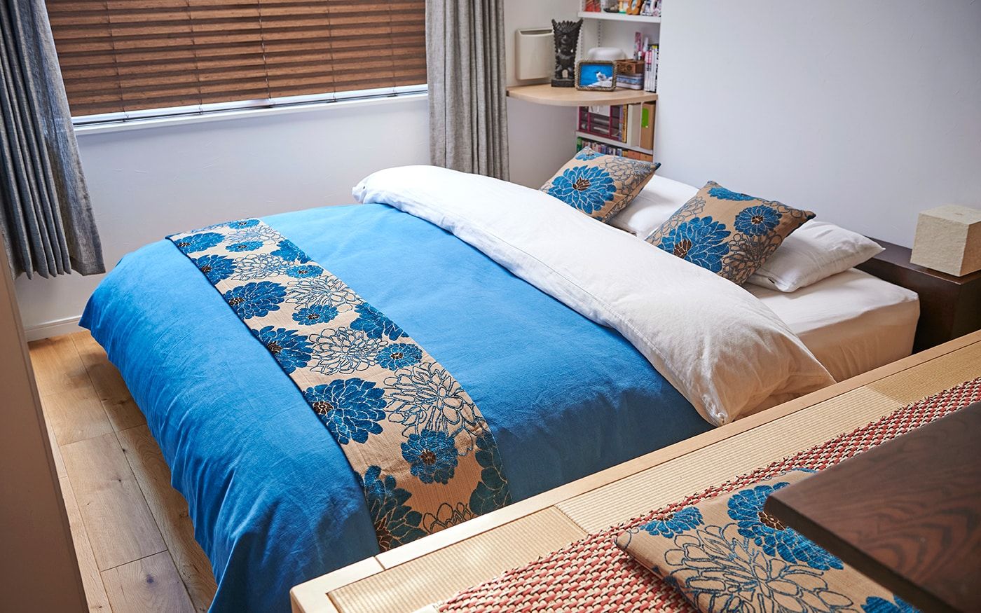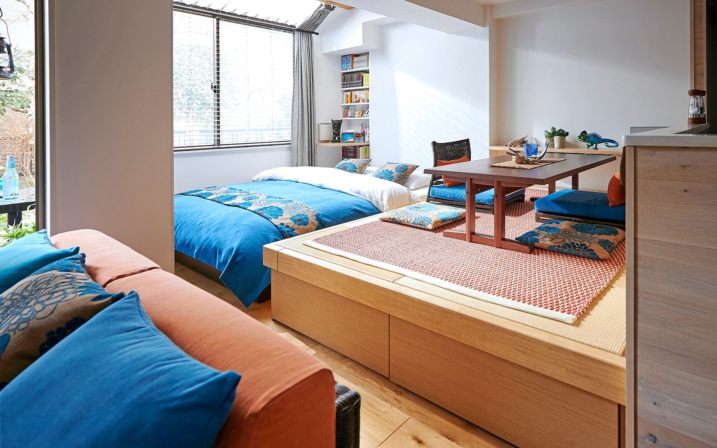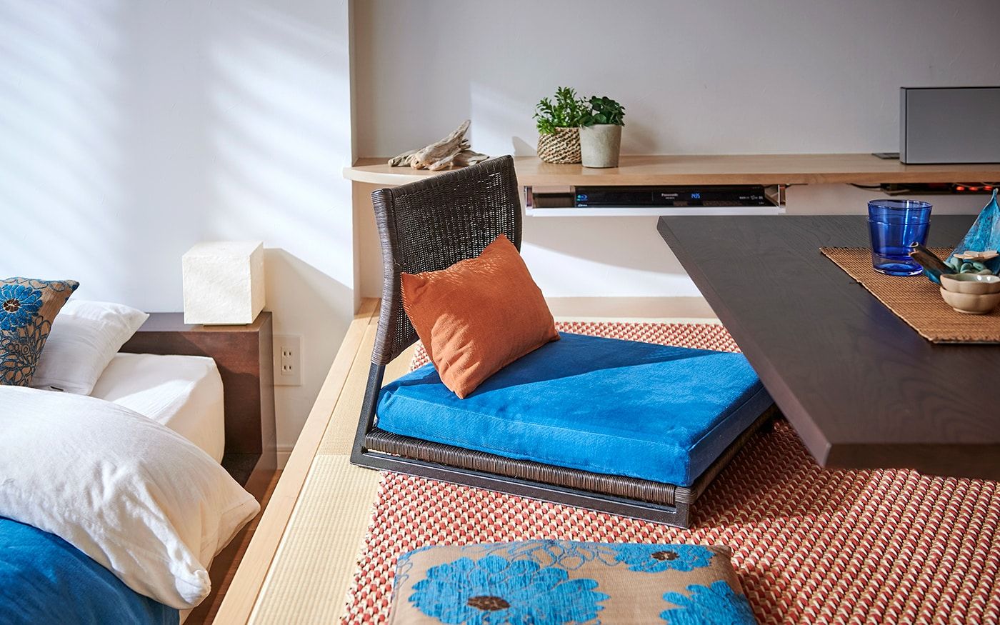 リビングスペースには、ラタン素材を存分に使用したローソファをレイアウト。高さを抑えることで、空間をスッキリ見せてくれます。ダイニングスペースは、高床式ユニット畳を活かしたローテーブル+座椅子の組合せで、床座でお食事をするスタイル。リビングダイニングにベッドを置いた特徴的なレイアウトでも、ローベッドを取り入れることで、ベッド特有の存在感を軽減。ロースタイルをベースに統一感のある空間が広がります。