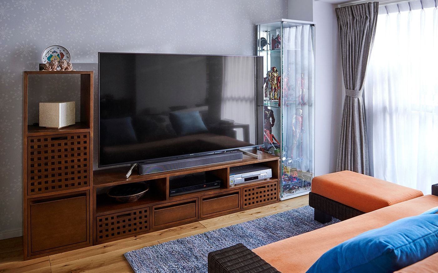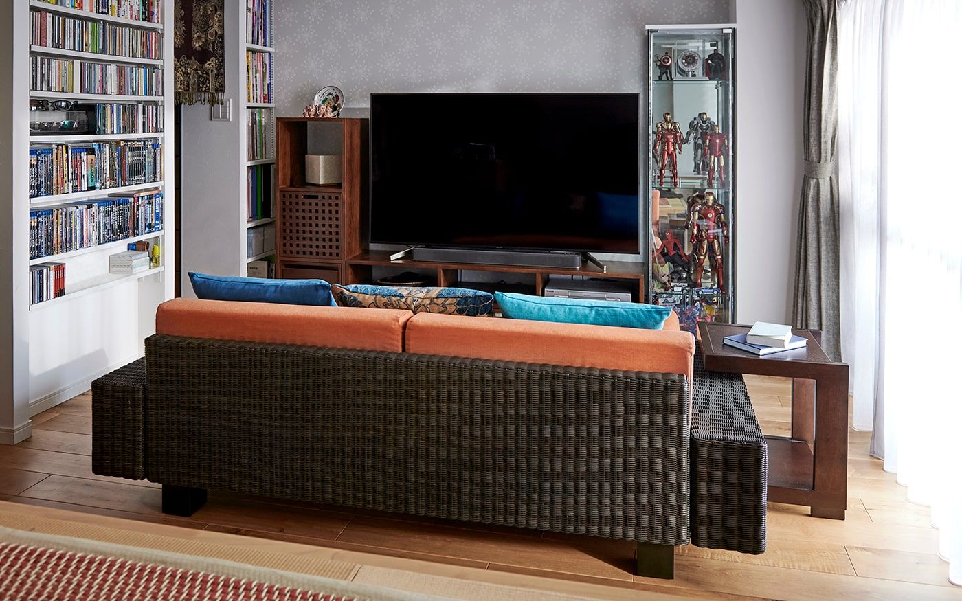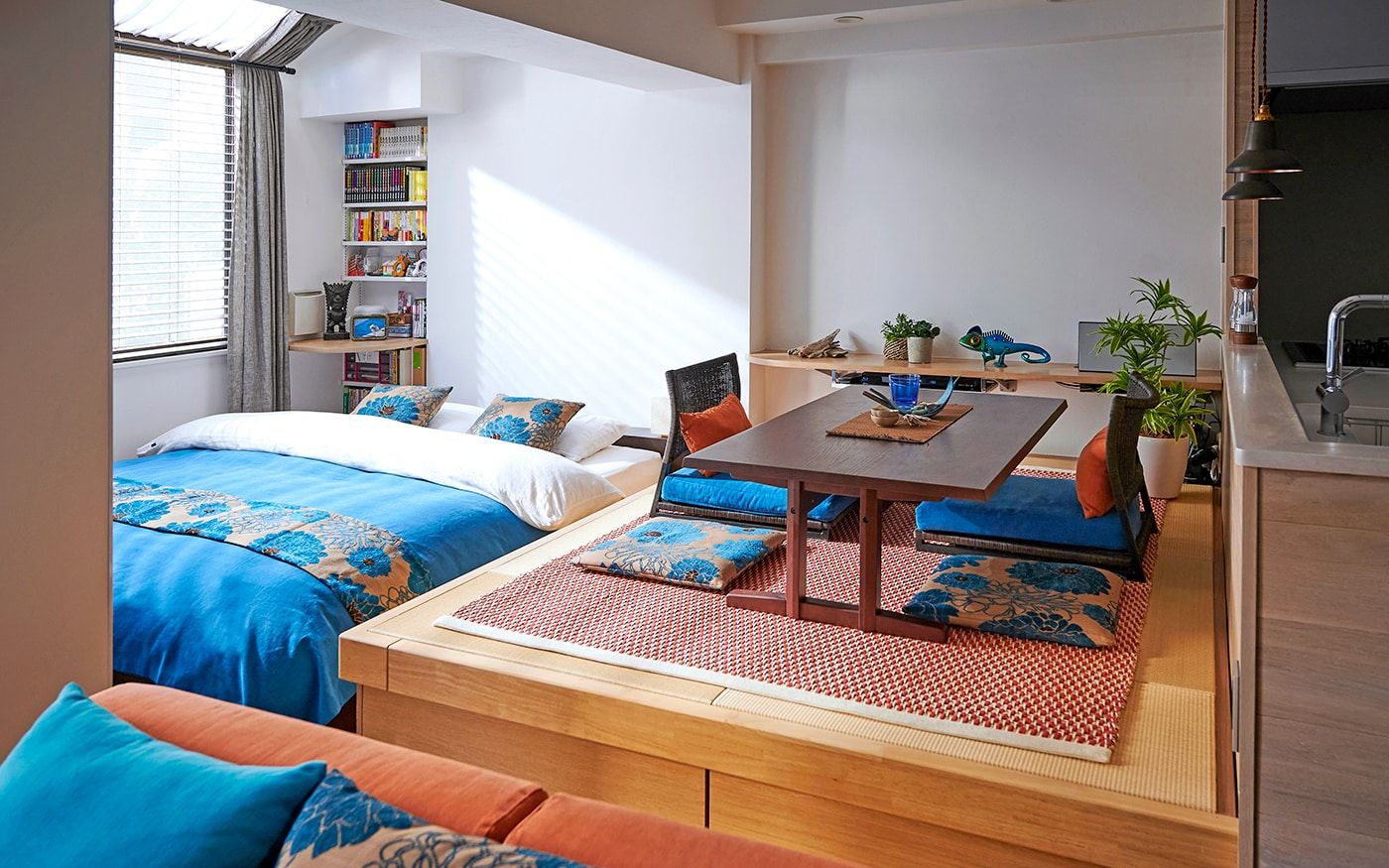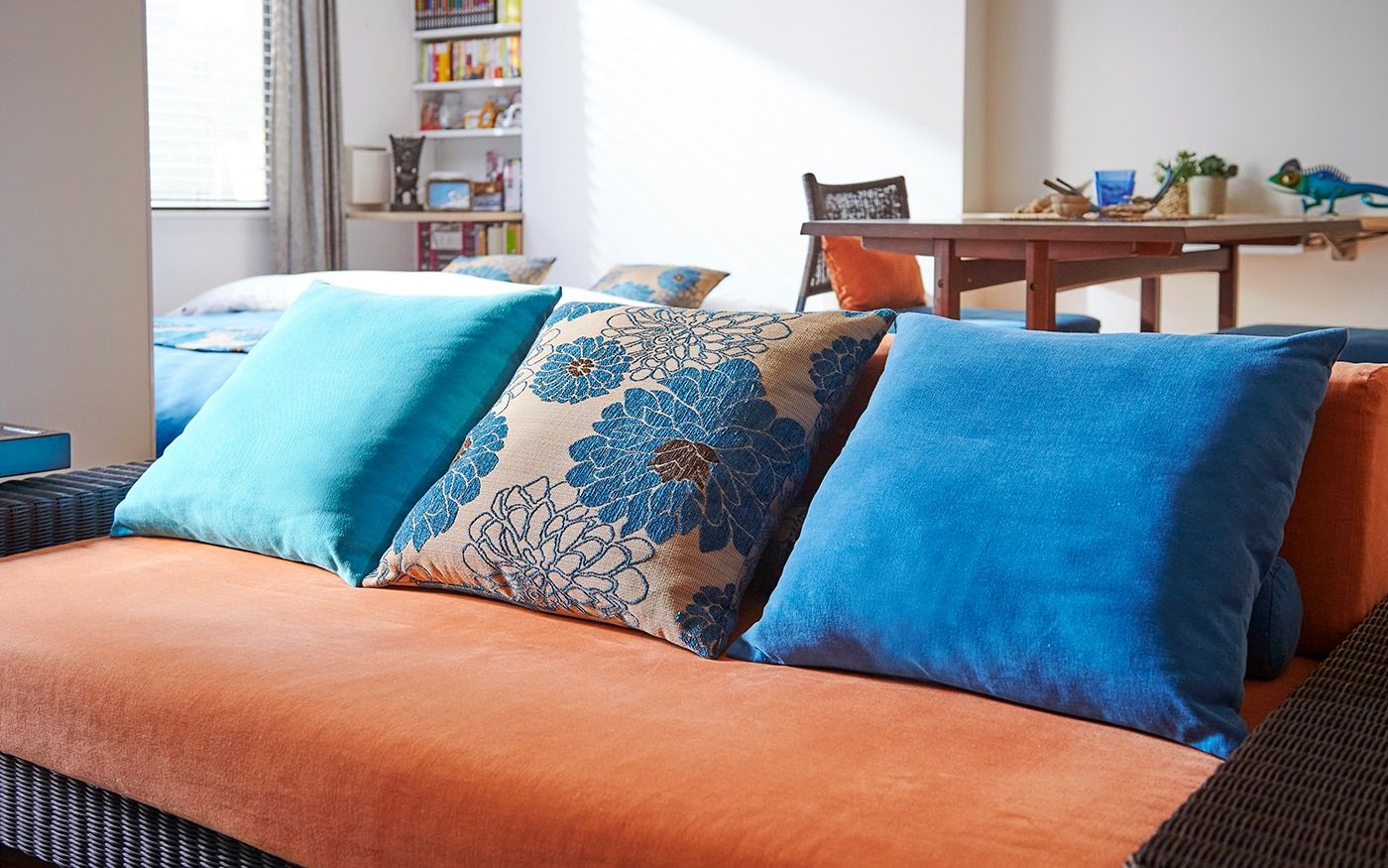 ブルーとオレンジの目を惹くカラーコーディネートが特徴的なLDK。ソファカバーに使用されてる〈ORオレンジ〉とブルーのクッションカバーの組合せは、海に沈むサンセットを彷彿しています。それぞれ違うブルーを存分に使用したクッションカバーが、空間に動きを演出。