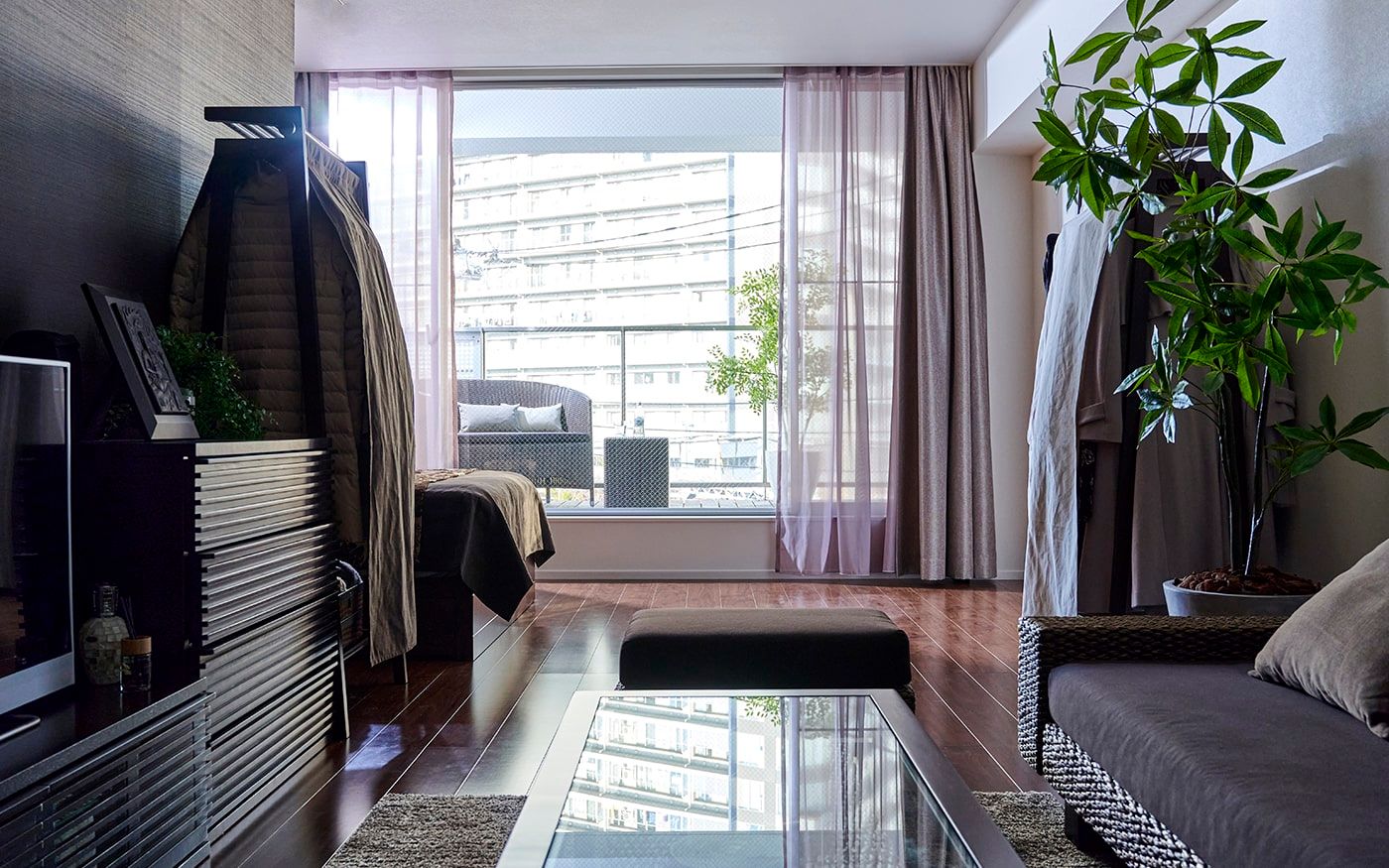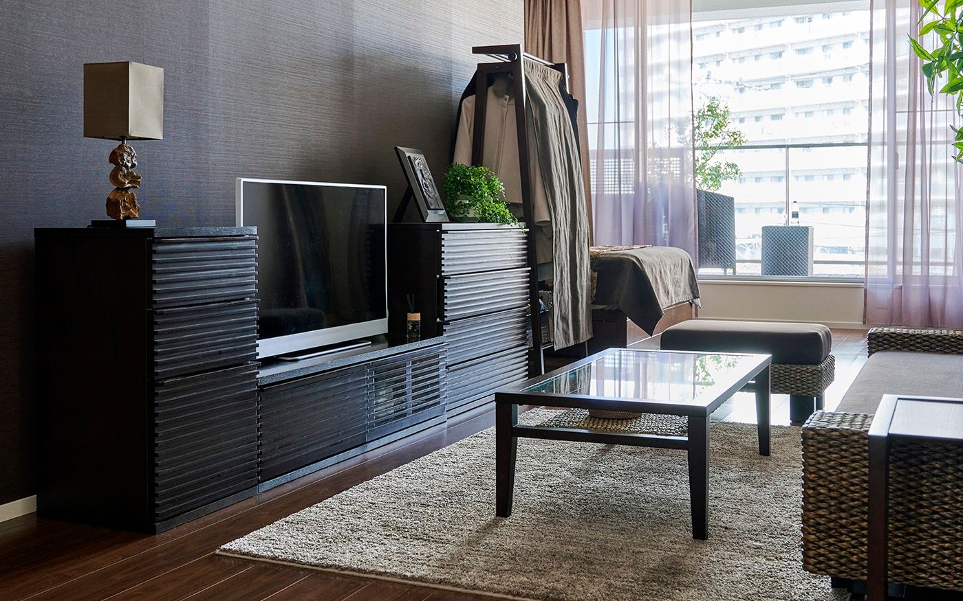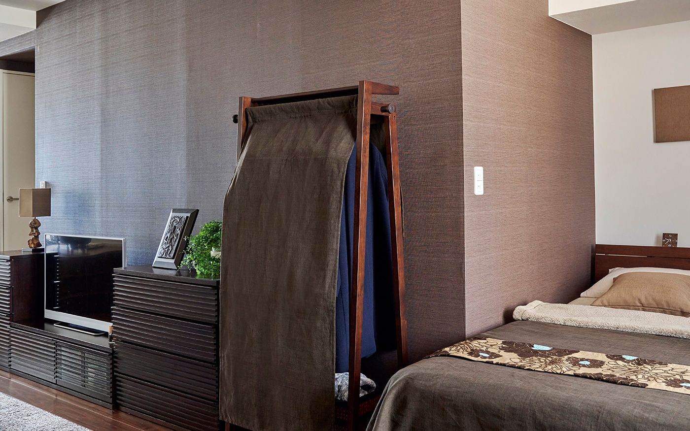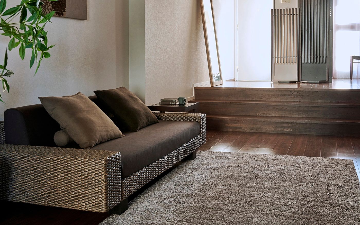 ゆったりした16畳の空間をワンカラーでコーディネートしたことで、内装や家具の色合いとも馴染み、統一感とより広さを感じる空間を仕上げました。ブラウンは飽きのこない温もりある空間を生み出します。