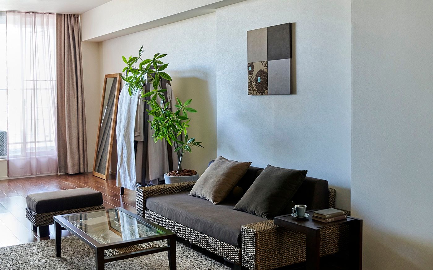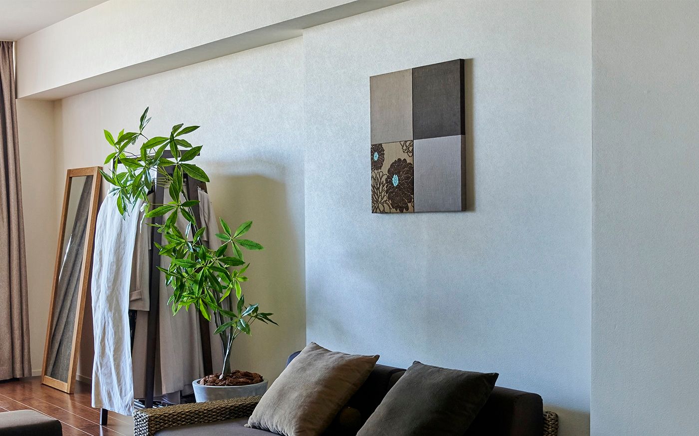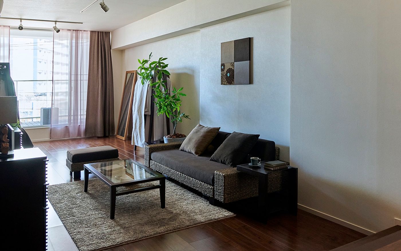 ゆったりした16畳の空間をワンカラーでコーディネートしたことで、内装や家具の色合いとも馴染み、統一感とより広さを感じる空間を仕上げました。ブラウンは飽きのこない温もりある空間を生み出します。