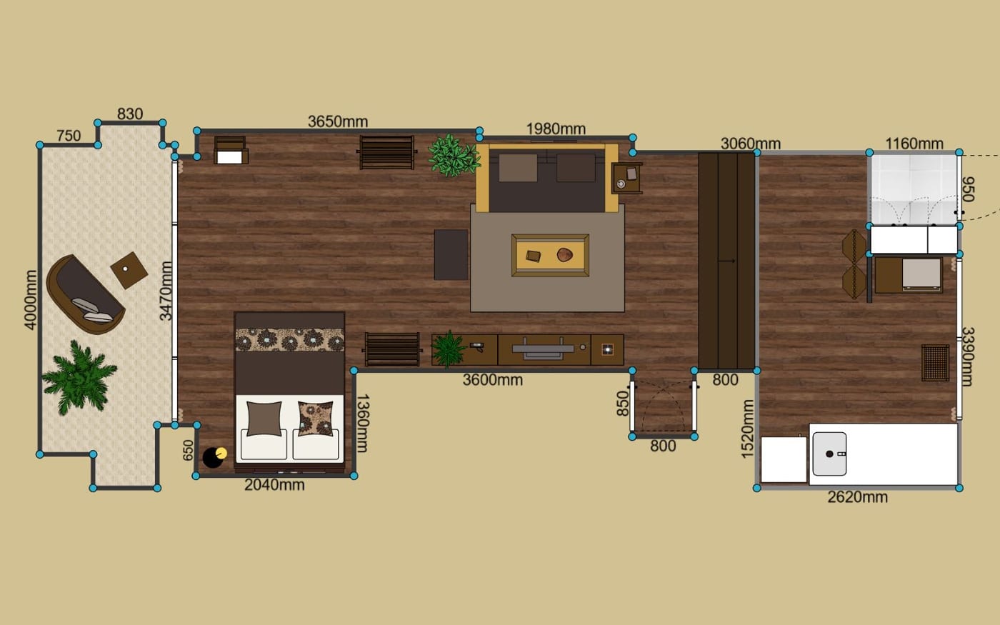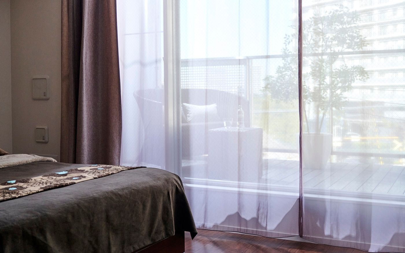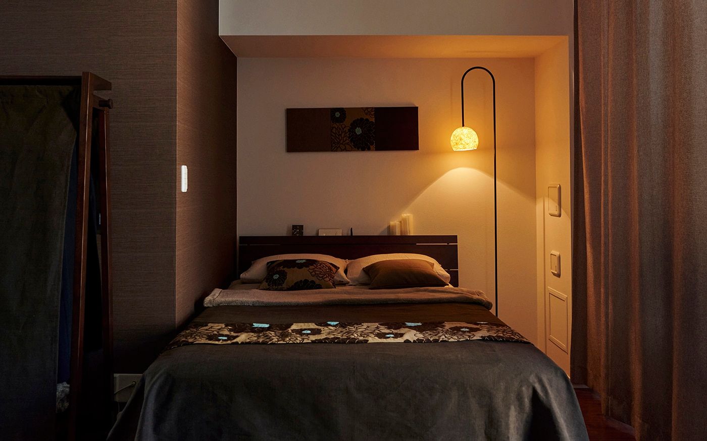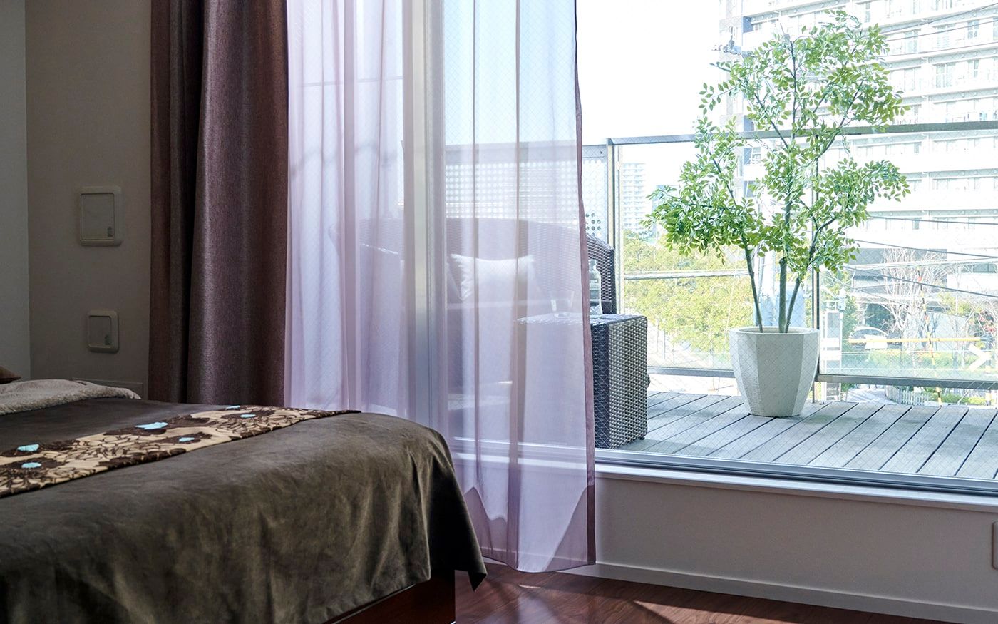 ゆったりした16畳の空間をワンカラーでコーディネートしたことで、内装や家具の色合いとも馴染み、統一感とより広さを感じる空間を仕上げました。ブラウンは飽きのこない温もりある空間を生み出します。