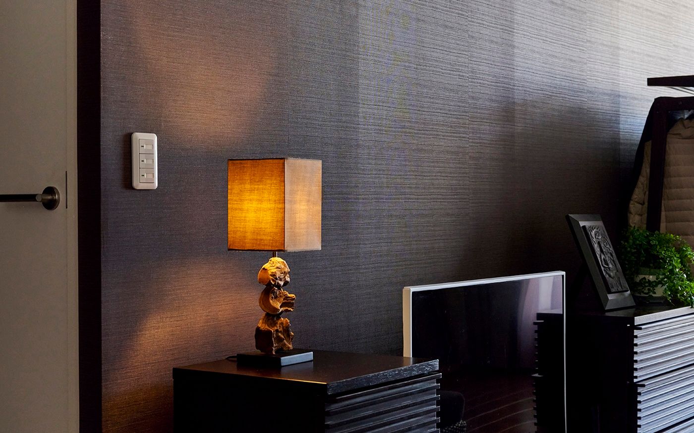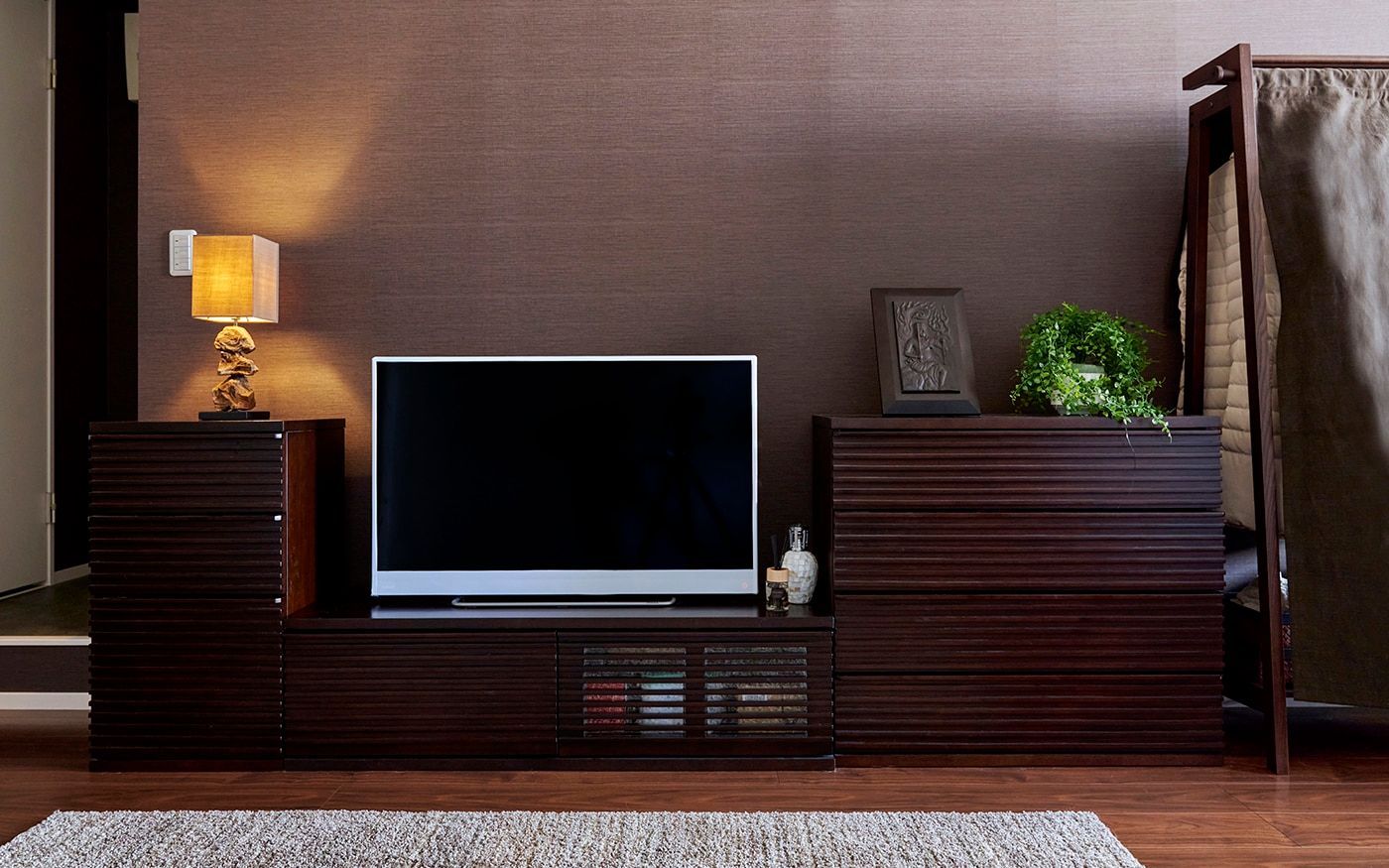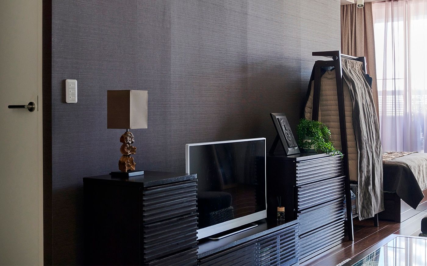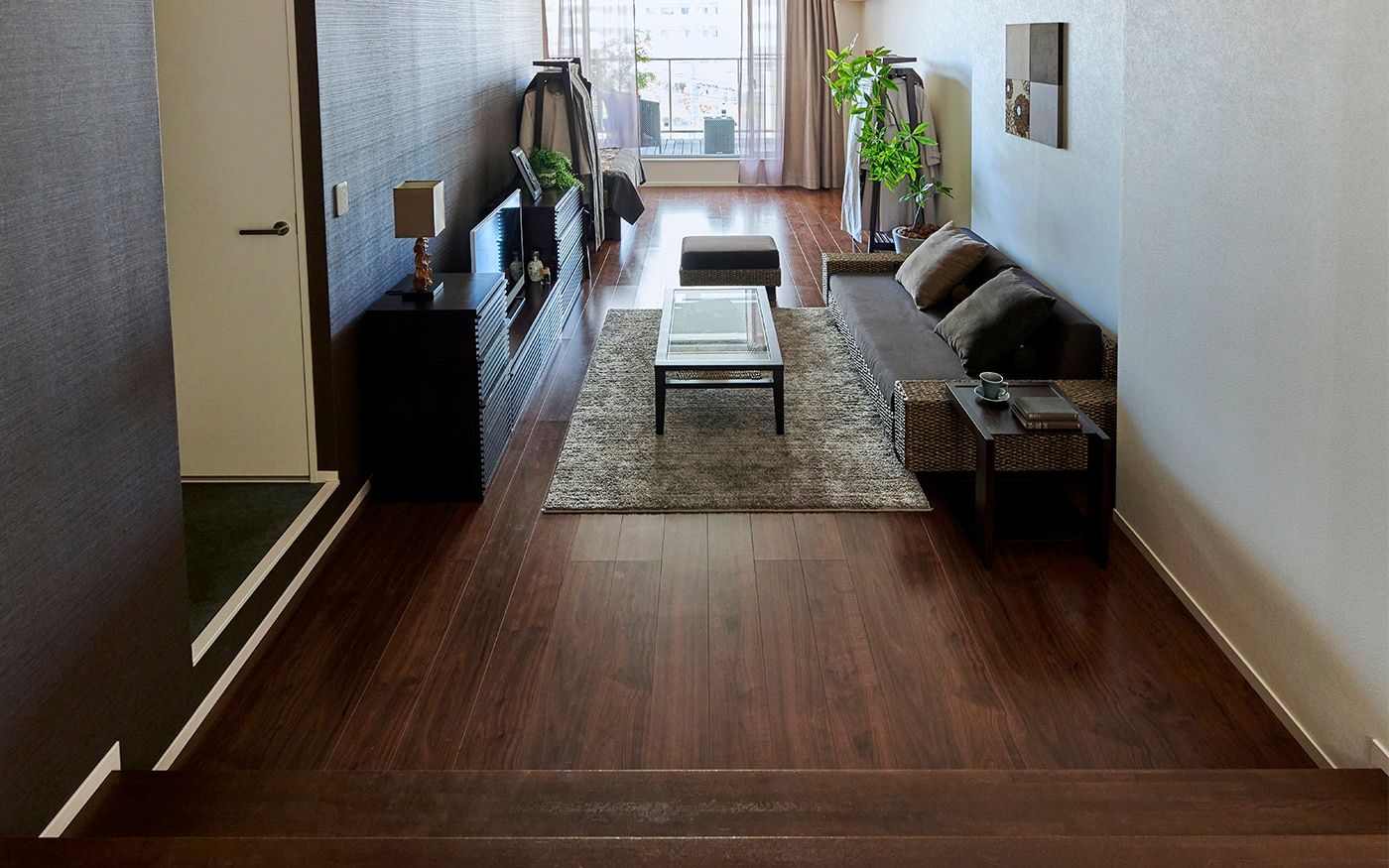 縦長のリビングは壁面が左右に長く広がるため、こちらの部屋では一部の壁にはアクセントになるブラウンのクロスや壁面装飾を取り入れています。家具とも上手く調和したまとまりある空間が完成しました。