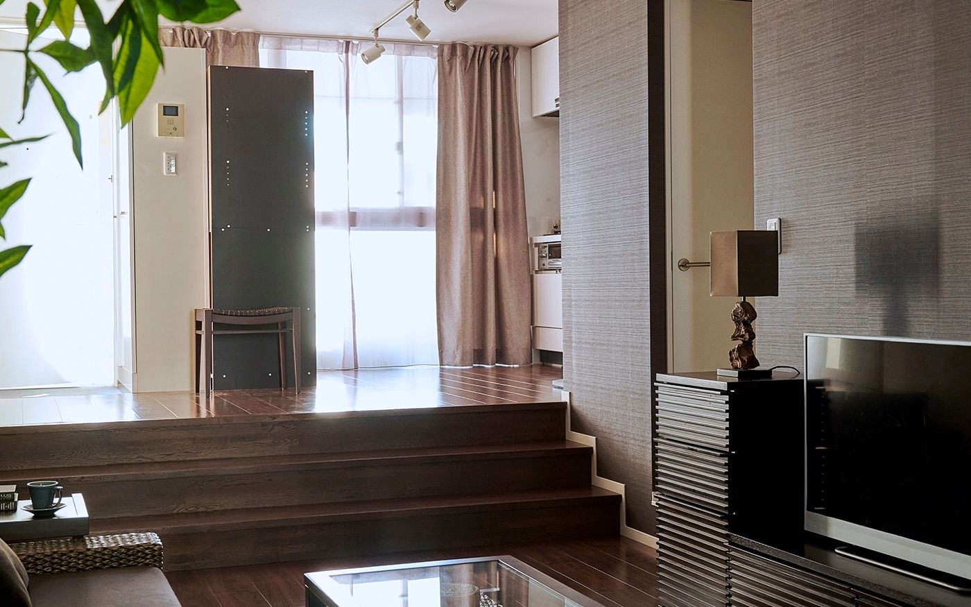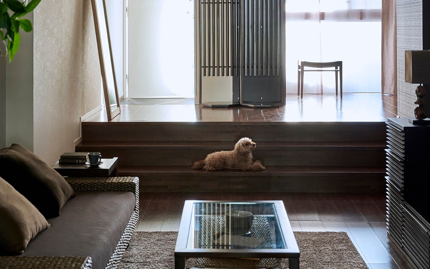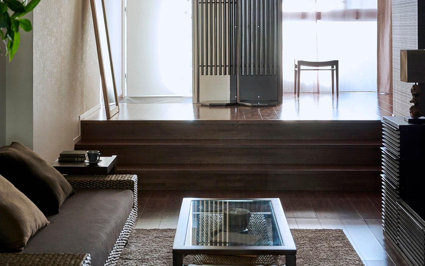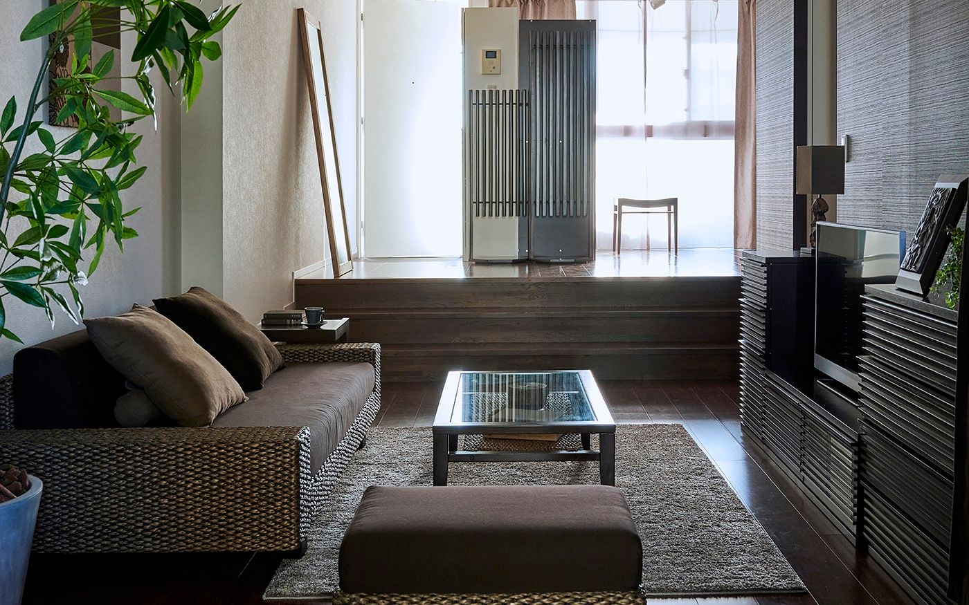 階段状に下がったサンクンリビングでは、低い床面にロースタイル家具を置くことで、より高さを抑えた開放的な空間が演出できます。ローソファや脚無しテレビボードはロースタイル空間の主役となるでしょう。
