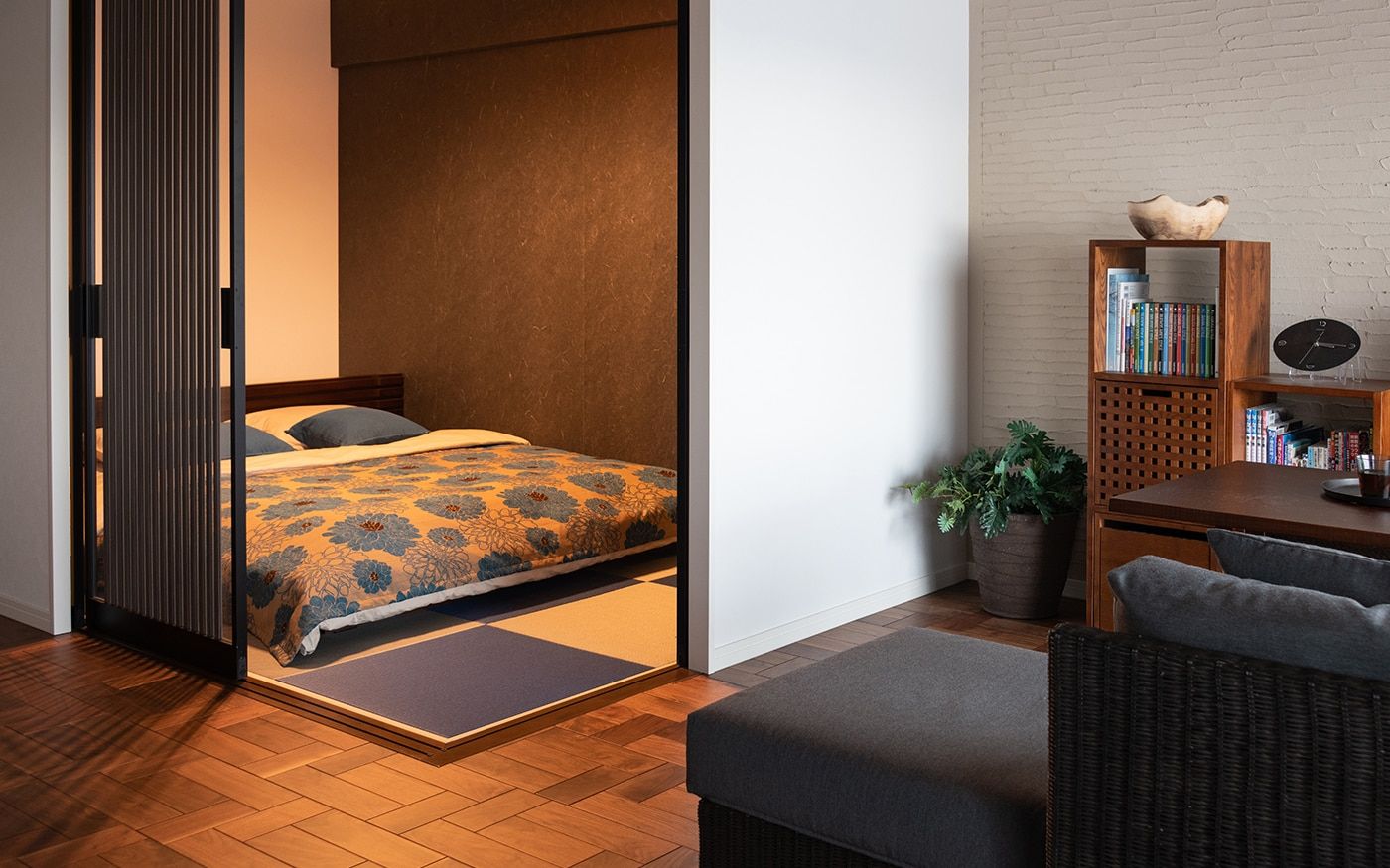 落ち着いた大人っぽい雰囲気のリビングと一体感がある寝室に仕上げました。琉球畳や壁面のクロス、格子の扉など、こだわりのリノベーションポイントが詰まった和を感じさせる空間です。