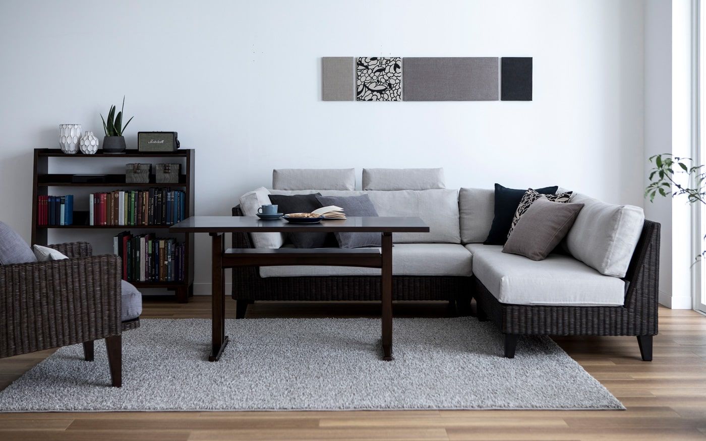 すっきり広々とした空間を実現するために、寛ぎスペースと食事の2つのスタイルを1つにまとめたソファダイニングセットを取り入れています。洗練感のあるラタン材のソファは、こだわりのリノベーションで仕上げた内装材と綺麗に調和しました。