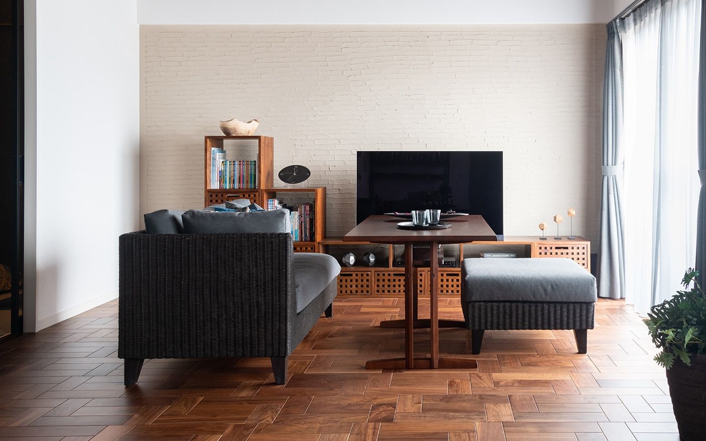リノベーションを行ったリビングルームの内装材に合わせて、相性の良い収納家具を取り入れています。素材感ある壁面材に映える無垢材のテレビボードや、貼り方にこだわった床材と無垢材ダイニングテーブルの組み合わせがおしゃれです。
