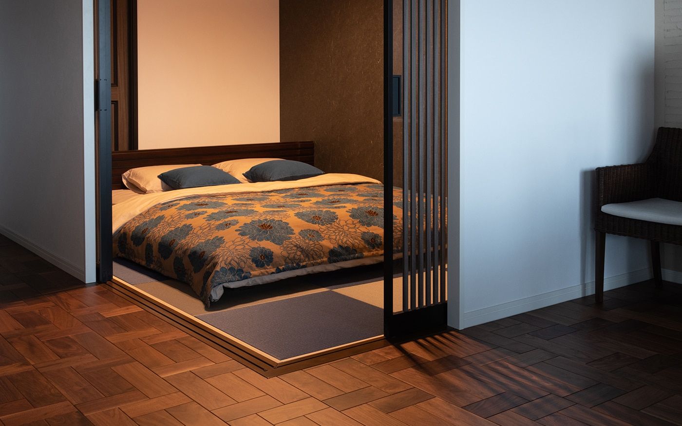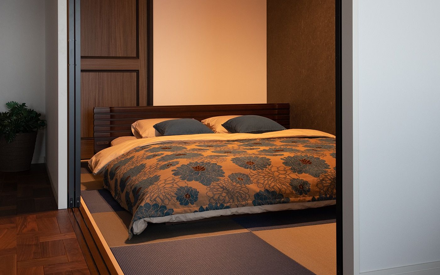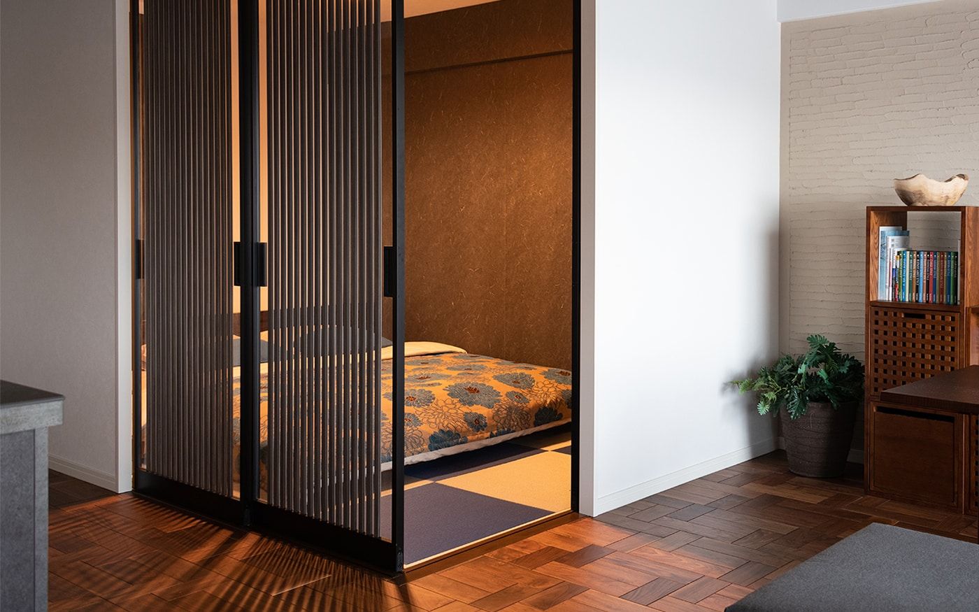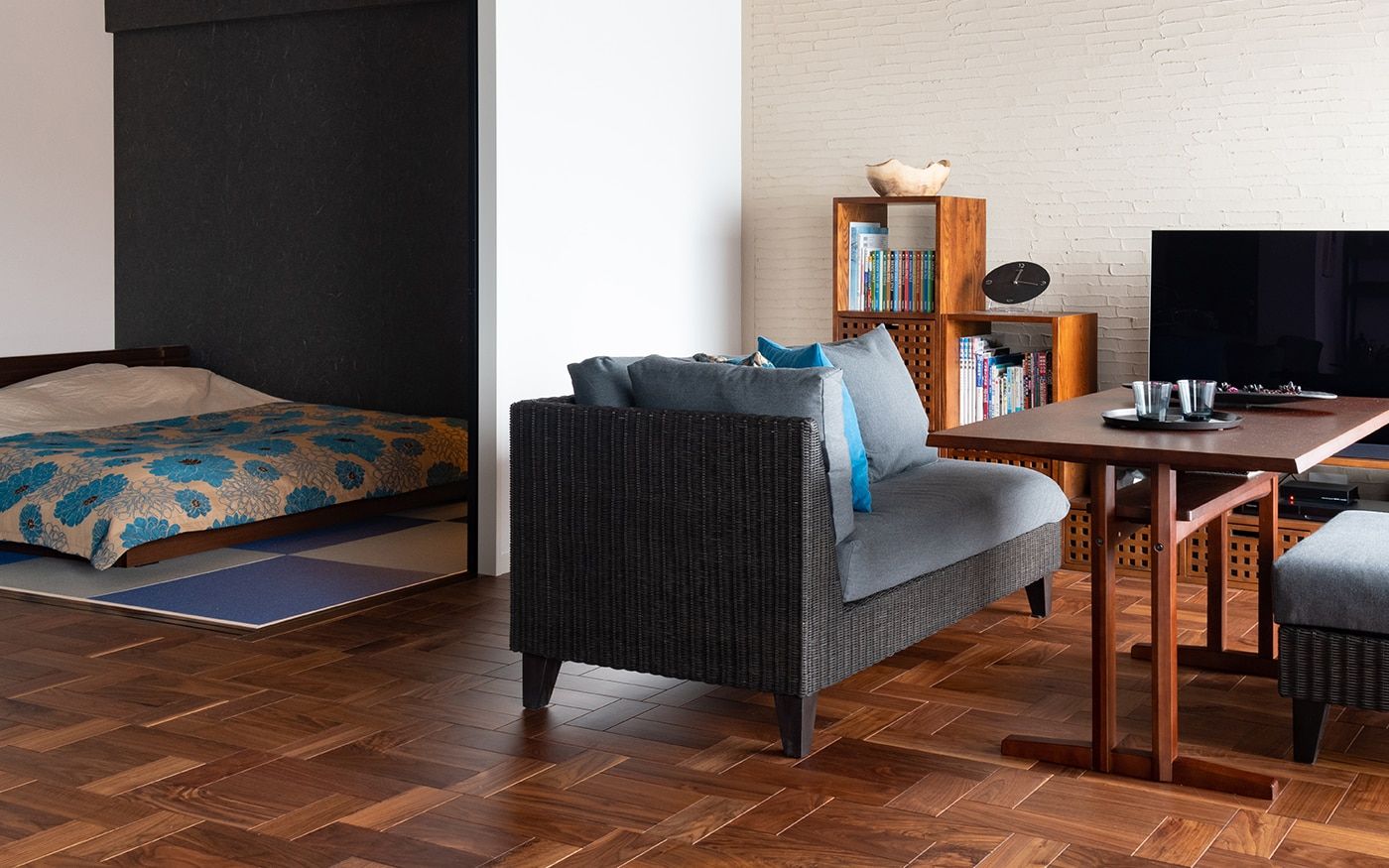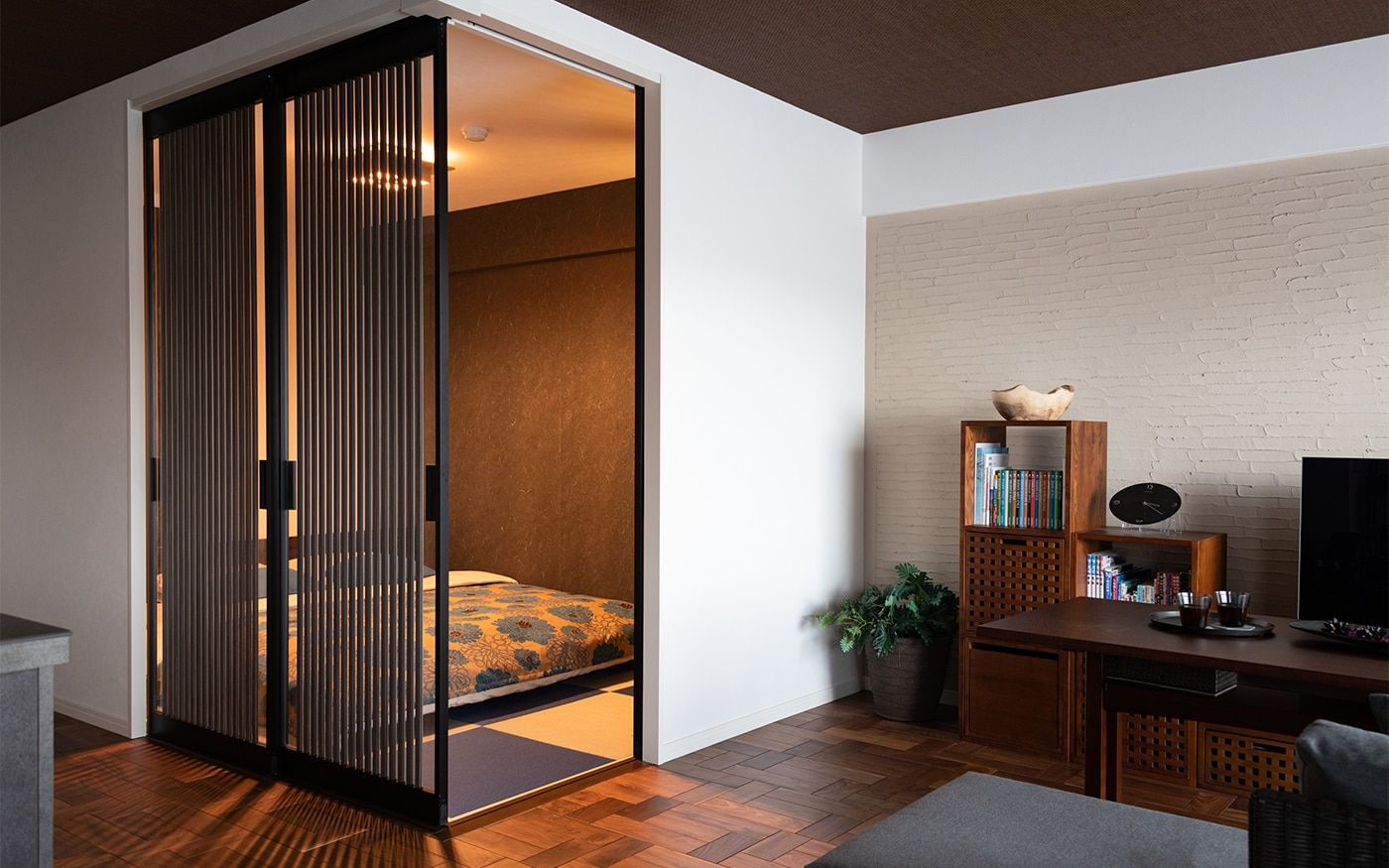 落ち着いた大人っぽい雰囲気のリビングと一体感がある寝室に仕上げました。琉球畳や壁面のクロス、格子の扉など、こだわりのリノベーションポイントが詰まった和を感じさせる空間です。