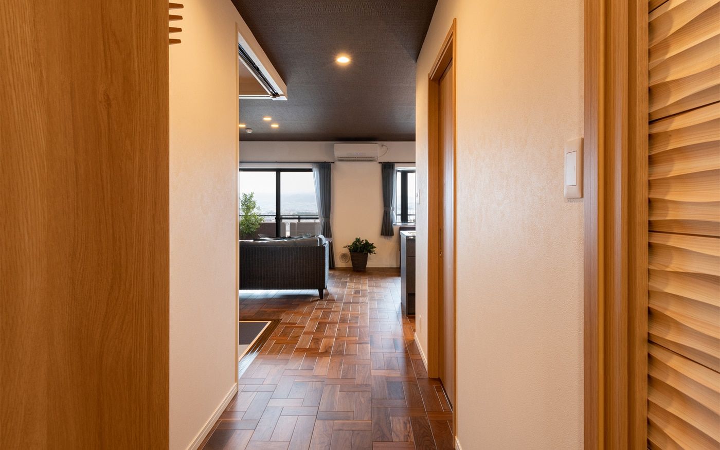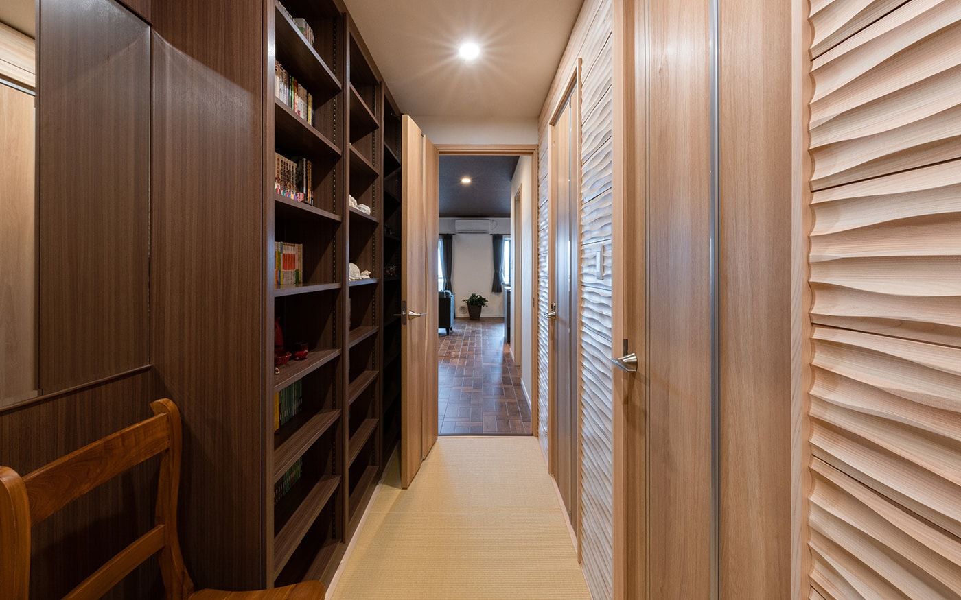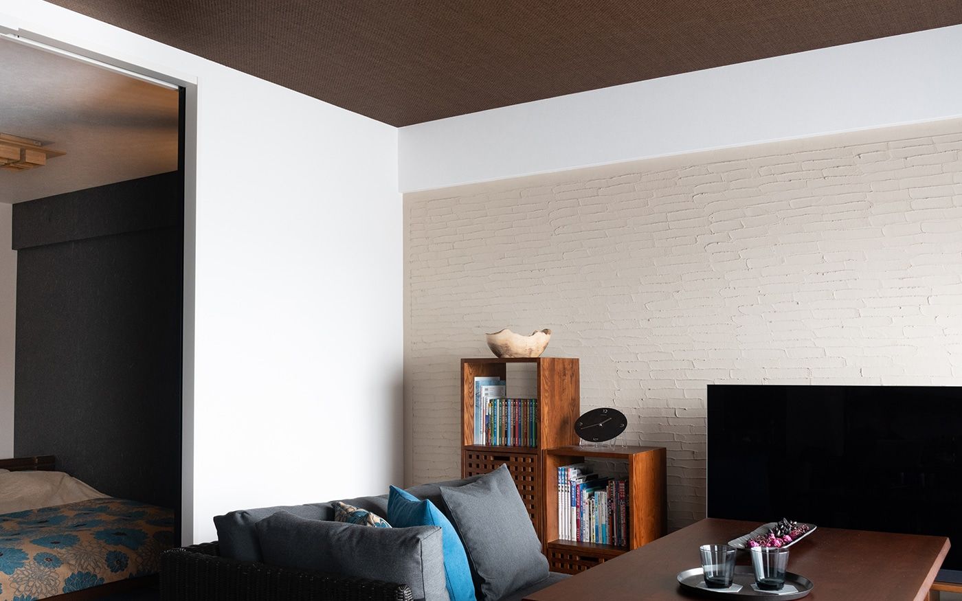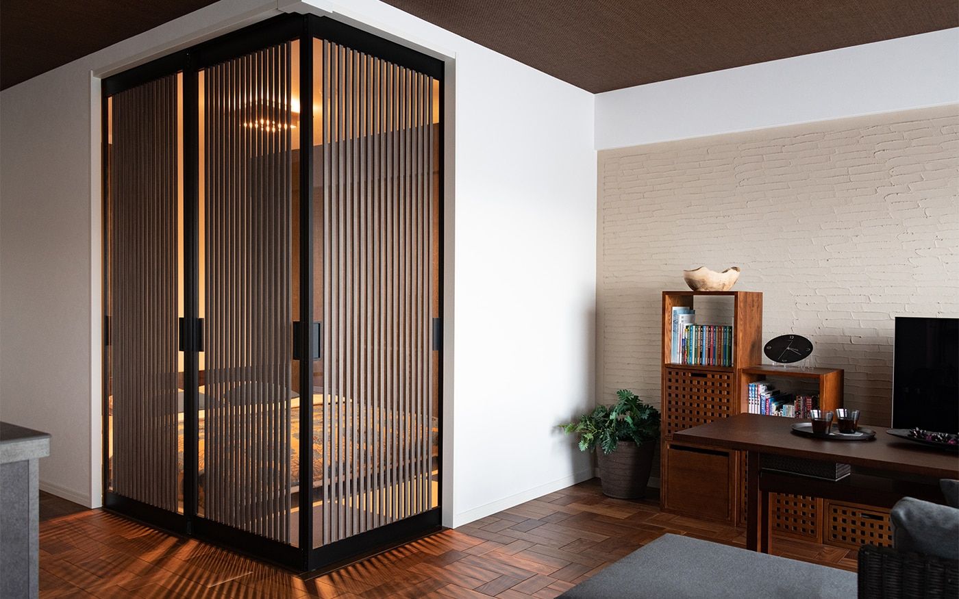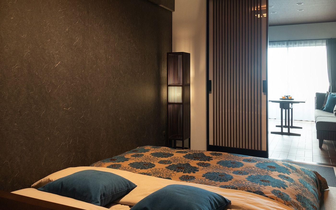 落ち着いた大人っぽい雰囲気のリビングと一体感がある寝室に仕上げました。琉球畳や壁面のクロス、格子の扉など、こだわりのリノベーションポイントが詰まった和を感じさせる空間です。