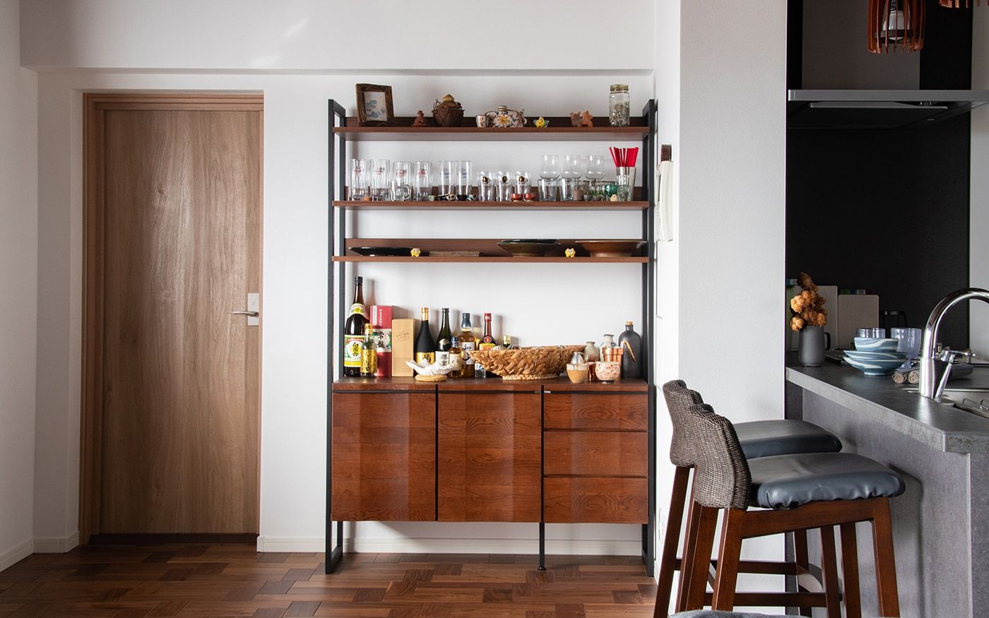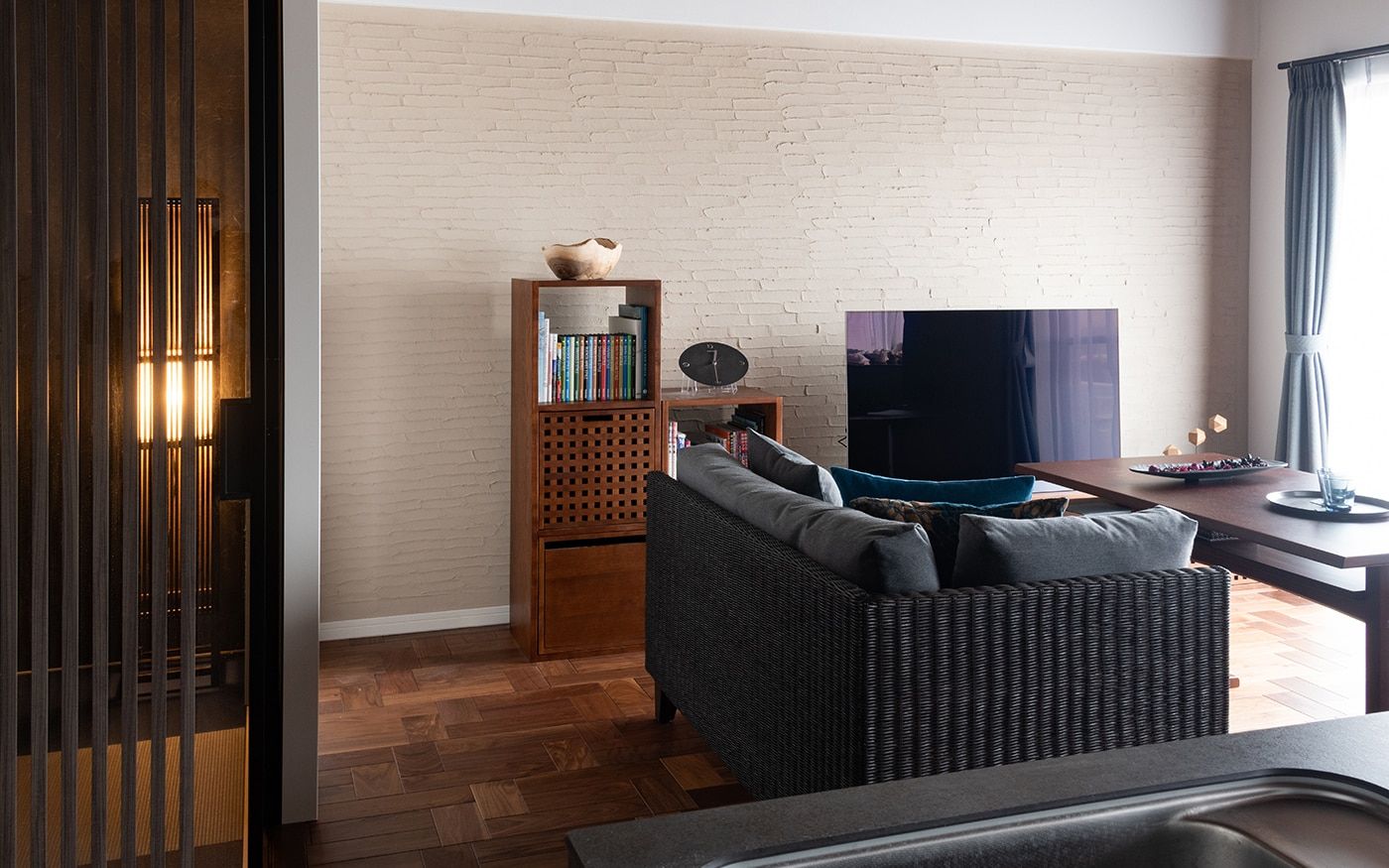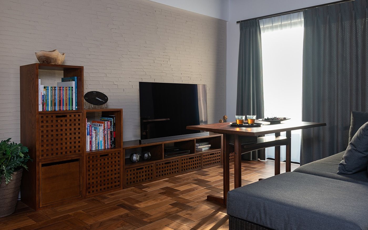 リノベーションを行ったリビングルームの内装材に合わせて、相性の良い収納家具を取り入れています。素材感ある壁面材に映える無垢材のテレビボードや、貼り方にこだわった床材と無垢材ダイニングテーブルの組み合わせがおしゃれです。
