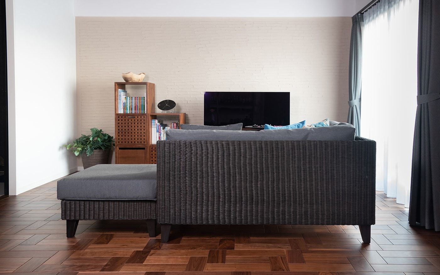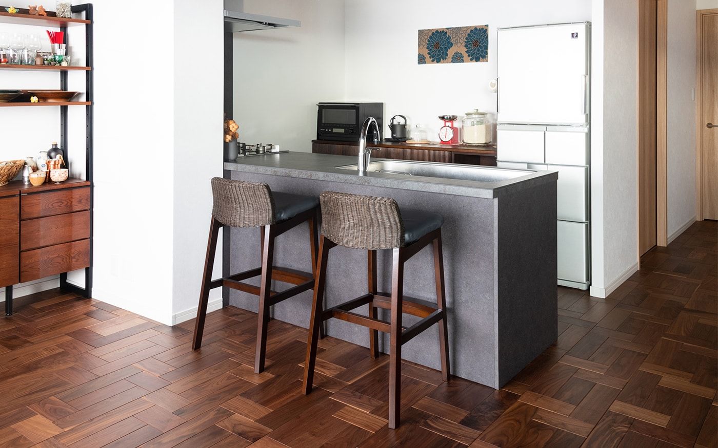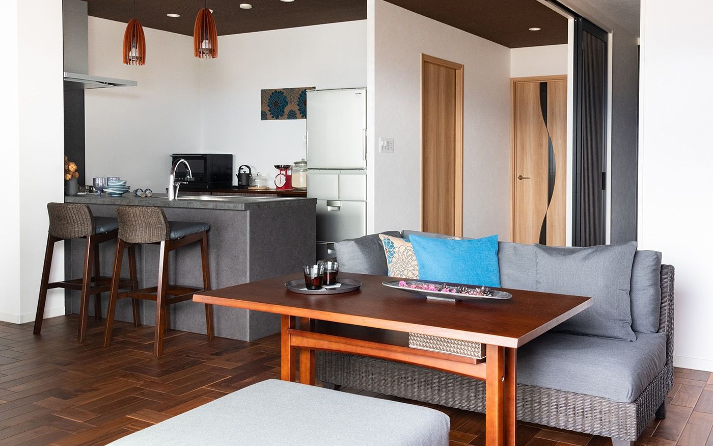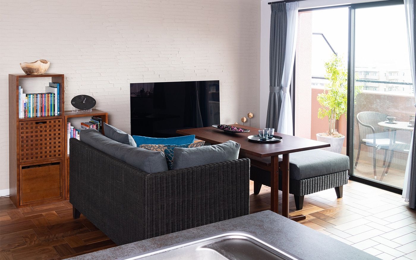 すっきり広々とした空間を実現するために、寛ぎスペースと食事の2つのスタイルを1つにまとめたソファダイニングセットを取り入れています。洗練感のあるラタン材のソファは、こだわりのリノベーションで仕上げた内装材と綺麗に調和しました。