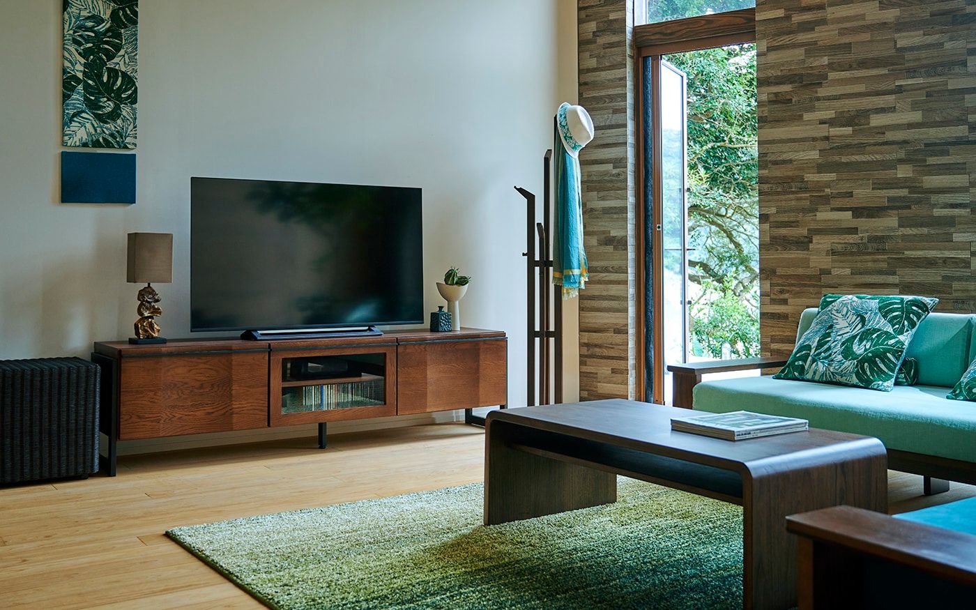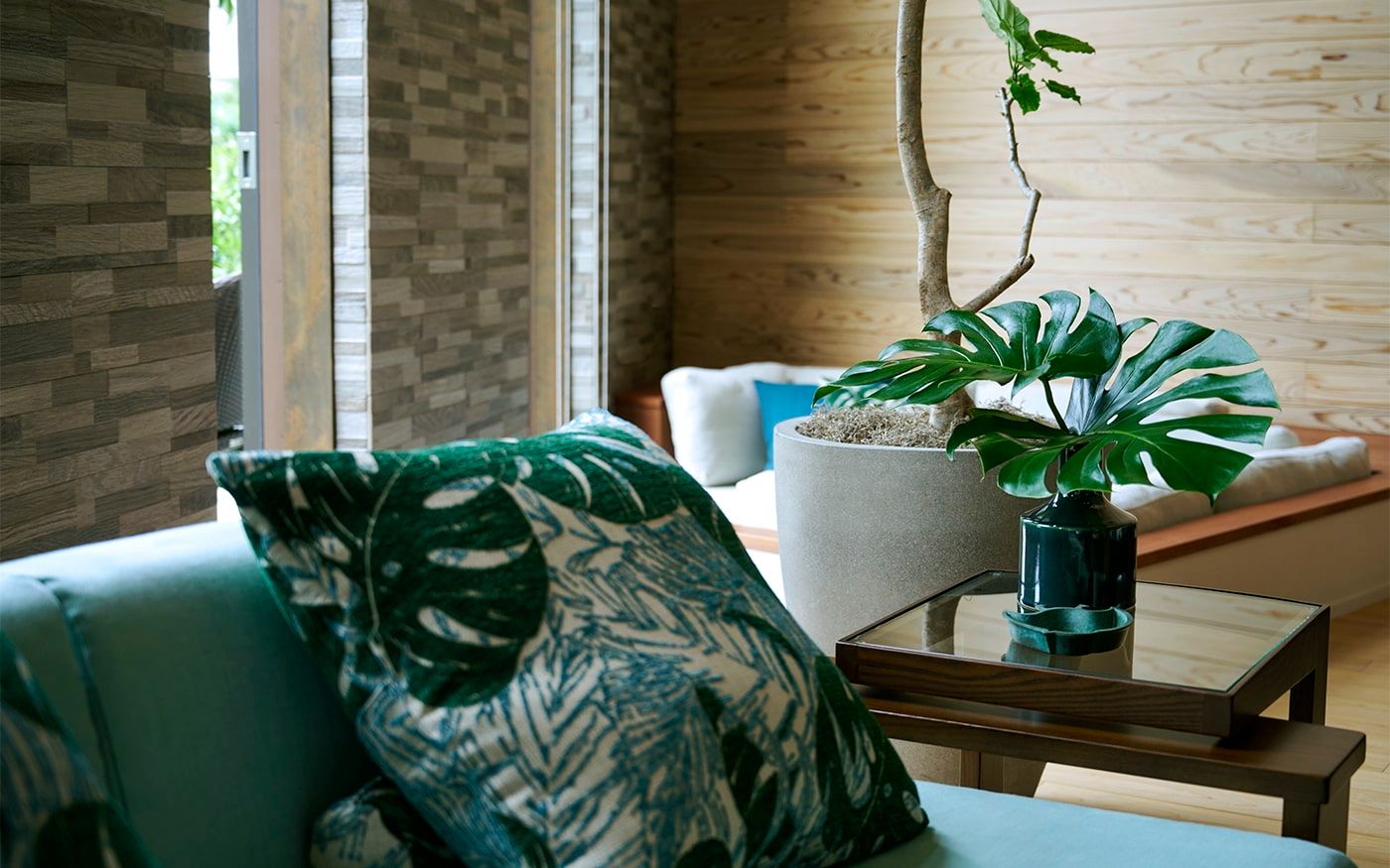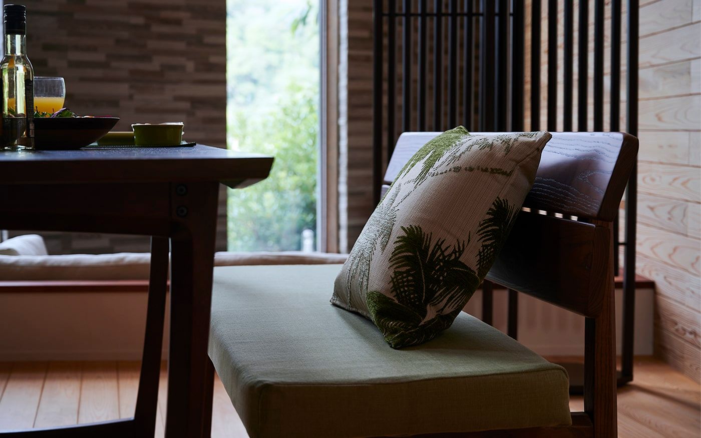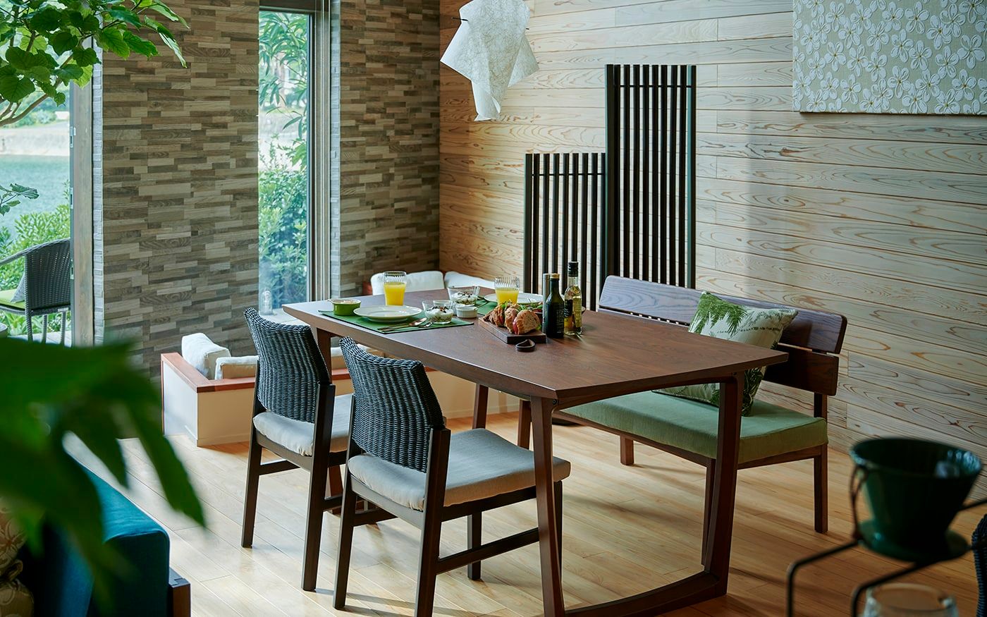 リゾートで充実した1日を送るには、穏やかな朝食の時間も大事です。背付きのダイニングベンチを取り入れることでゆったりした朝食を過ごしながら、ヤシ柄クッションでアクセントを楽しむことも。グリーンと馴染みやすいラタンのチェアをプラスして、優雅なモーニングタイムを楽しんでください。