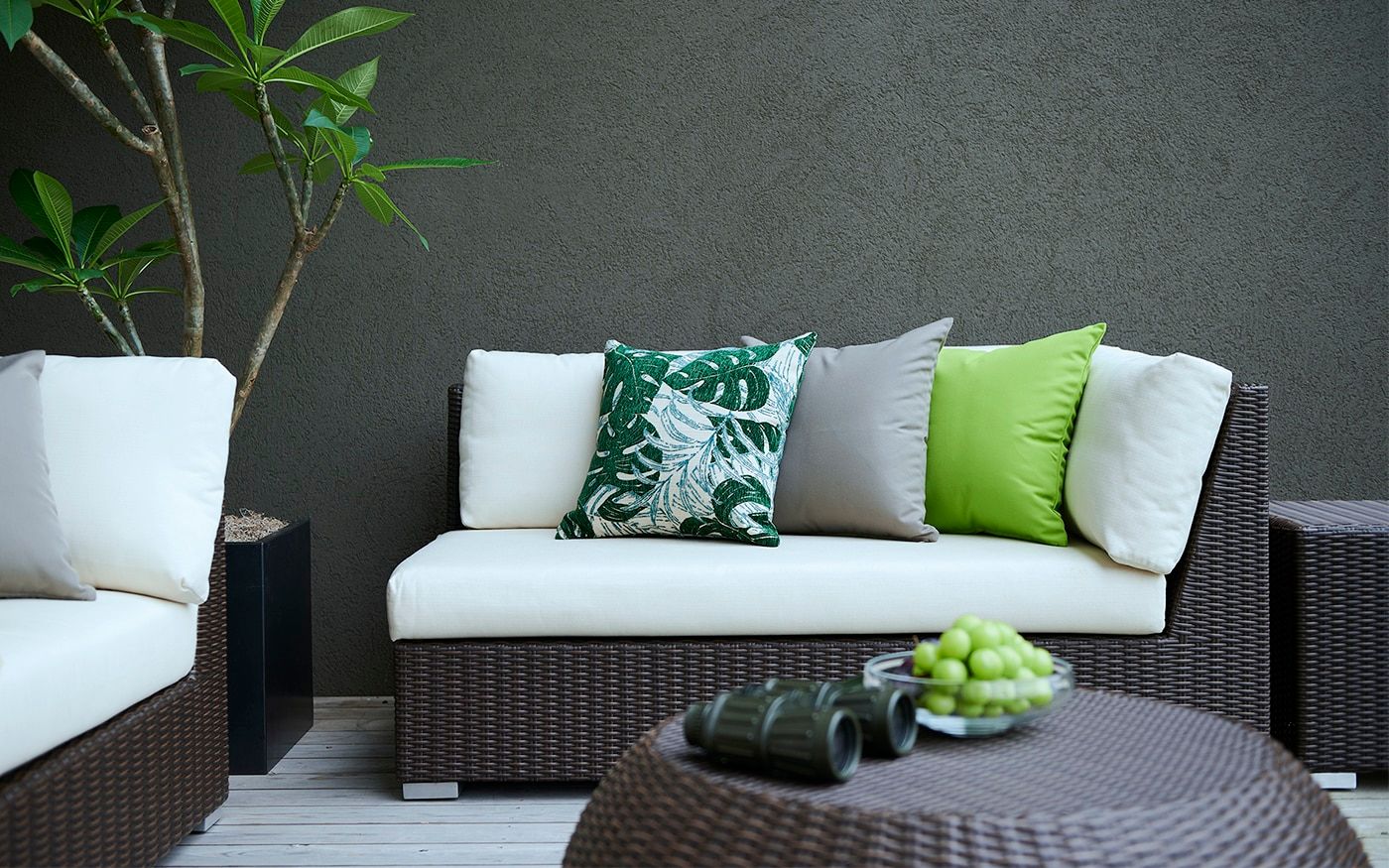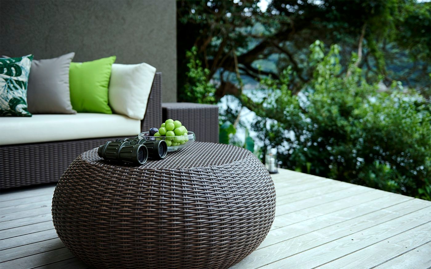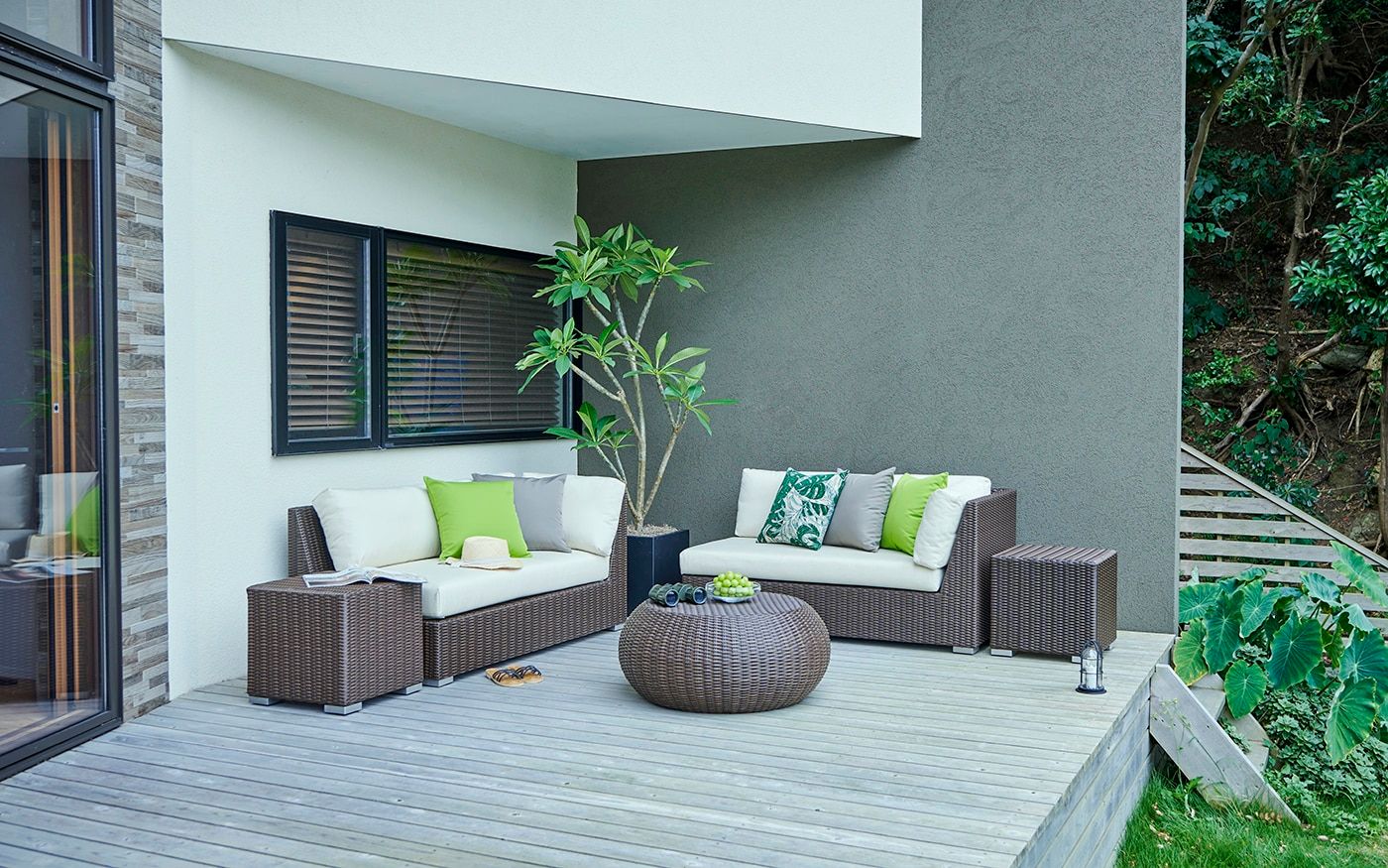 ご家族や二人で開放的な朝の空気感を楽しめる屋外用ソファを置けば、まるでリゾート地のようなスペースが実現。TPライムなどの爽やかな色合いのクッションやチェアカバーを添えることで、モーニンググリーンのカラーコーディネートが叶います。