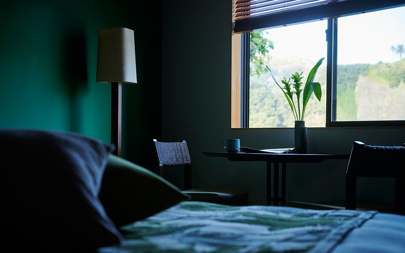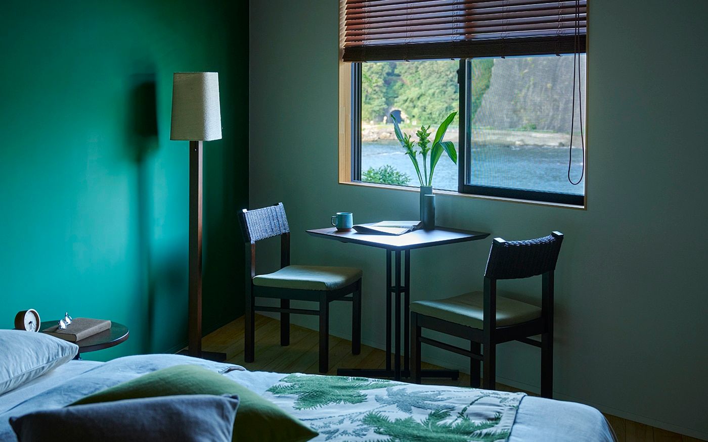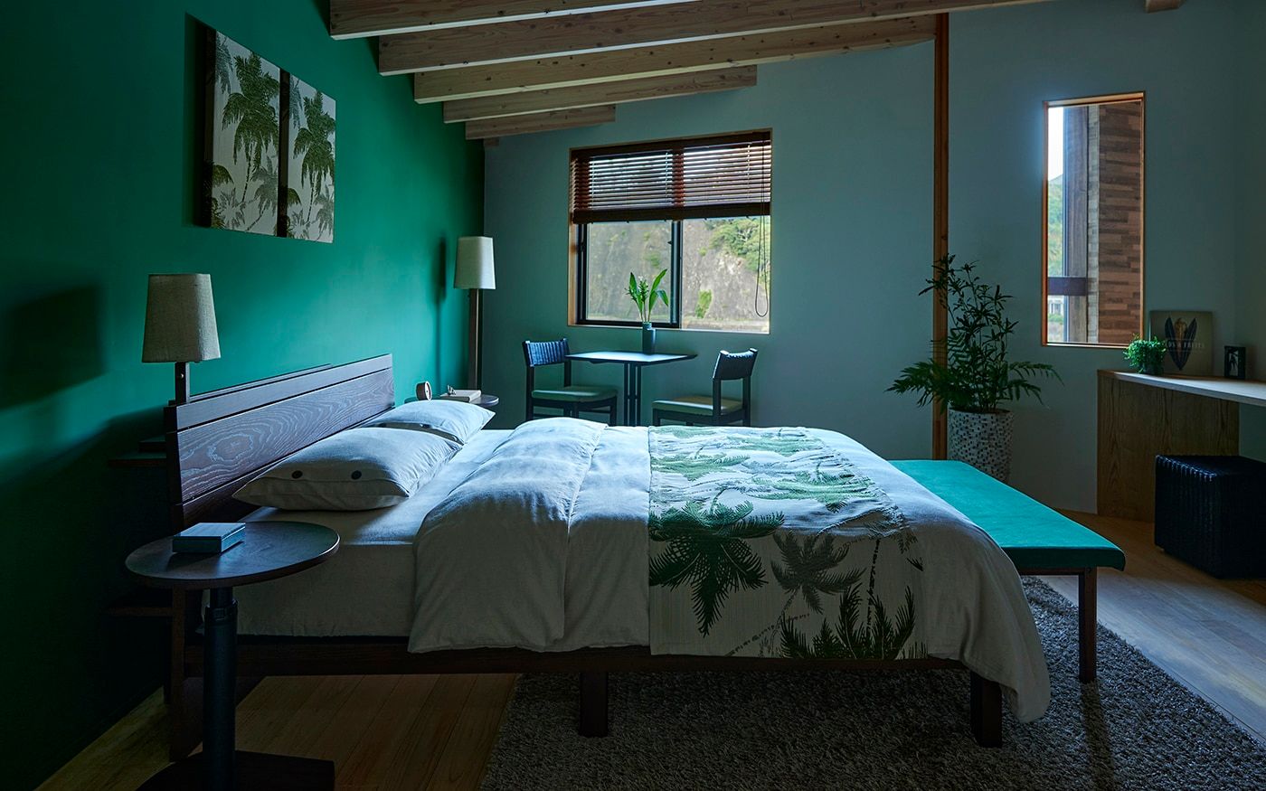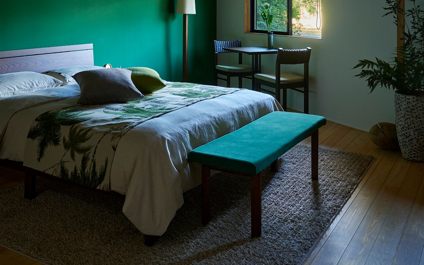 ベッドスローや壁面装飾に、PRグリーンのヤシ柄ファブリックを大胆にあしらって、相性のよいグリーンのクッションを添えれば「モーニンググリーン」の寝室に。ベッド周りにフットベンチやサイドテーブルも置いて、ホテルライクな空間を楽しみましょう。