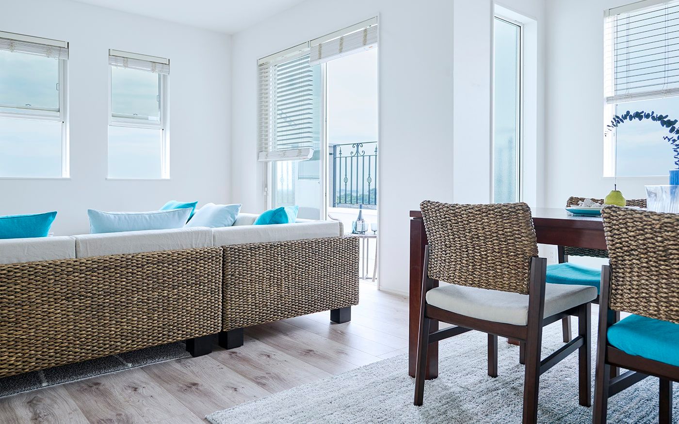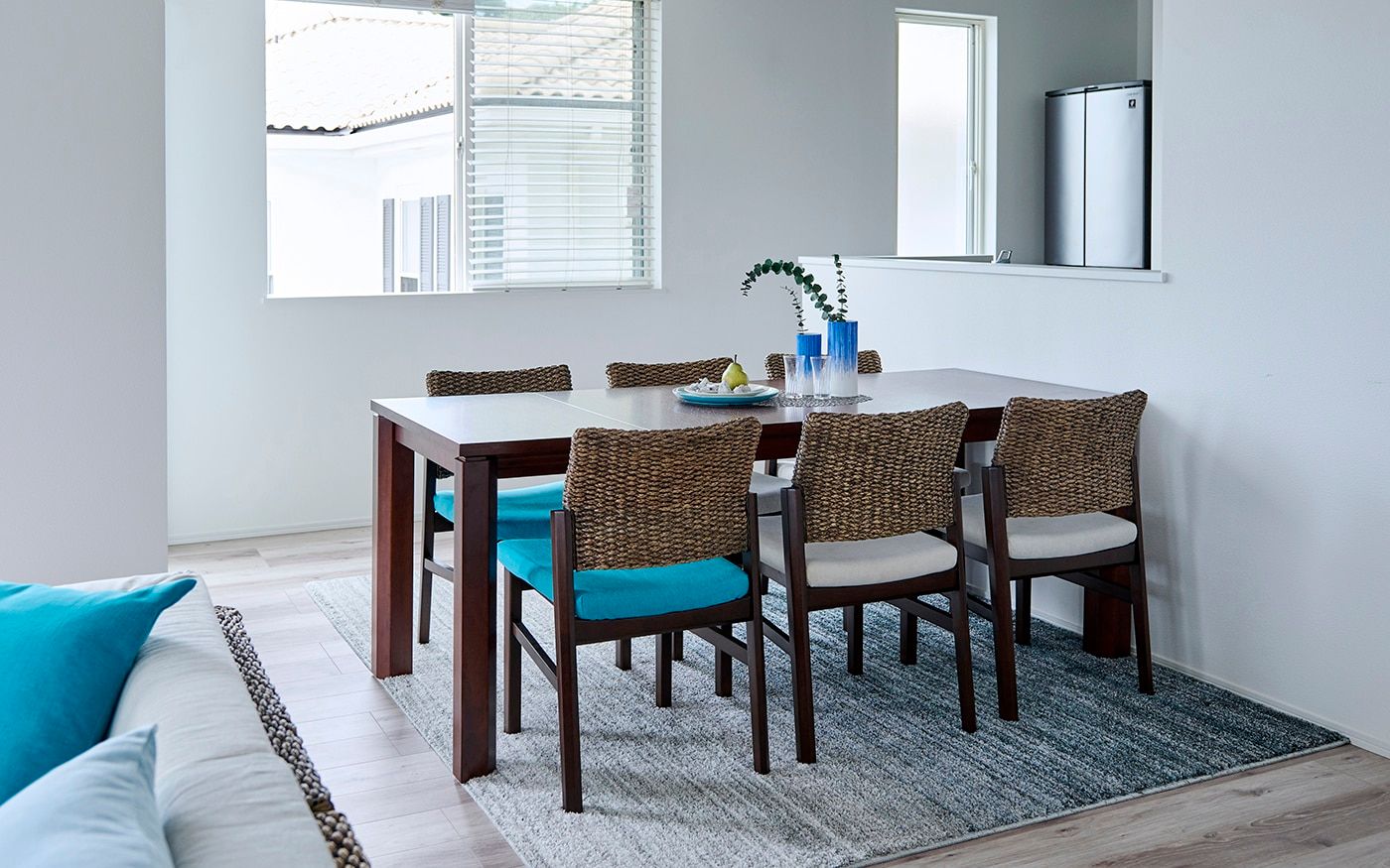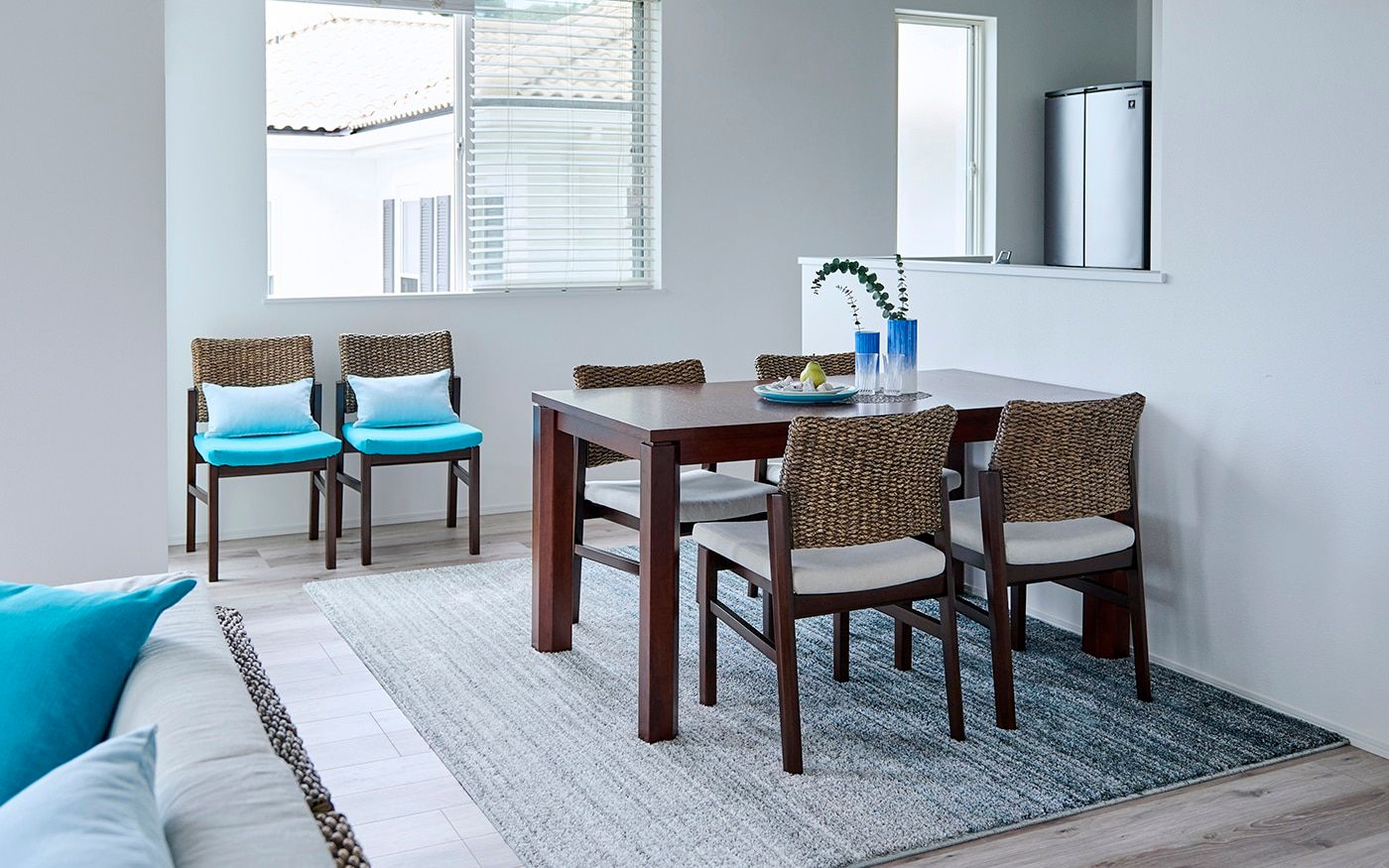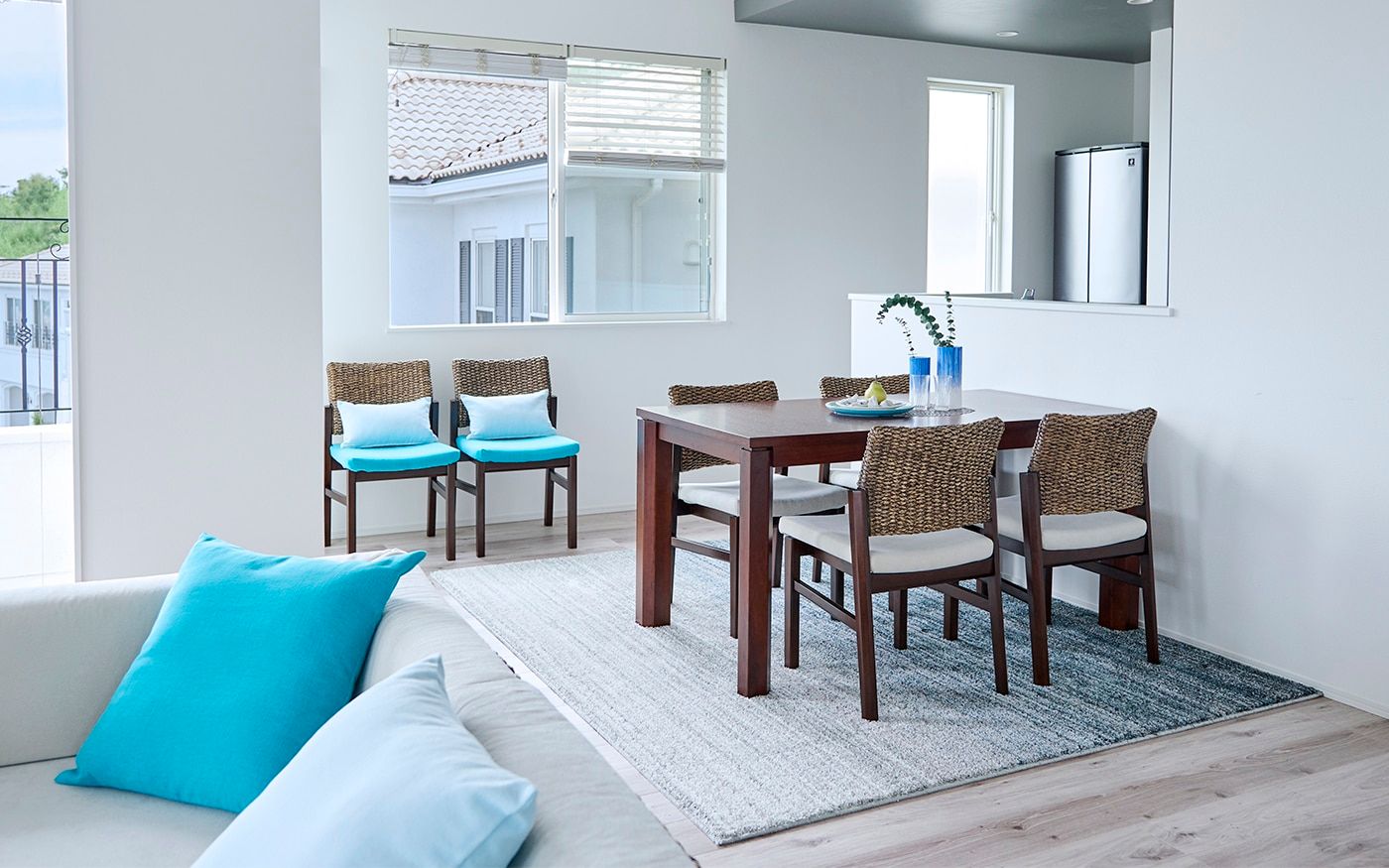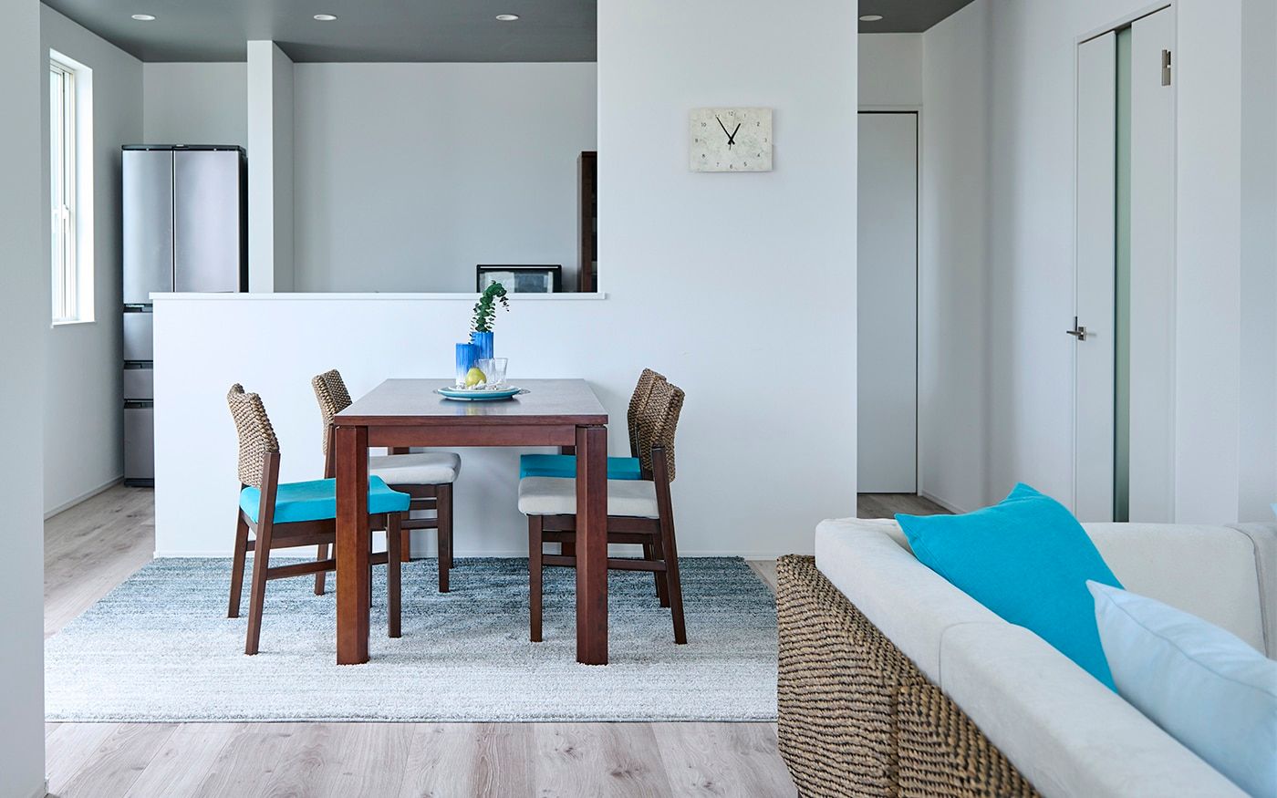 昼間のみずみずしい光で景色が鮮明に見えるリビングダイニング。海をイメージしたブルーのコーディネートでリゾート気分が上がります。リビングとダイニングの家具の素材や色を合わせることで、統一感のある爽やかなリビングダイニングの完成です。