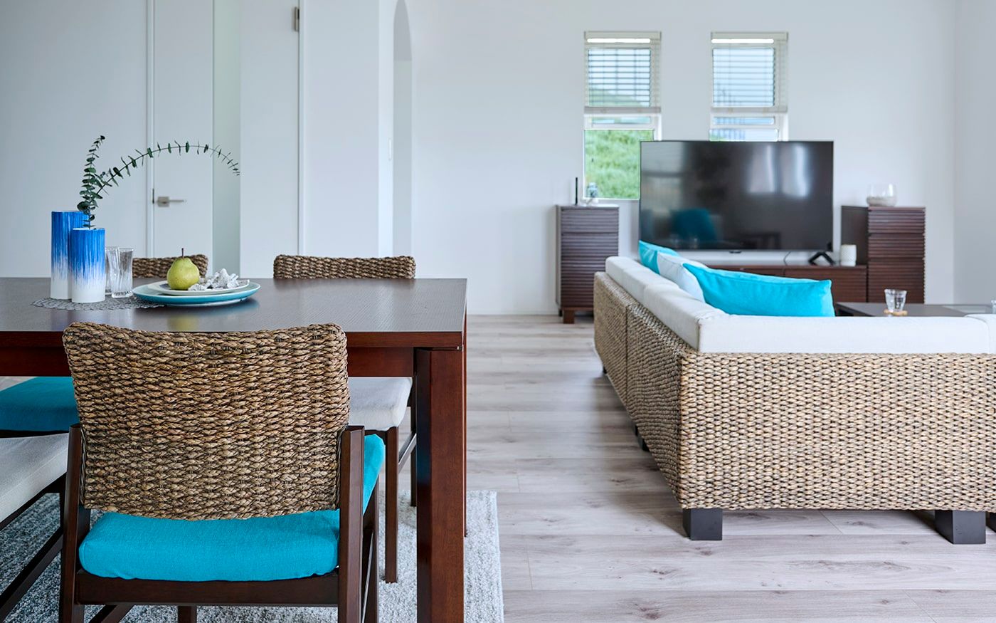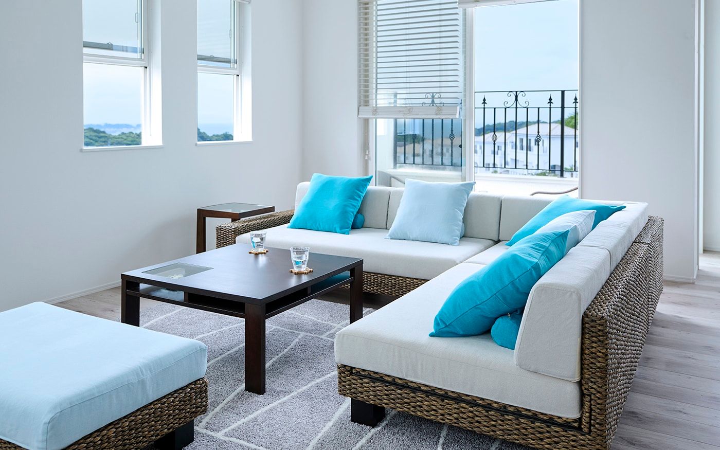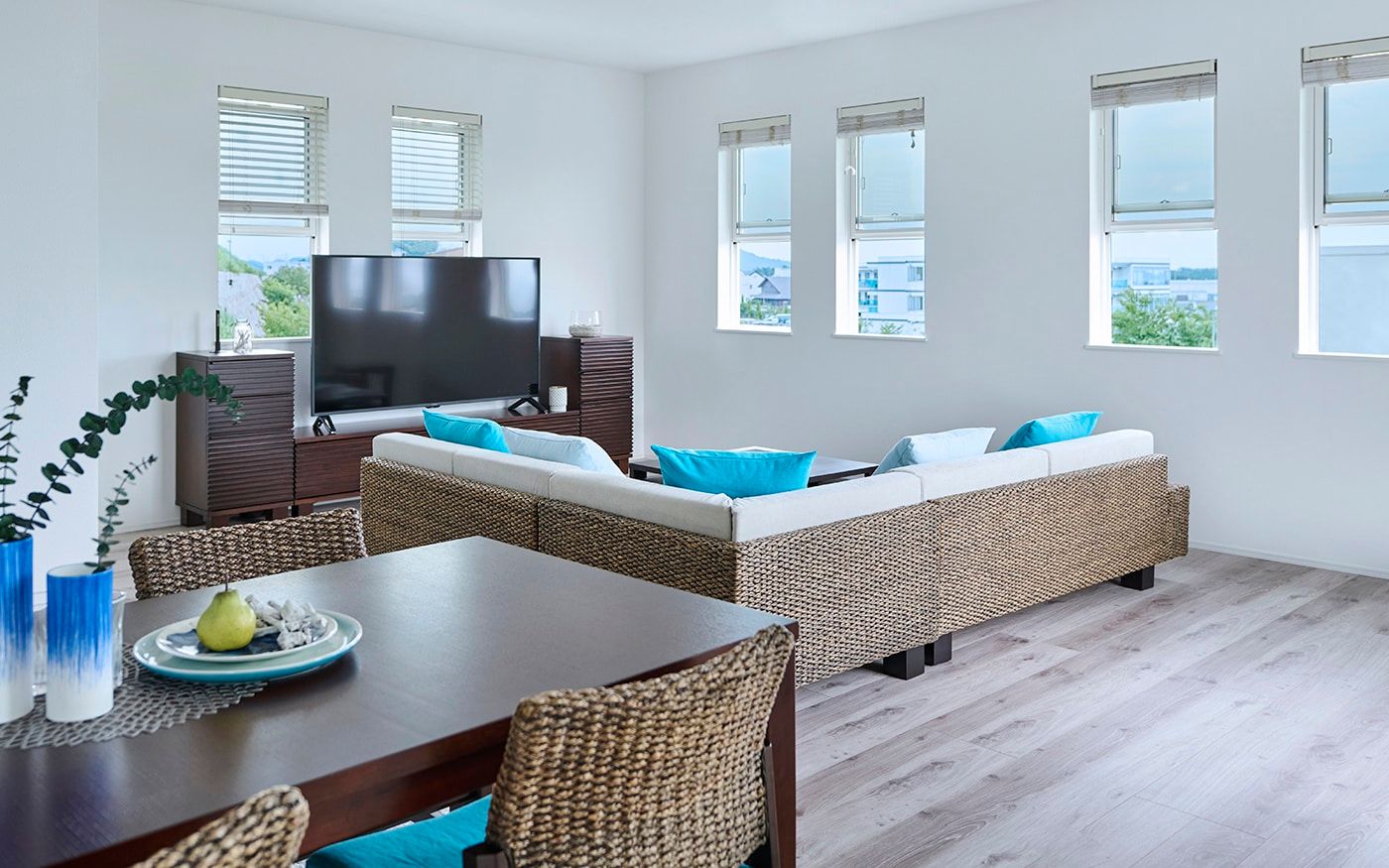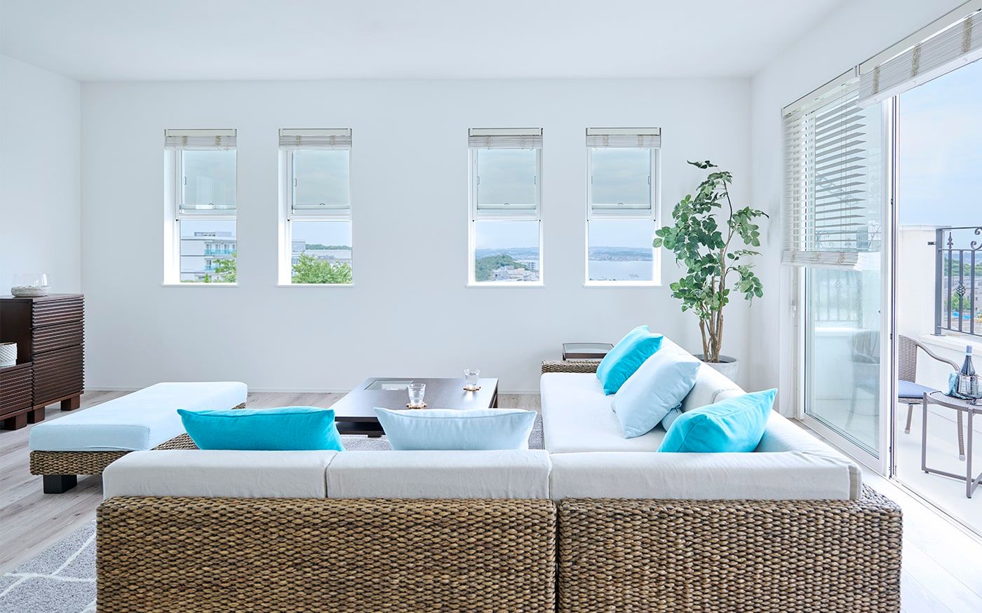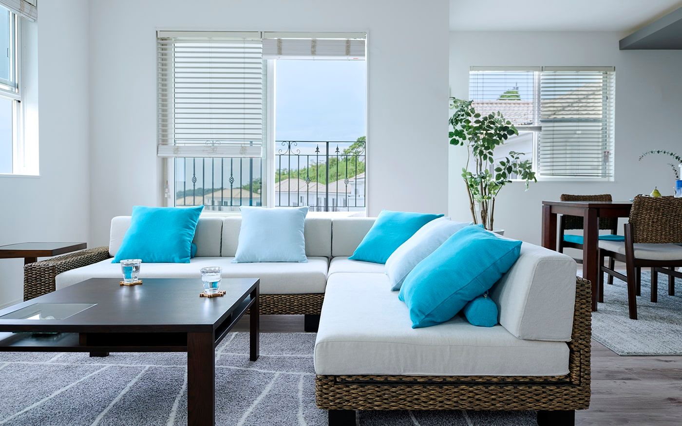 昼間のみずみずしい光で景色が鮮明に見えるリビングダイニング。海をイメージしたブルーのコーディネートでリゾート気分が上がります。リビングとダイニングの家具の素材や色を合わせることで、統一感のある爽やかなリビングダイニングの完成です。
