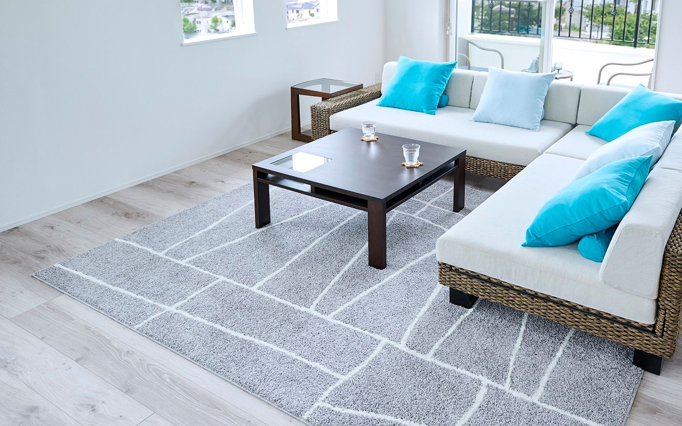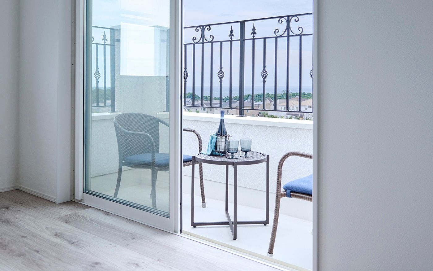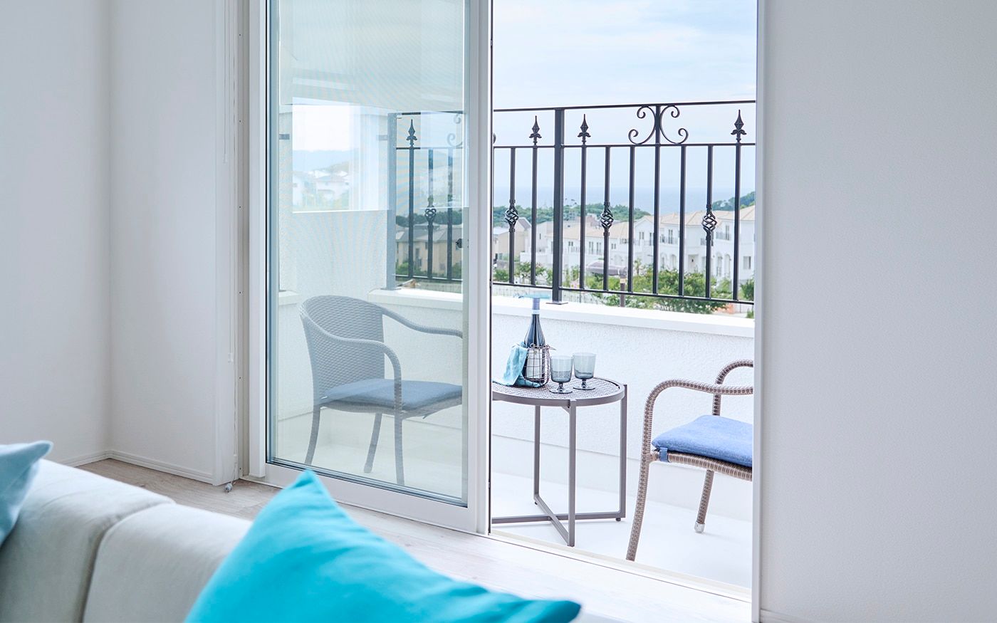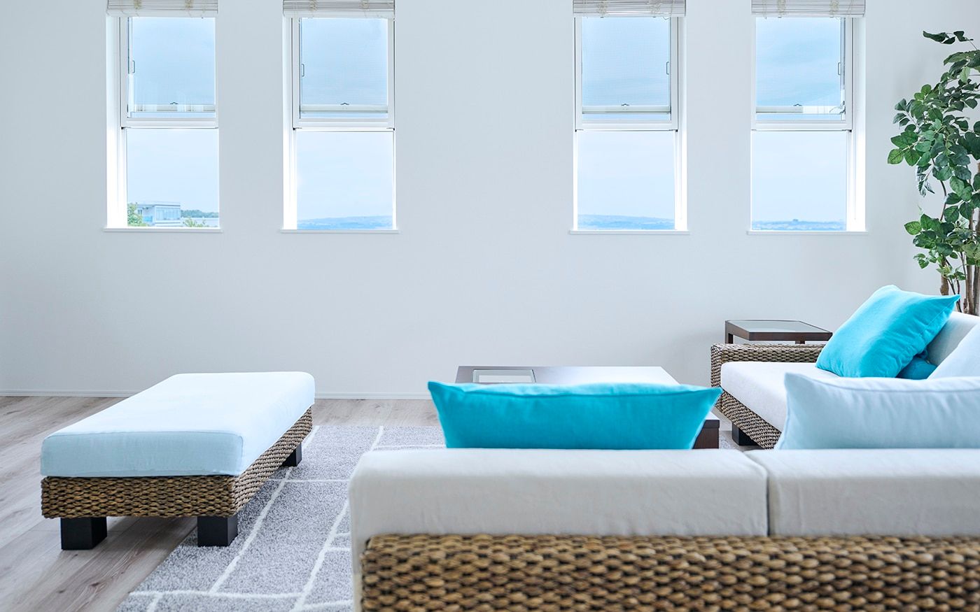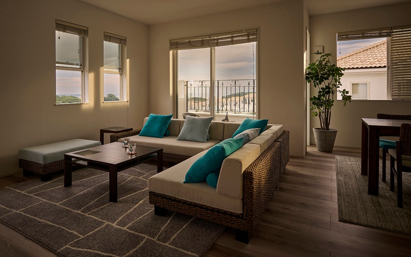 昼間のみずみずしい光で景色が鮮明に見えるリビングダイニング。海をイメージしたブルーのコーディネートでリゾート気分が上がります。リビングとダイニングの家具の素材や色を合わせることで、統一感のある爽やかなリビングダイニングの完成です。