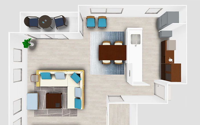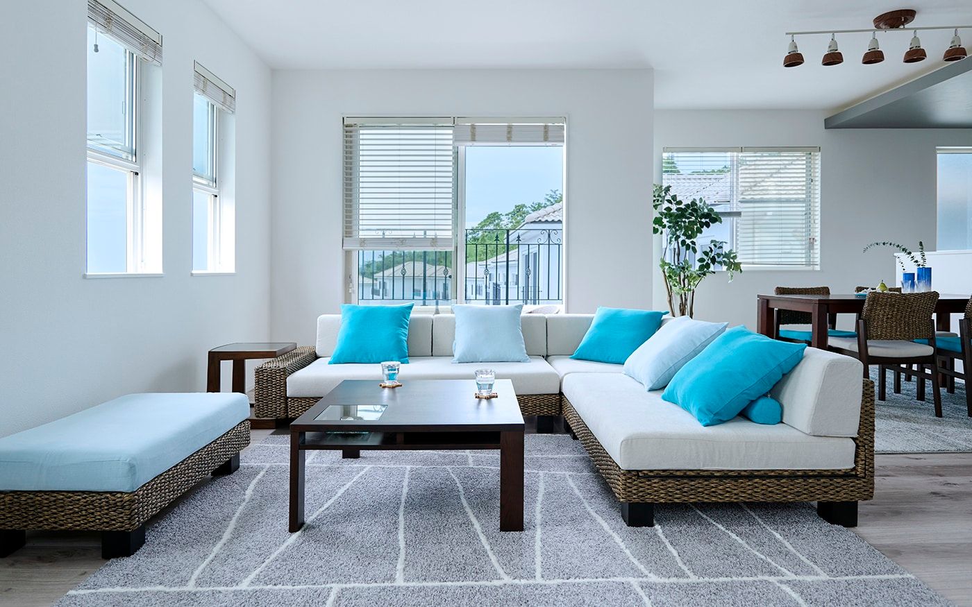 昼間のみずみずしい光で景色が鮮明に見えるリビングダイニング。海をイメージしたブルーのコーディネートでリゾート気分が上がります。リビングとダイニングの家具の素材や色を合わせることで、統一感のある爽やかなリビングダイニングの完成です。