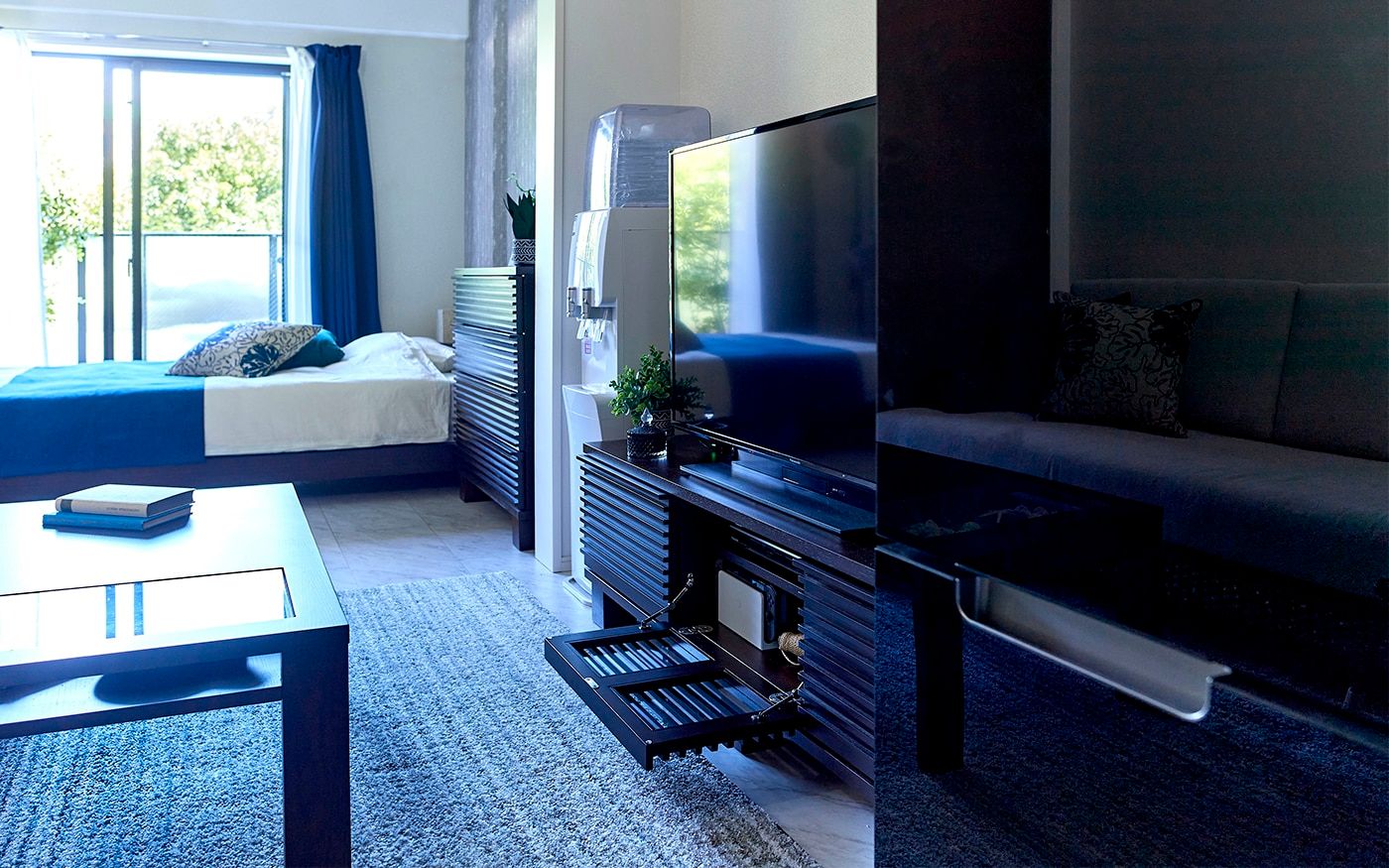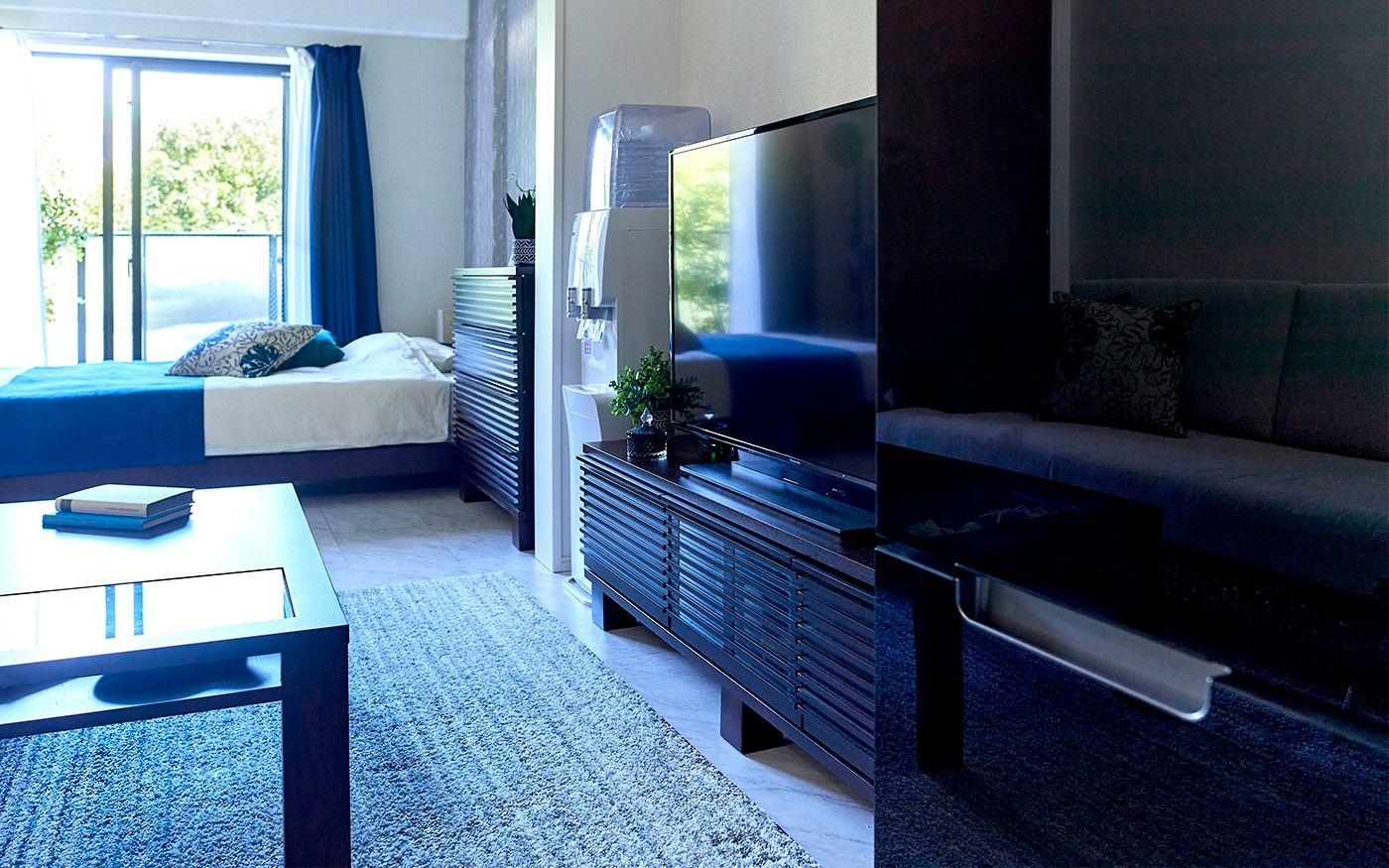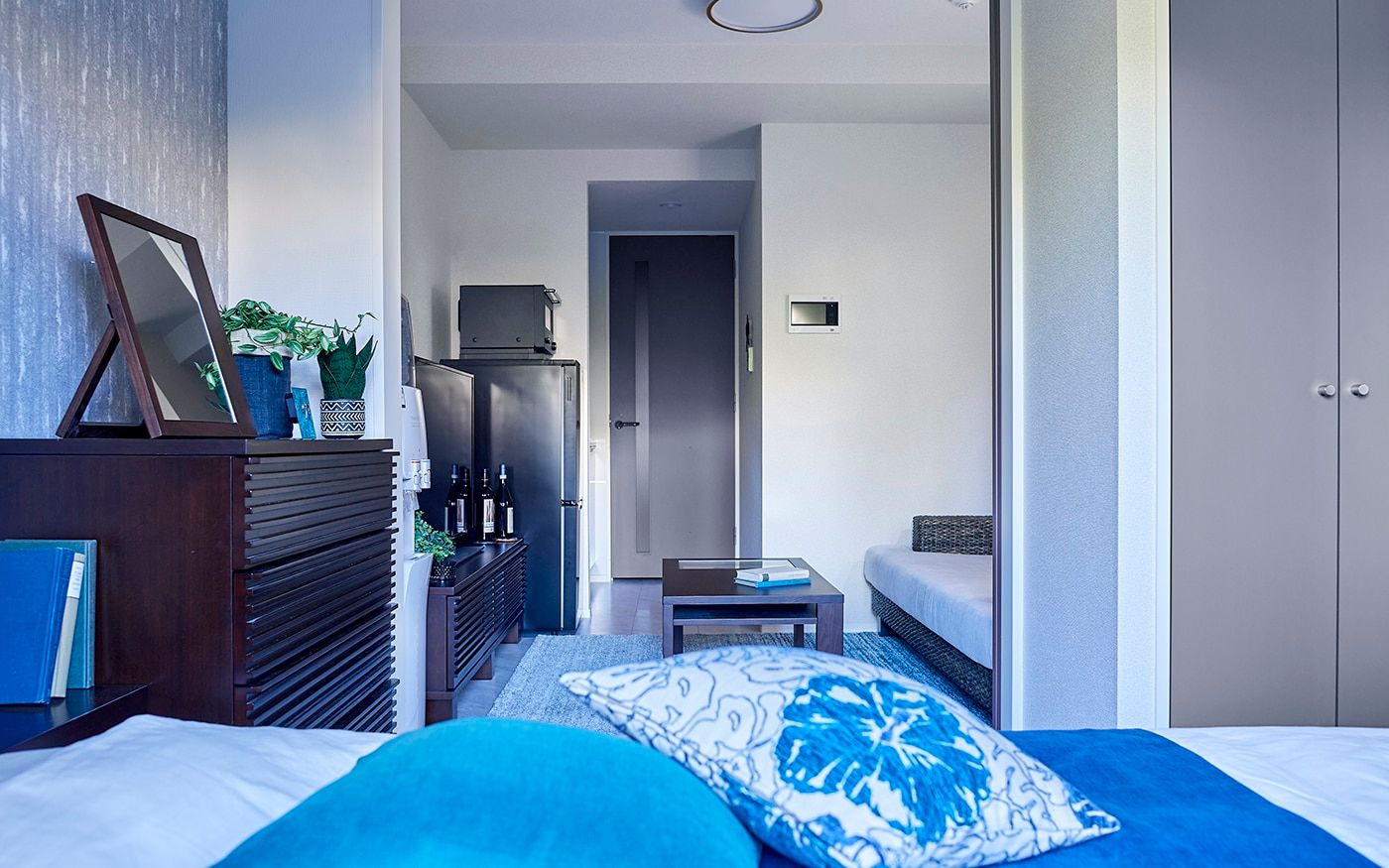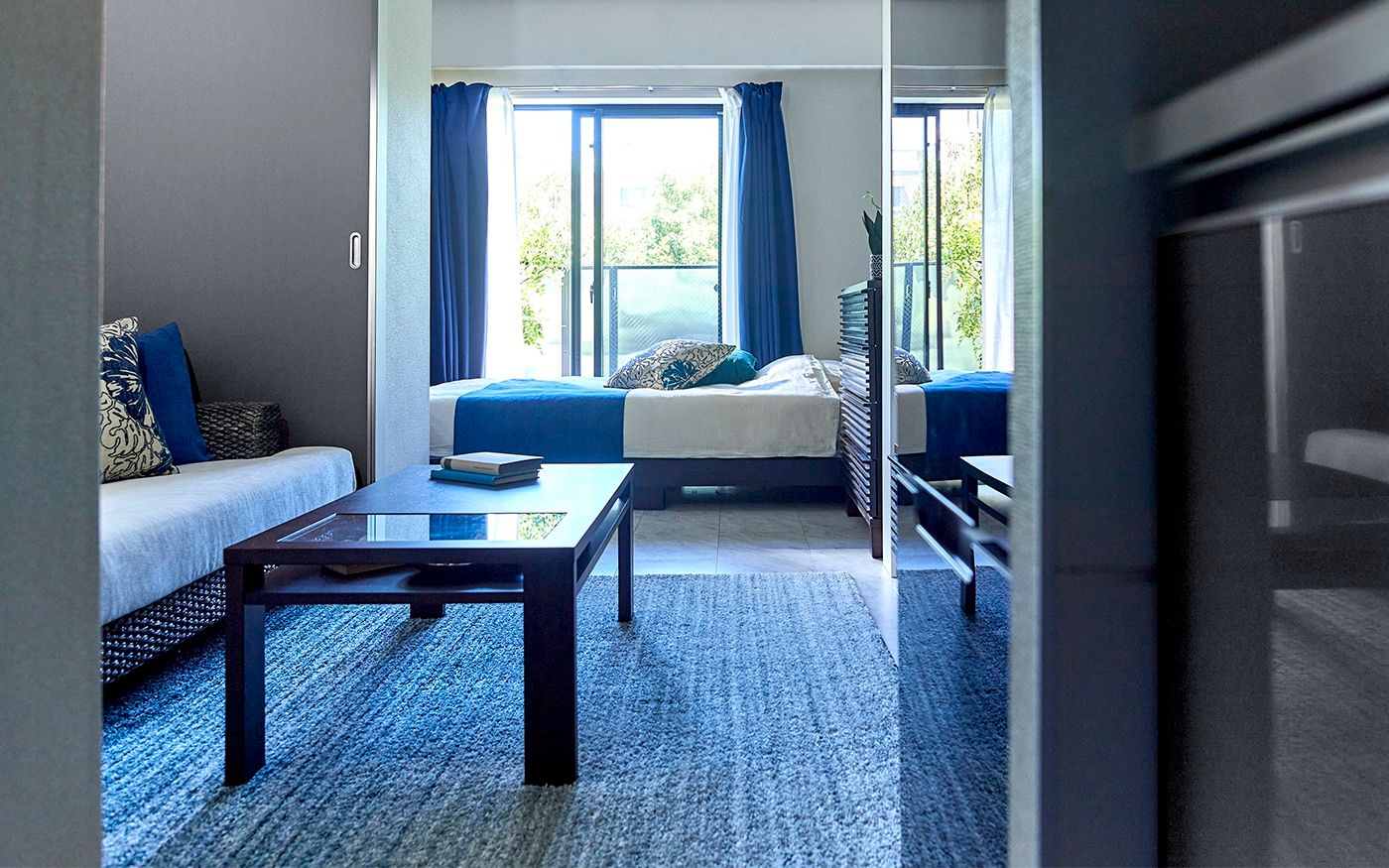 コンパクトな1DKでも寛げる2.5人掛けのソファが主役のレイアウトを組みました。また、ソファに座った時に目に入るローテーブルやテレビ台、リゾートっぽいカラーコーデにもこだわって、充実したDKに仕上げています。落ち着いたブルーとハイビスカス柄でまとめた配色が、男性らしいクールで魅力的な部屋です。