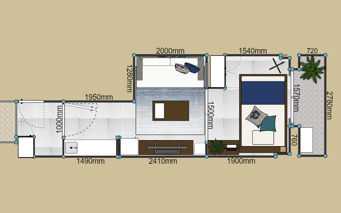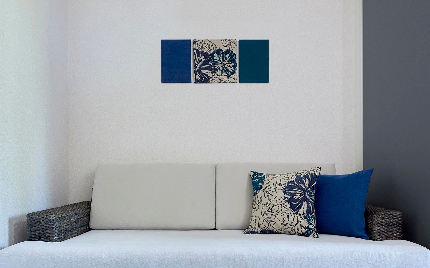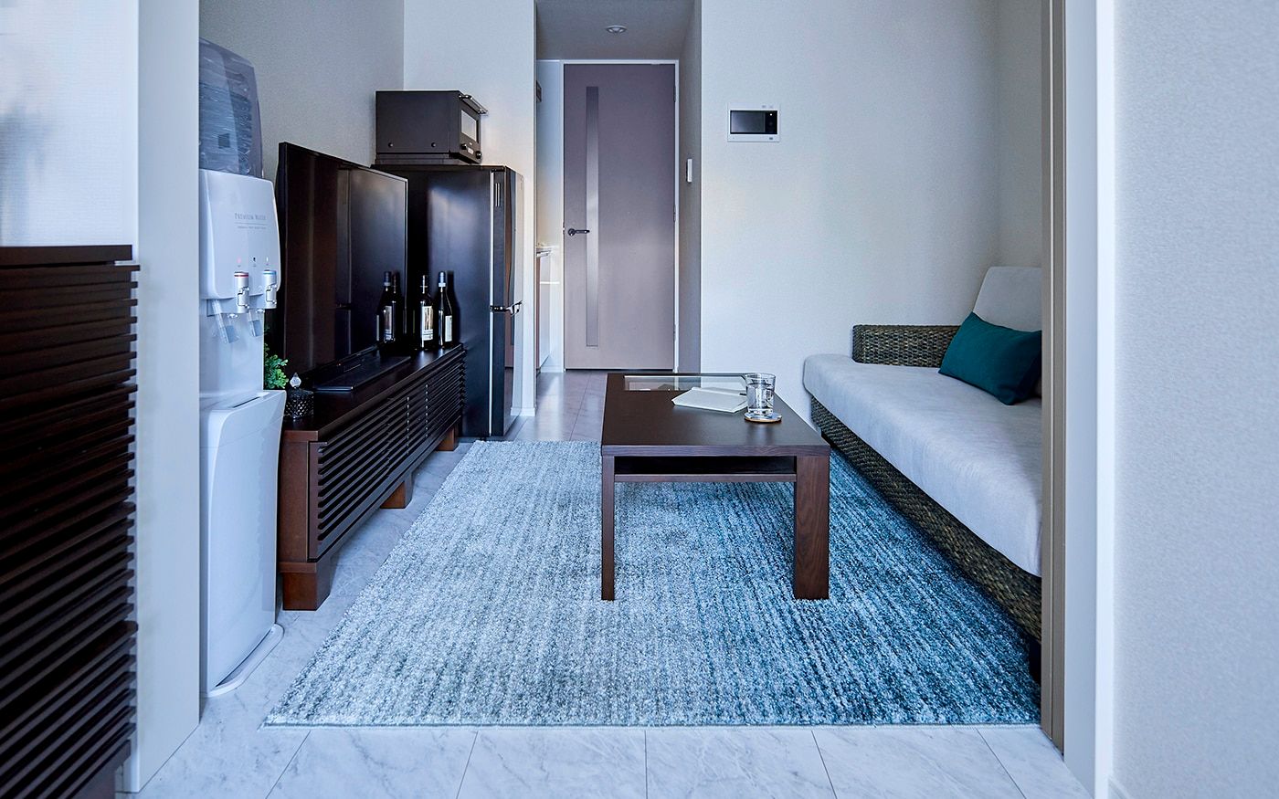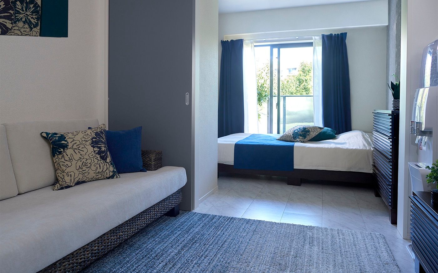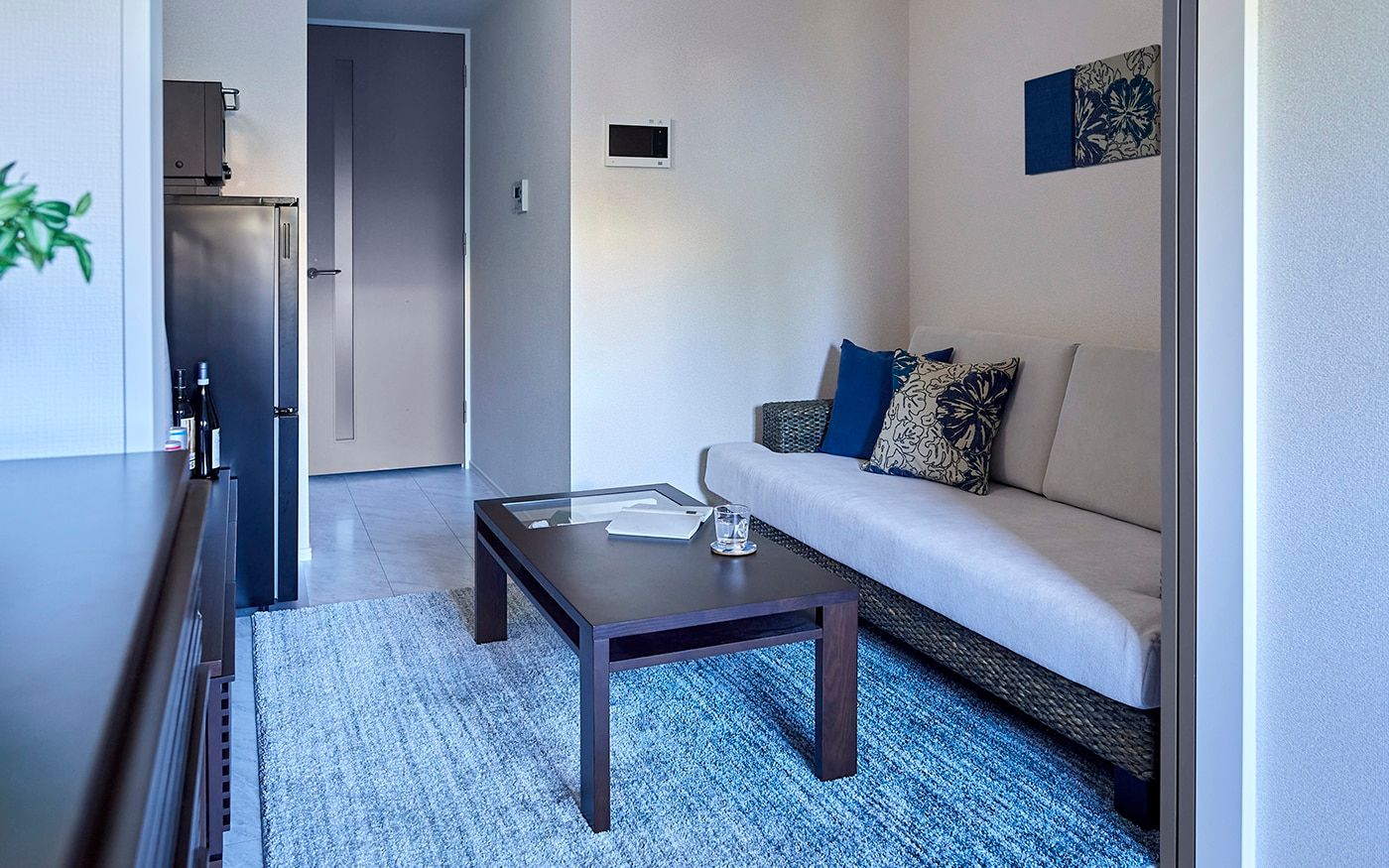 コンパクトな1DKでも寛げる2.5人掛けのソファが主役のレイアウトを組みました。また、ソファに座った時に目に入るローテーブルやテレビ台、リゾートっぽいカラーコーデにもこだわって、充実したDKに仕上げています。落ち着いたブルーとハイビスカス柄でまとめた配色が、男性らしいクールで魅力的な部屋です。