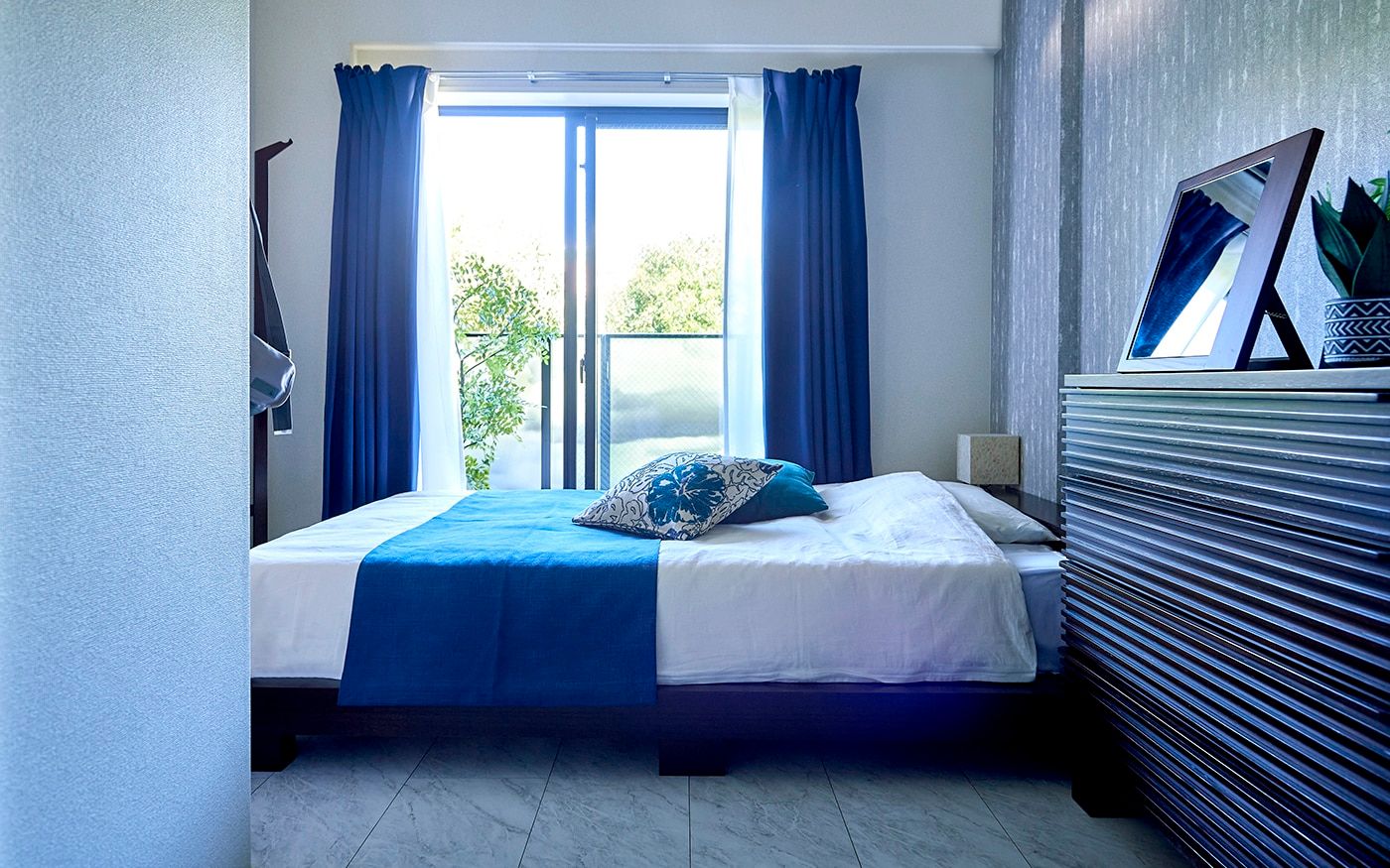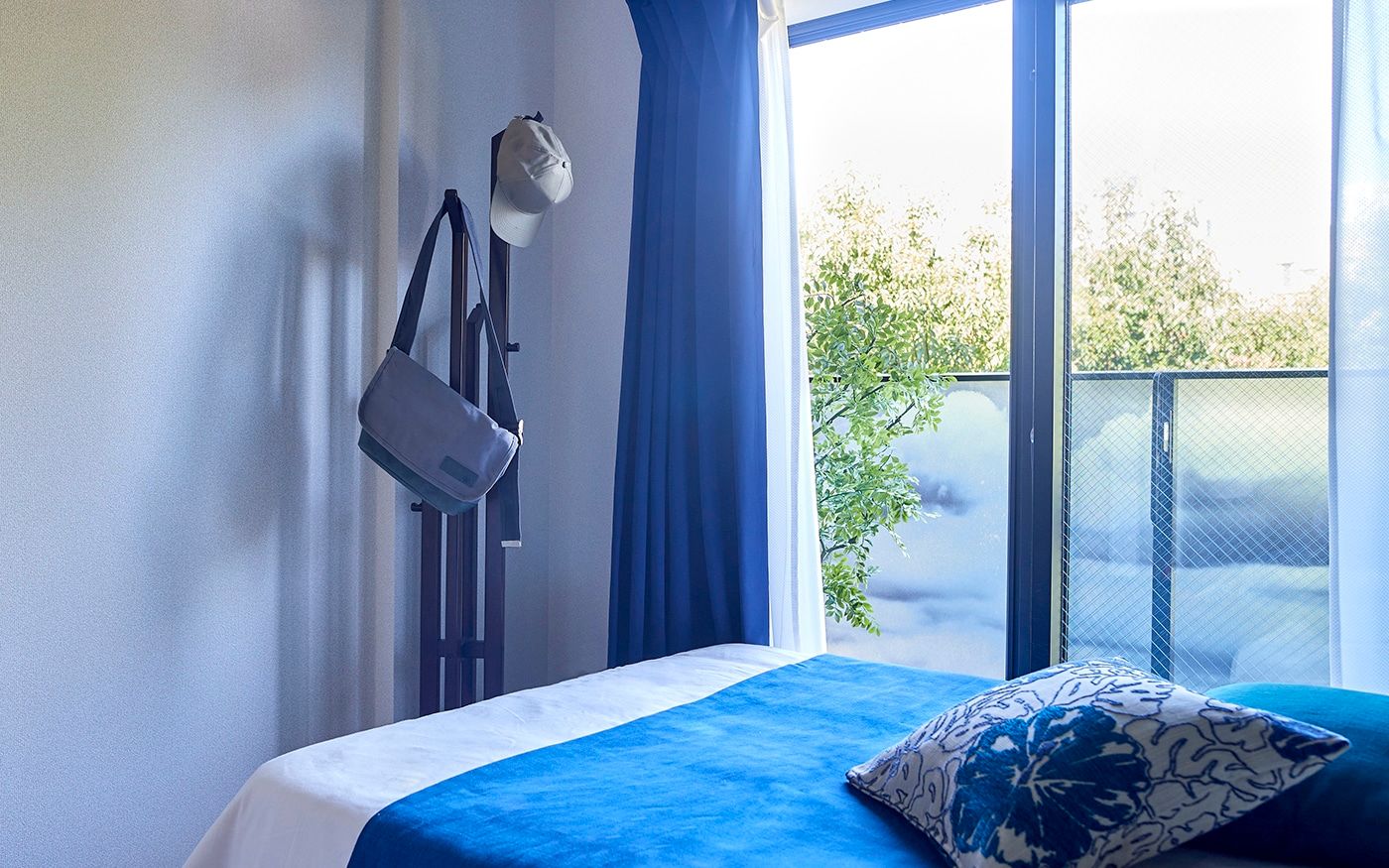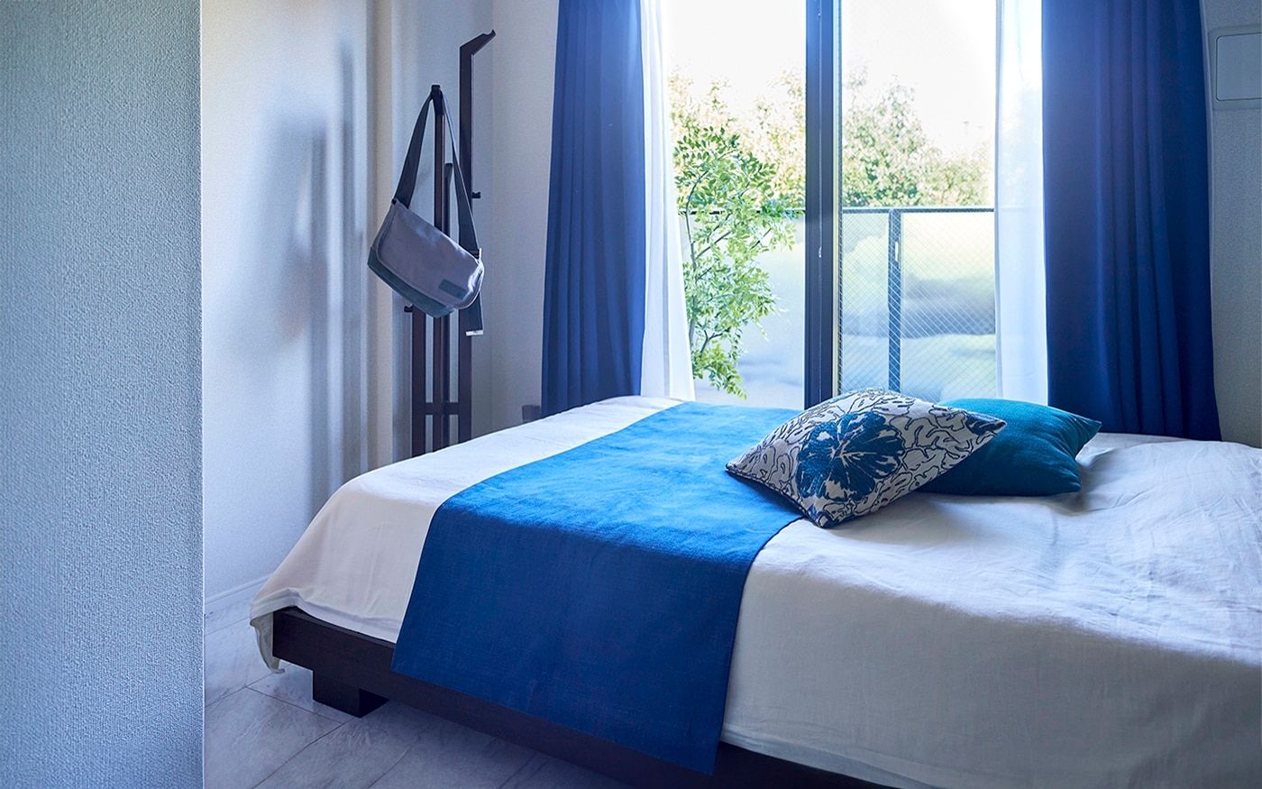 狭い1DKにゆとりを生む「ローベッド」が中心の寝室で、掃き出し窓にかかっても開放感が溢れる空間に。ベッド周りには収納力とインテリア性を兼ね備えたキャビネット、コートハンガーをレイアウトして、ホテルライクな雰囲気で演出しました。