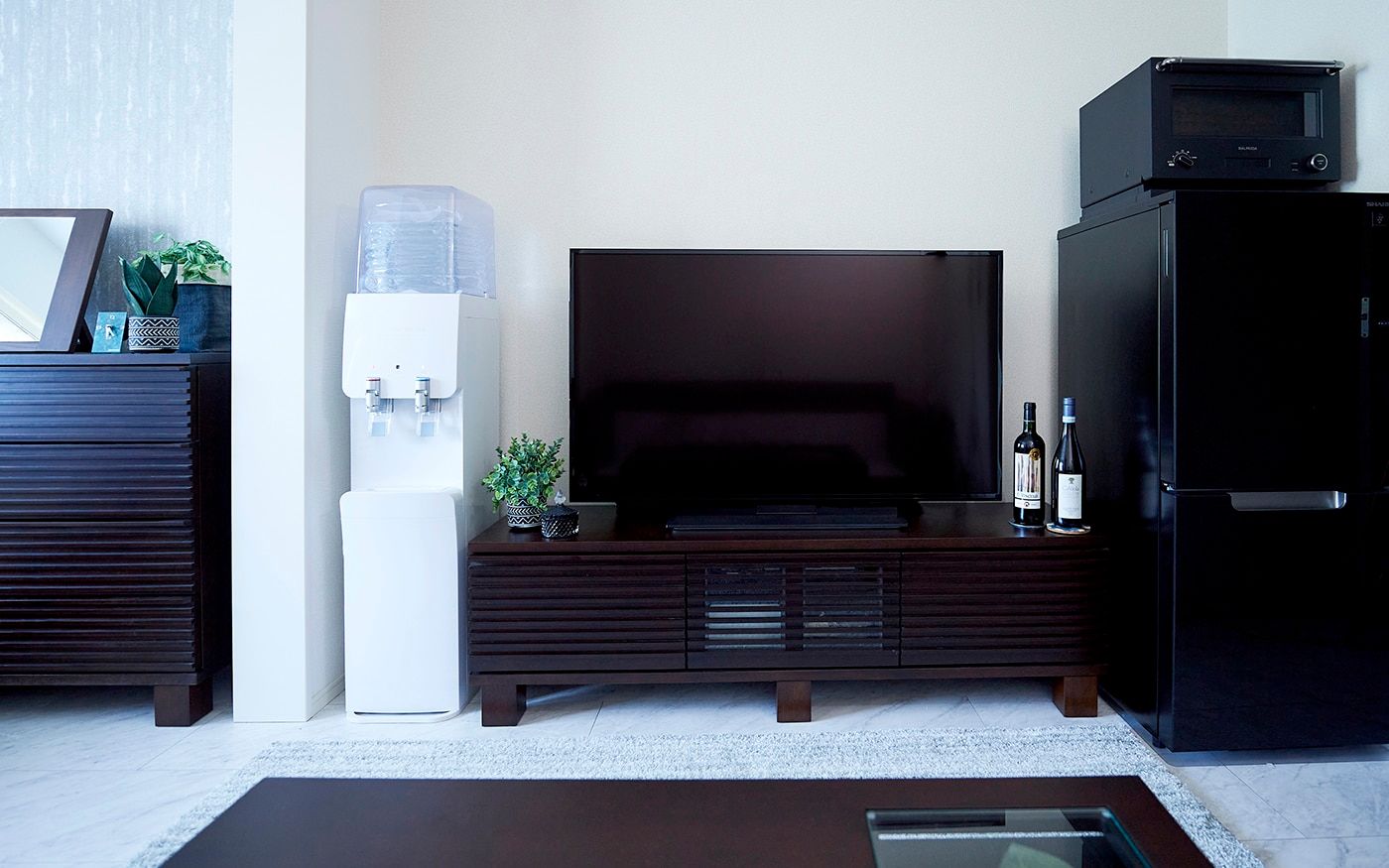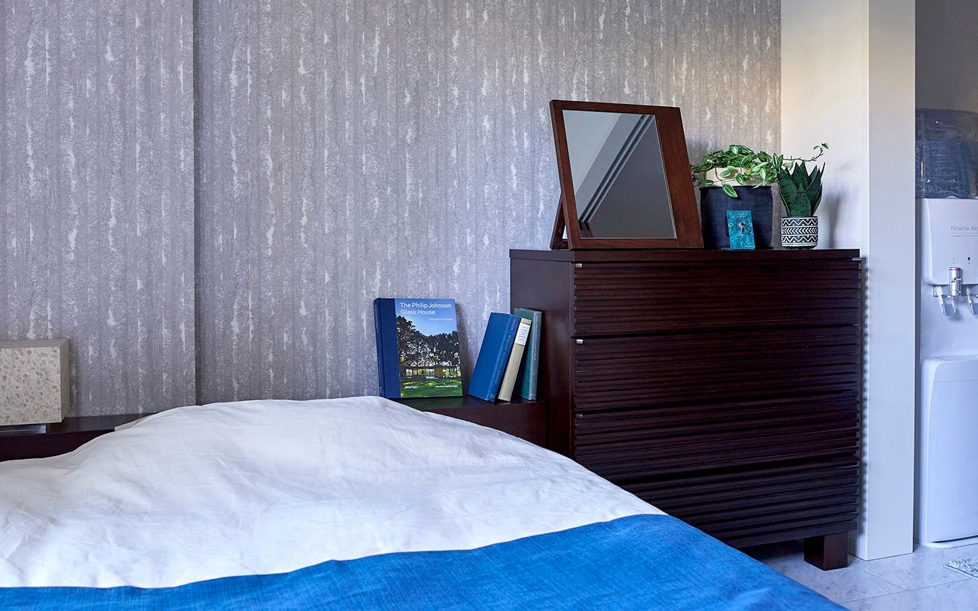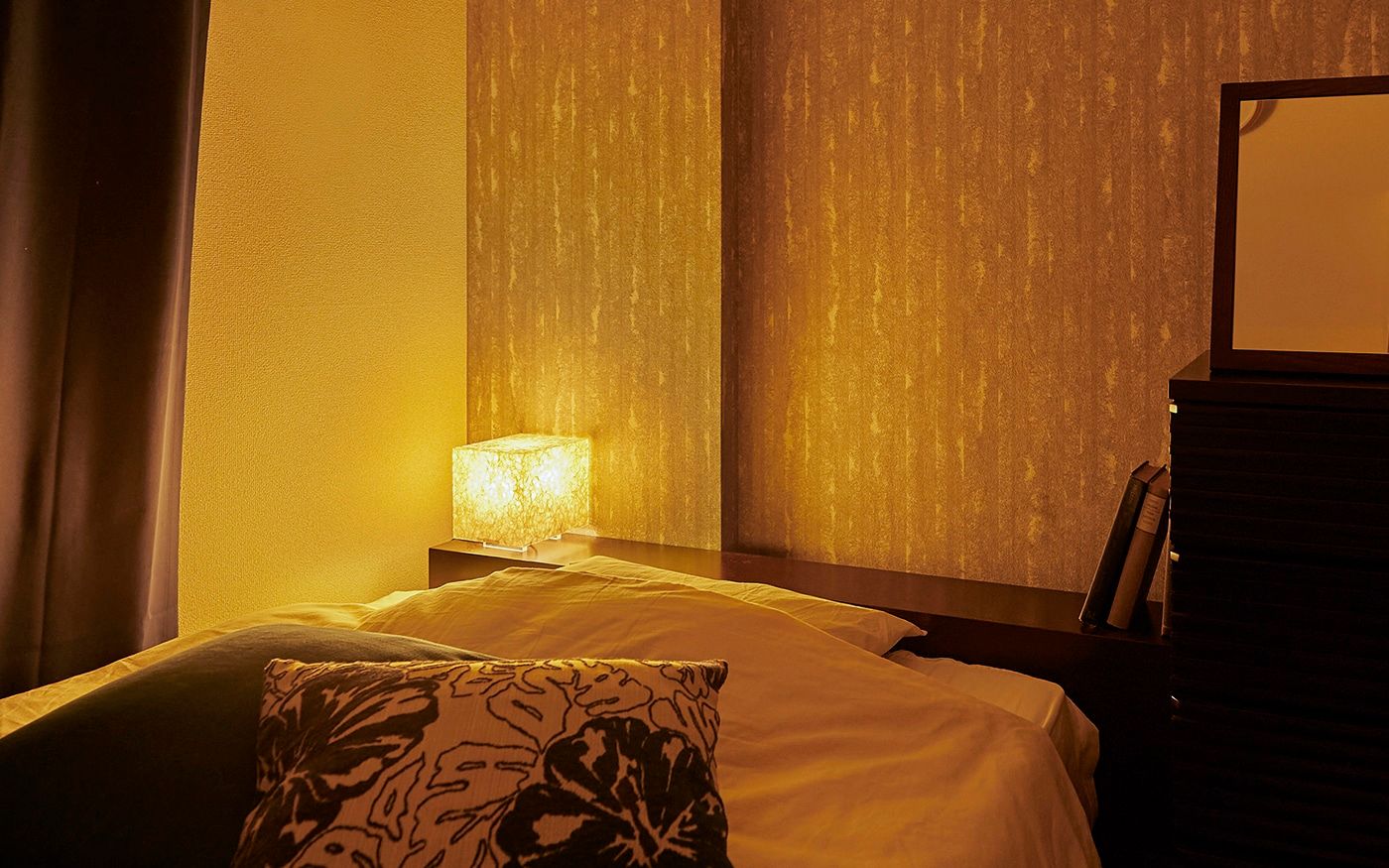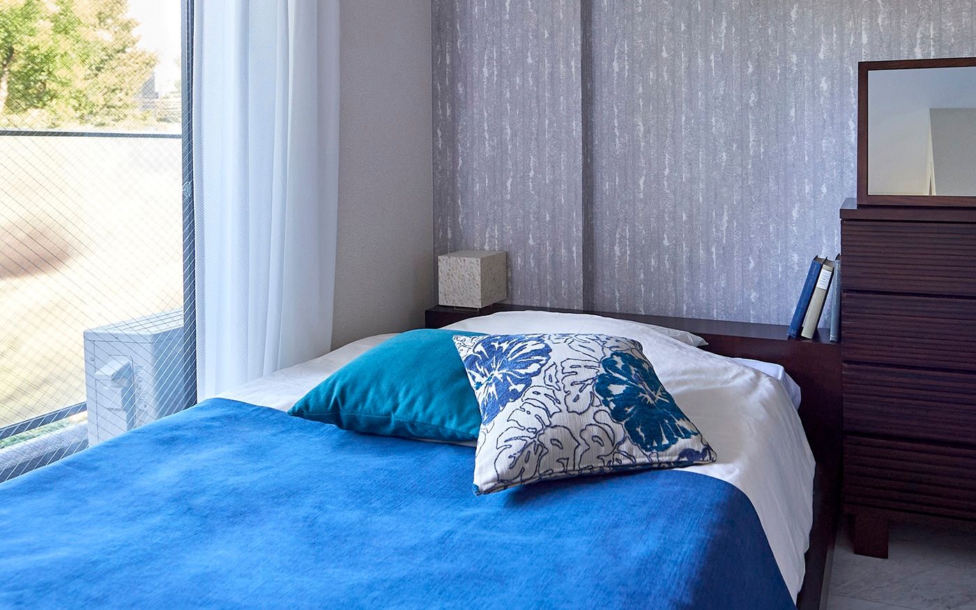 狭い1DKにゆとりを生む「ローベッド」が中心の寝室で、掃き出し窓にかかっても開放感が溢れる空間に。ベッド周りには収納力とインテリア性を兼ね備えたキャビネット、コートハンガーをレイアウトして、ホテルライクな雰囲気で演出しました。