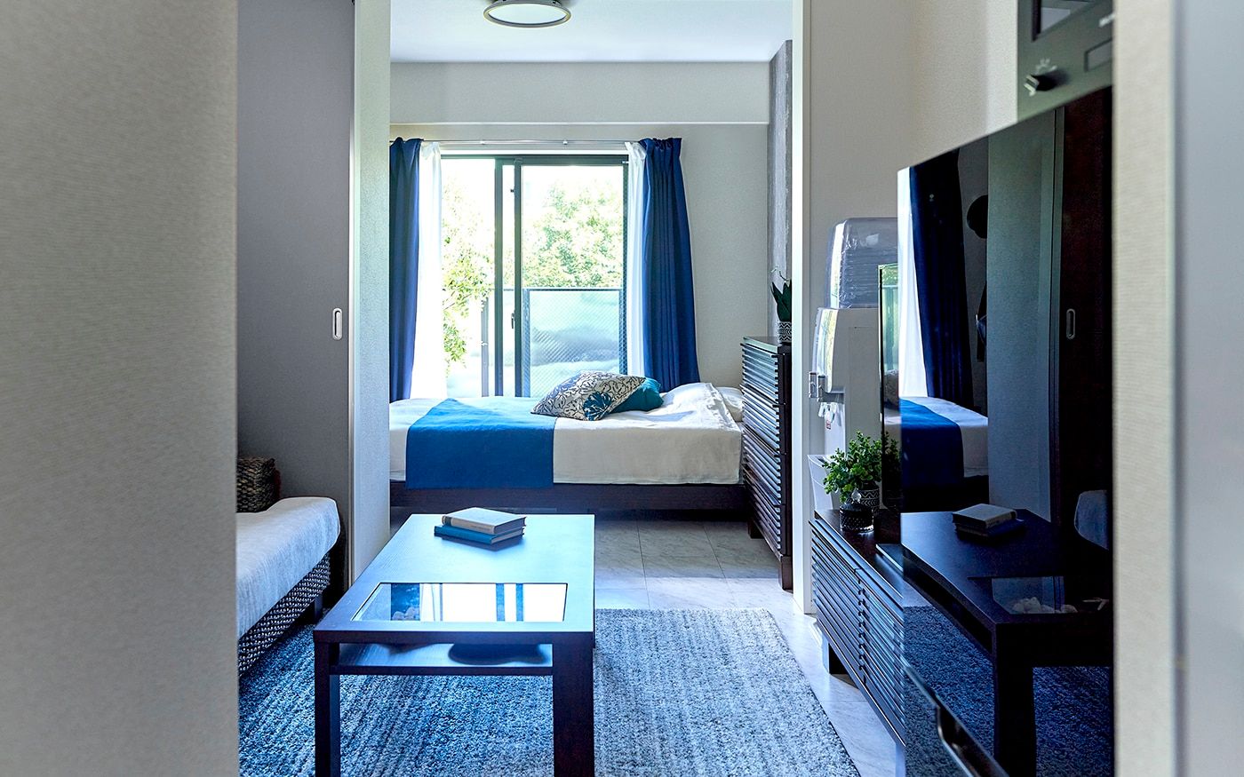 狭い1DKにゆとりを生む「ローベッド」が中心の寝室で、掃き出し窓にかかっても開放感が溢れる空間に。ベッド周りには収納力とインテリア性を兼ね備えたキャビネット、コートハンガーをレイアウトして、ホテルライクな雰囲気で演出しました。