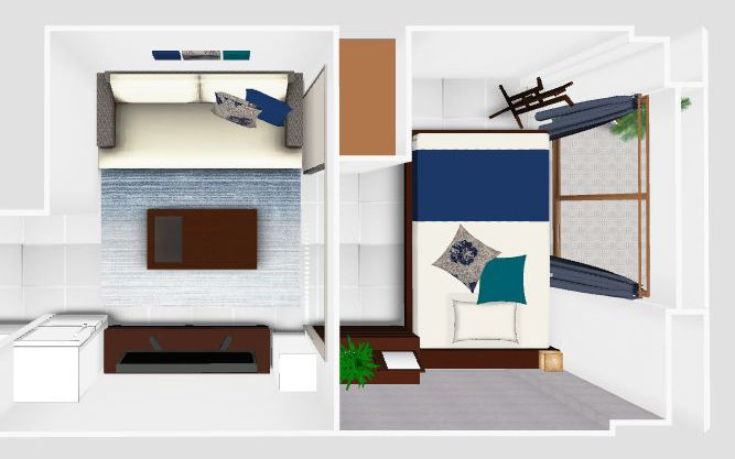 コンパクトな1DKでも寛げる2.5人掛けのソファが主役のレイアウトを組みました。また、ソファに座った時に目に入るローテーブルやテレビ台、リゾートっぽいカラーコーデにもこだわって、充実したDKに仕上げています。落ち着いたブルーとハイビスカス柄でまとめた配色が、男性らしいクールで魅力的な部屋です。