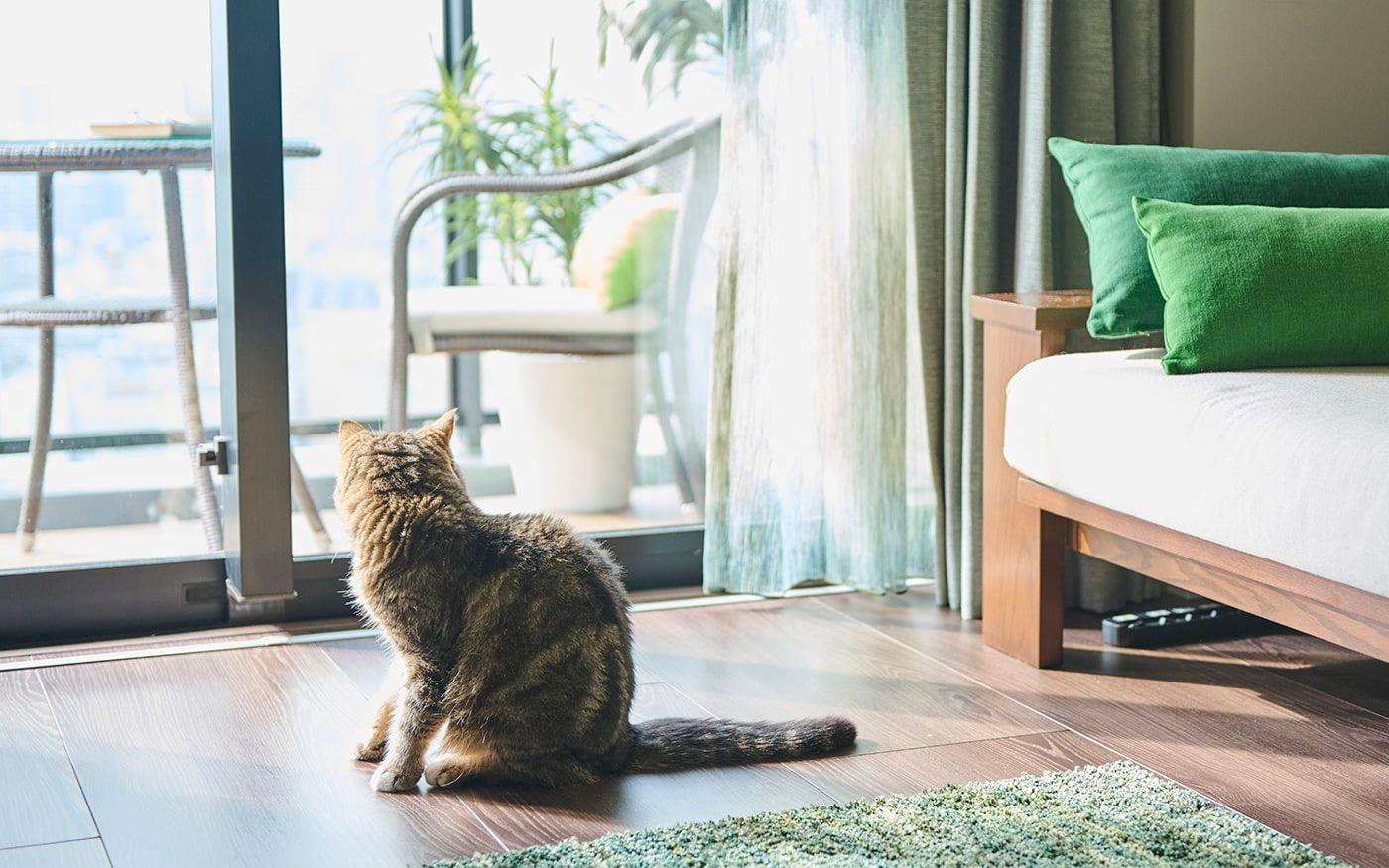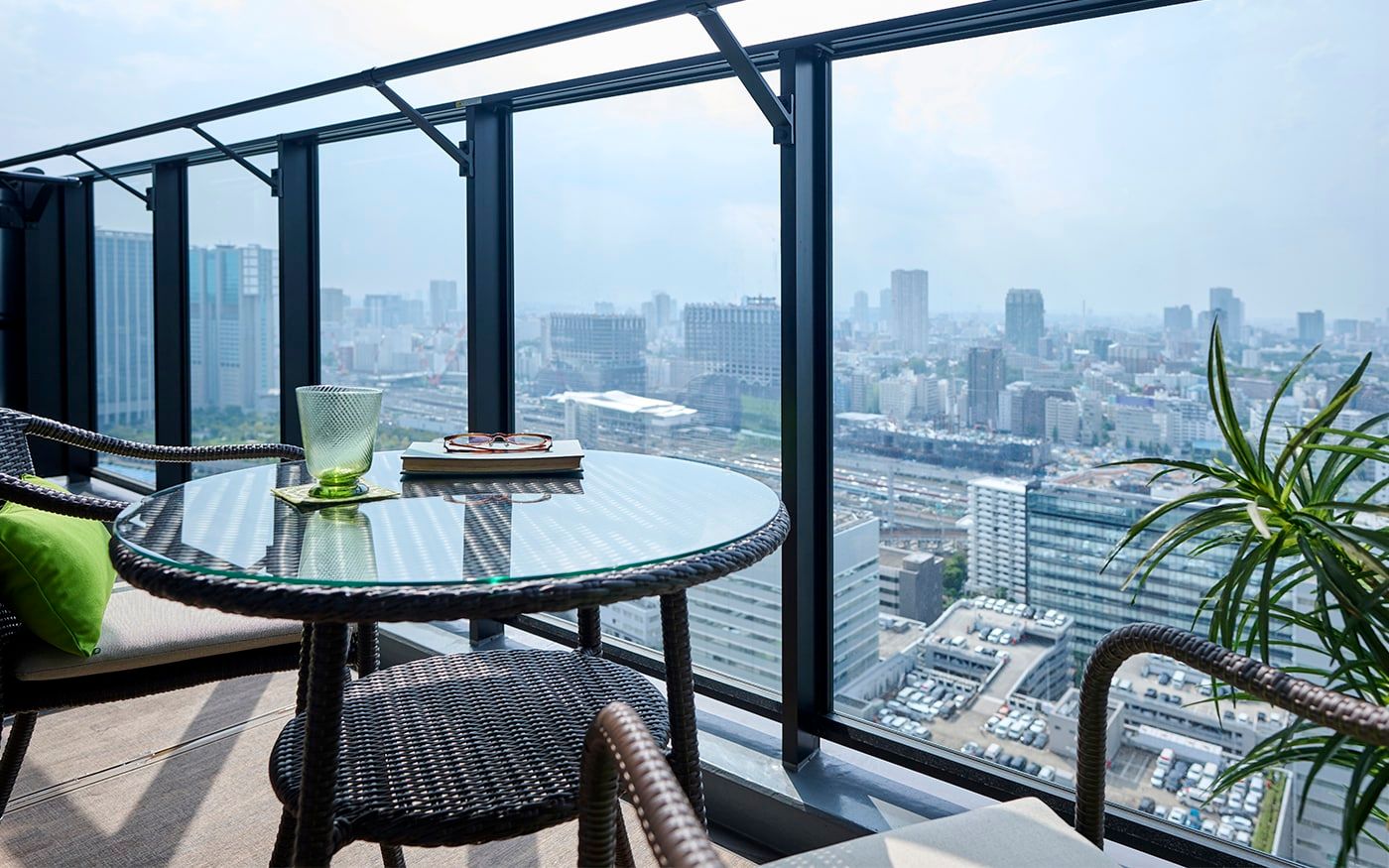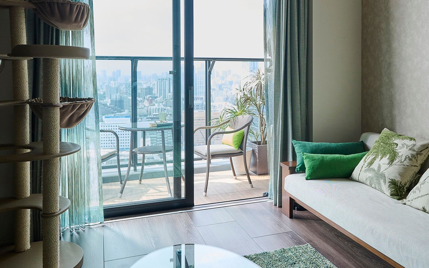 都会のロケーションが広がるタワーマンションからの眺望。バルコニーには景色を邪魔せず、しまいやすい屋外用家具を設置。オフの日に屋外での暮らしを楽しんだり、猫ちゃんもキャットタワーに乗って屋外の景色を堪能できる贅沢空間です。