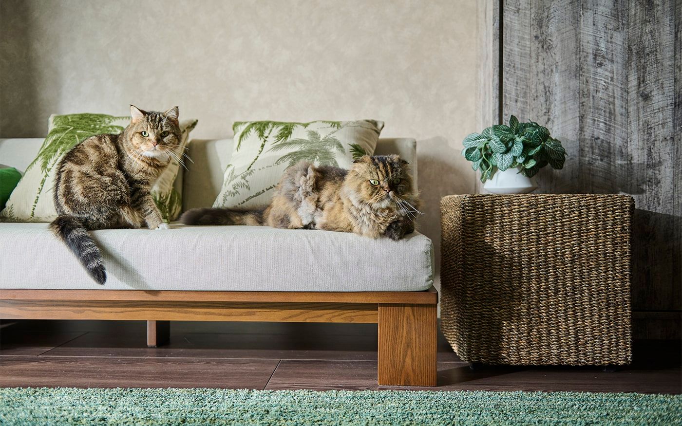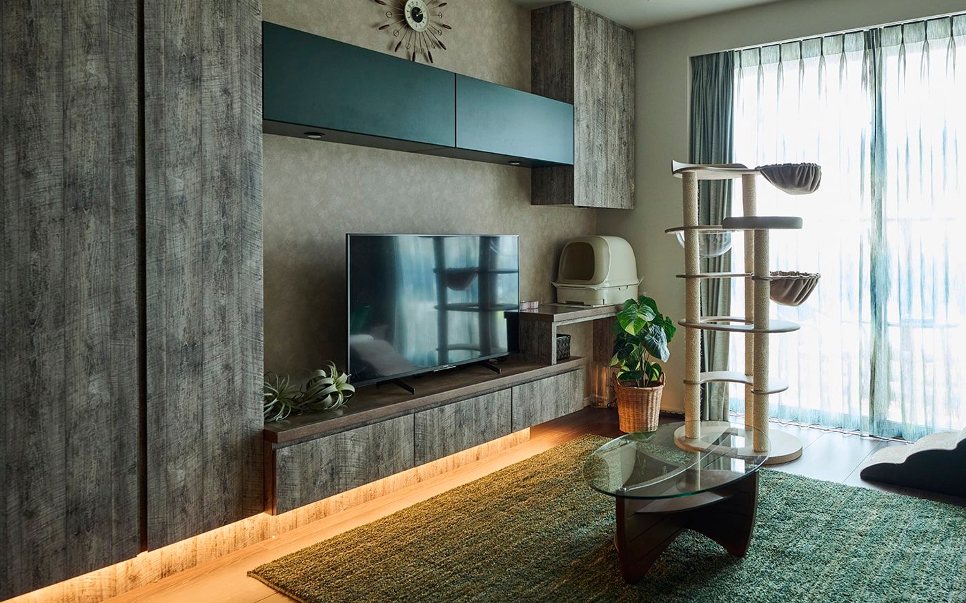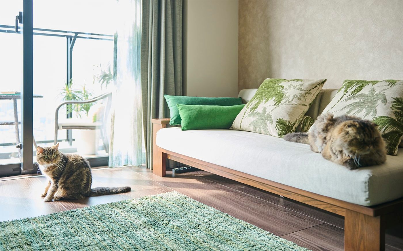 可愛い2匹の猫ちゃんも寛げるロースタイルの暮らしを採用。ローソファを選ばれたことで、猫ちゃんたちもソファ上で快適に寛げます。テーブルを避ければ、広めの正方形ラグの上でお客様も一緒にごろごろしながら、床座の暮らしも楽しめる空間です。