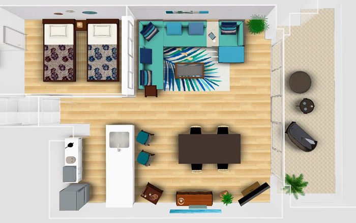 雄大な海を思わせるリビングには、広々としたコーナーソファがあり、南国ムード溢れるヒヤシンスが大人の雰囲気を演出します。選び抜かれたハワイアンブルーのインテリアが、開放的な空間をさらに引き立てています。