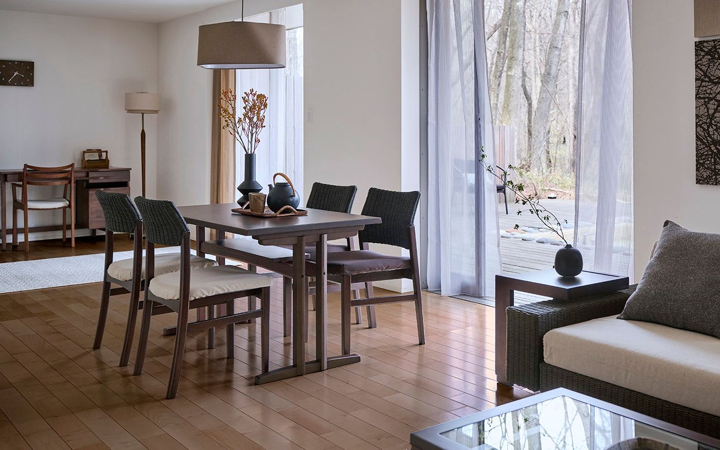ソファとお揃いの素材で統一したローダイニングセットを食卓の中心に。デザインが違う二つのダイニングチェアには、異なる色合いのチェアカバーを添えて、ブラウンのバイカラーでセンスあるスペースを演出しました。
