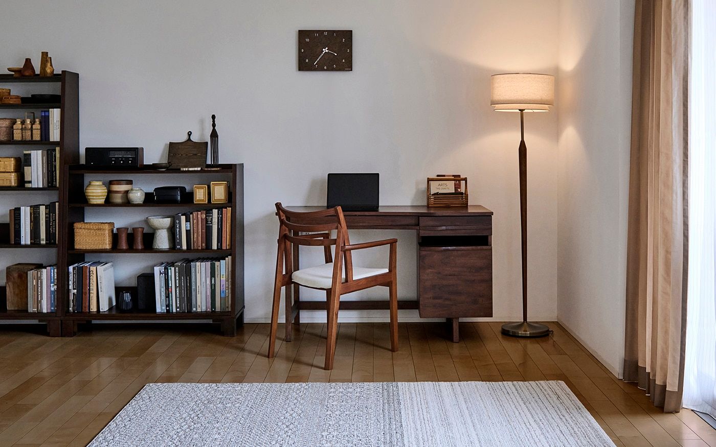 ライトブラウンの床色に馴染む、無垢材ワークデスクを取り入れた書斎です。本棚はダークブラウンのスタイリッシュなデザインで、モダンな印象をプラス。照明や銅製の壁掛け時計をアクセントに取り入れて、おしゃれに演出。