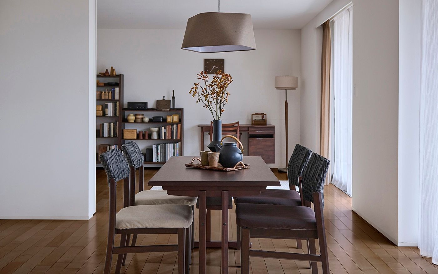 ソファとお揃いの素材で統一したローダイニングセットを食卓の中心に。デザインが違う二つのダイニングチェアには、異なる色合いのチェアカバーを添えて、ブラウンのバイカラーでセンスあるスペースを演出しました。