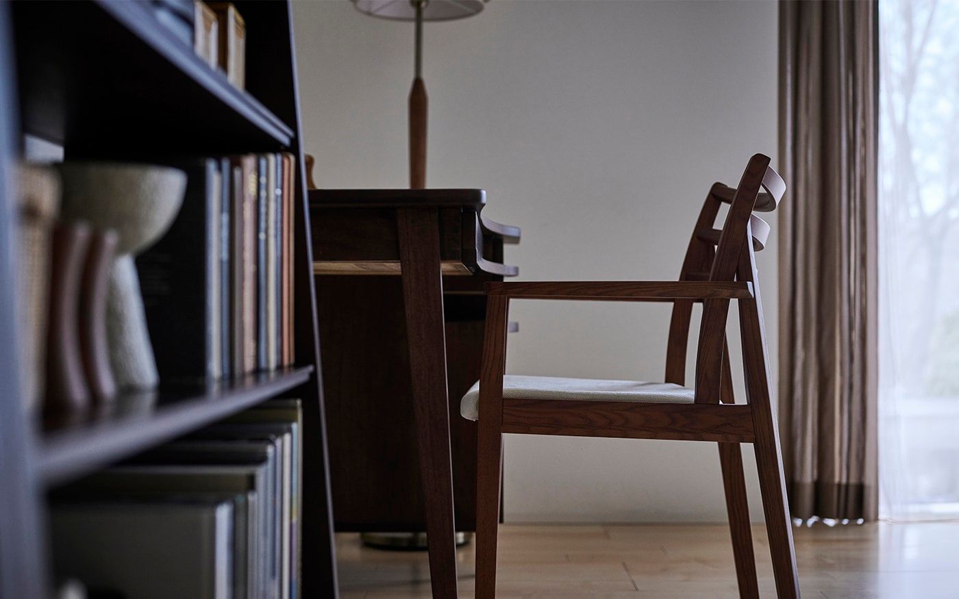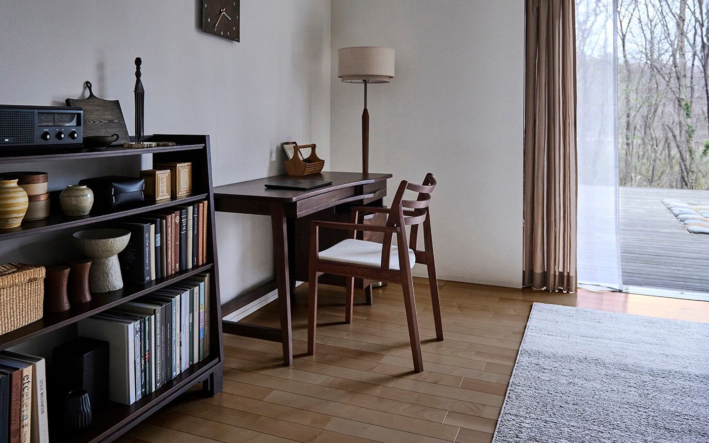 ライトブラウンの床色に馴染む、無垢材ワークデスクを取り入れた書斎です。本棚はダークブラウンのスタイリッシュなデザインで、モダンな印象をプラス。照明や銅製の壁掛け時計をアクセントに取り入れて、おしゃれに演出。