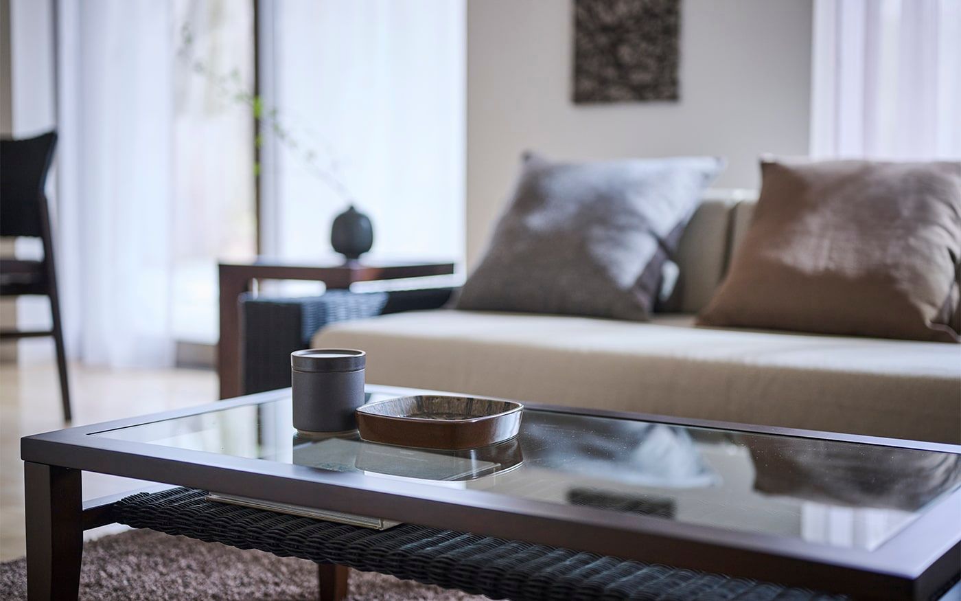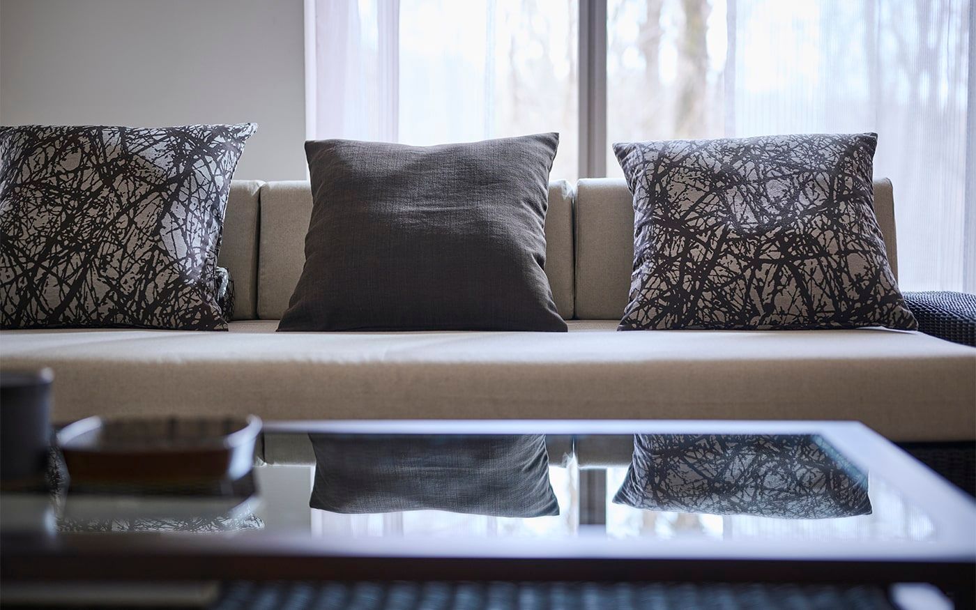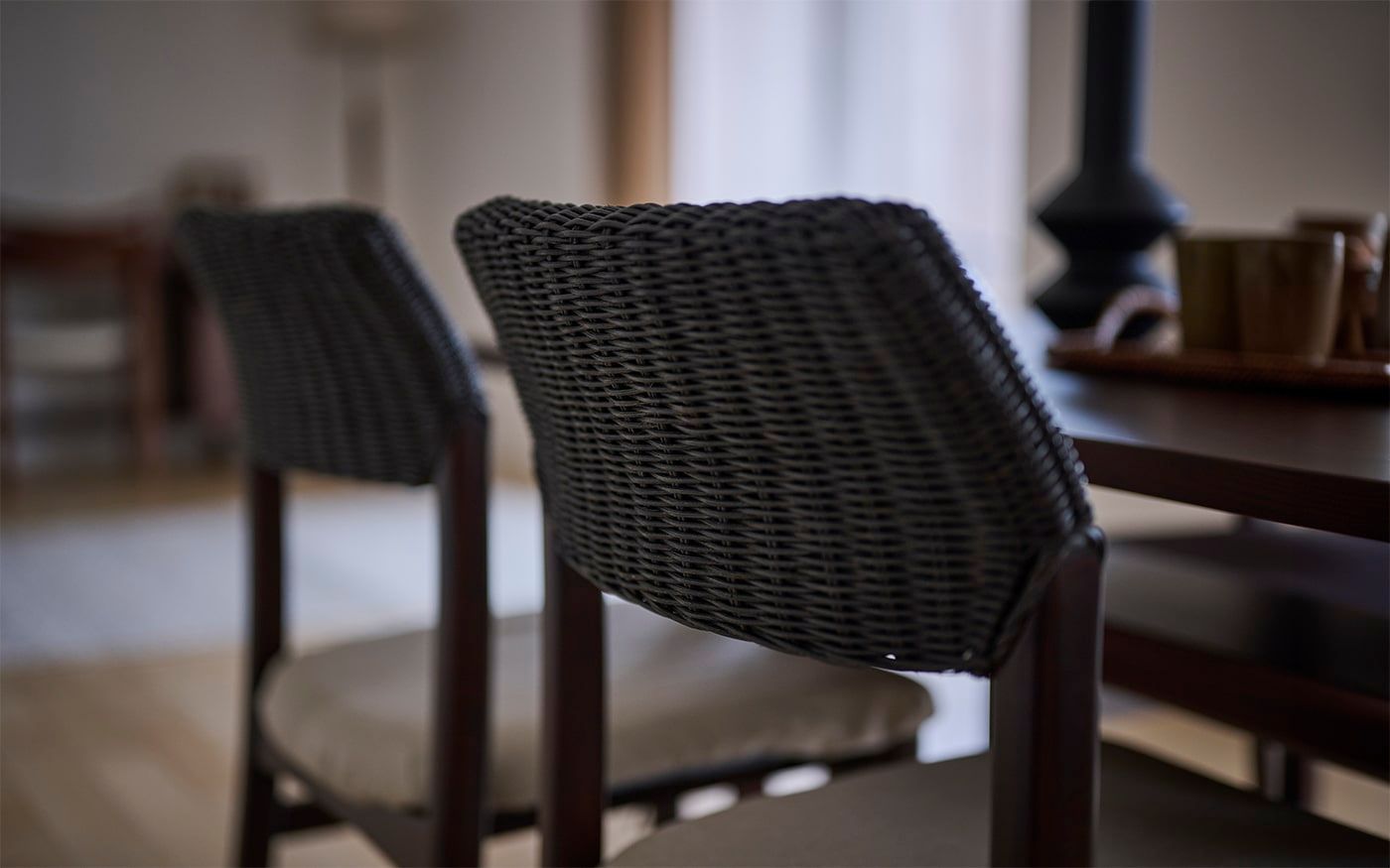 開放的なラタンのローソファやラウンジチェア、ローテーブルが主役のリビング。マテリアル感のあるブラウンのクッションカバーや、木の枝をモチーフにしたファブリックパネルが魅力的な空間です。