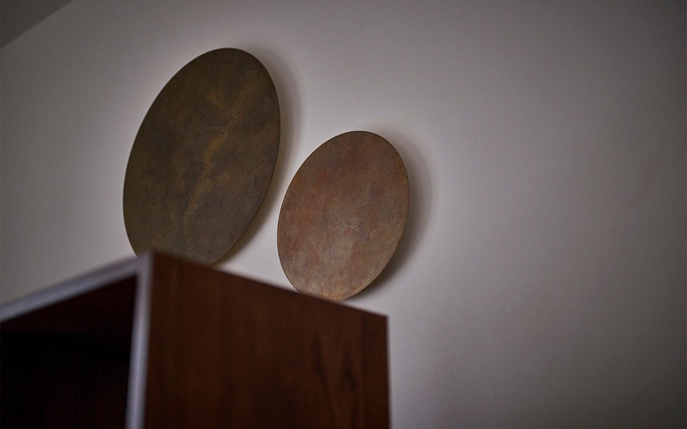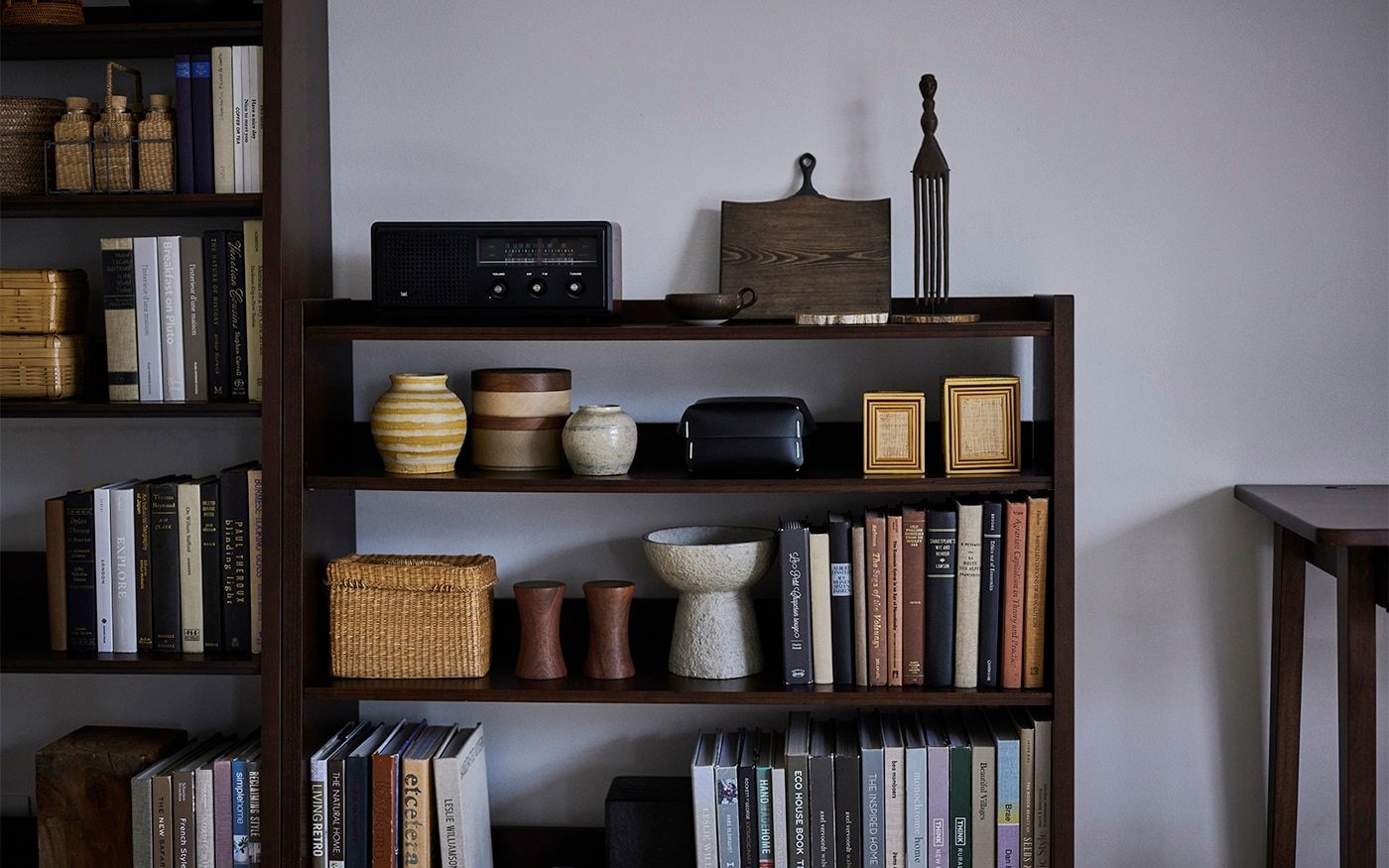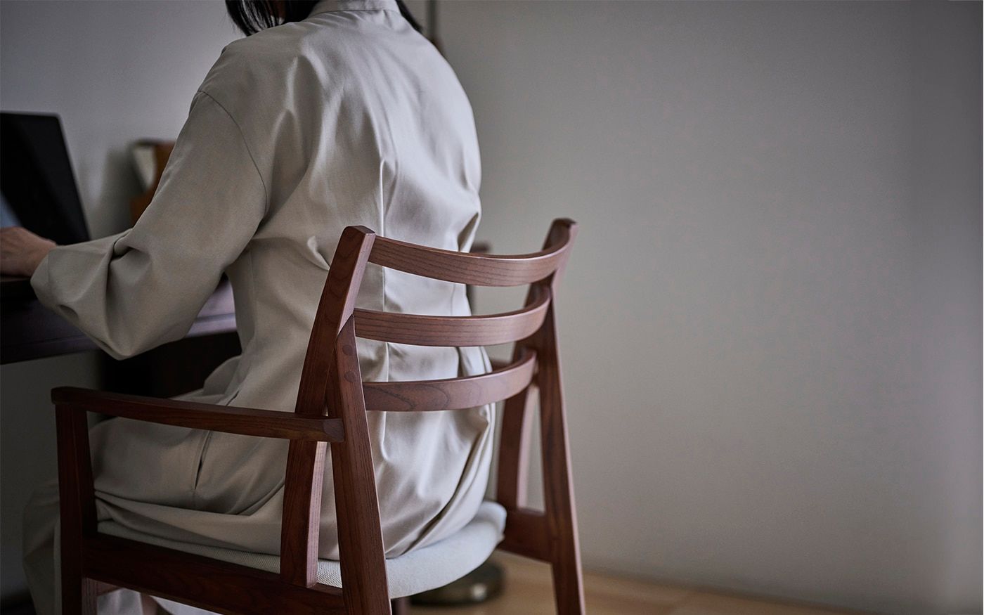 無垢材のユニット収納をランダムに組んだ、木の風合いを楽しめるセカンドリビング。おしゃなブラウンのインテリアや円形アートを眺めながら、おしゃれなラウンジチェアでゆったり過ごせるスペースを設けています。