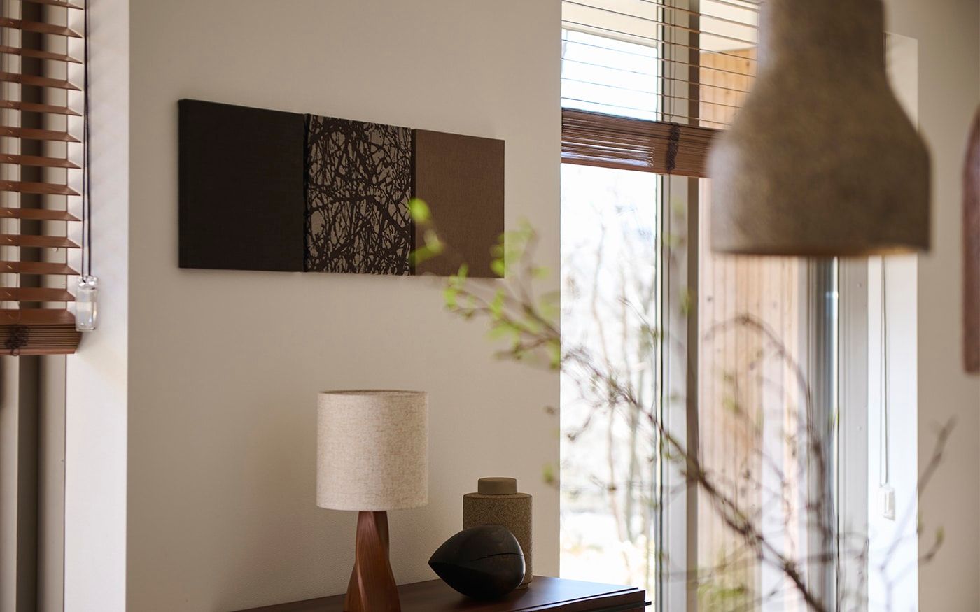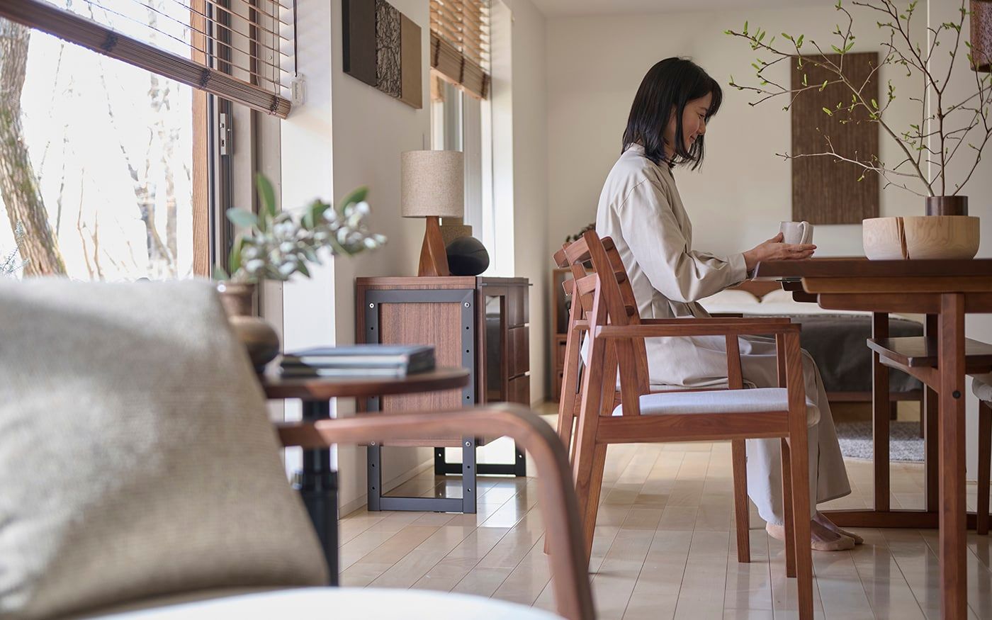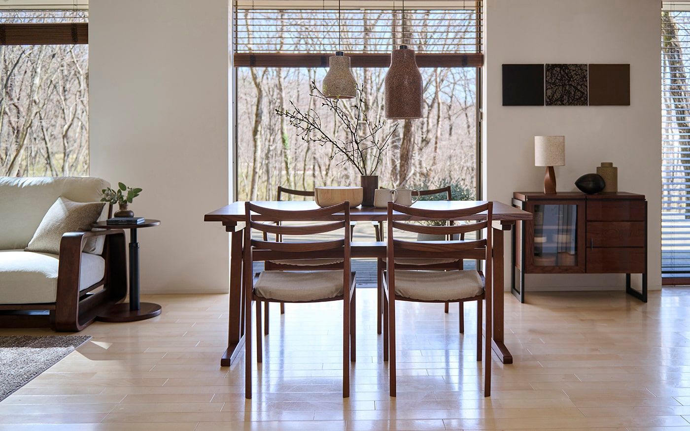 優しいブラウンカラーで統一したダイニングスペース。木々の木目を楽しめる無垢材ダイニングテーブルを設置した食卓には、余計な色を使わずシンプルにブラウン単色でまとめました。素材感のあるペンダントライトや、枝柄の壁面装飾をさりげなくアクセントに。